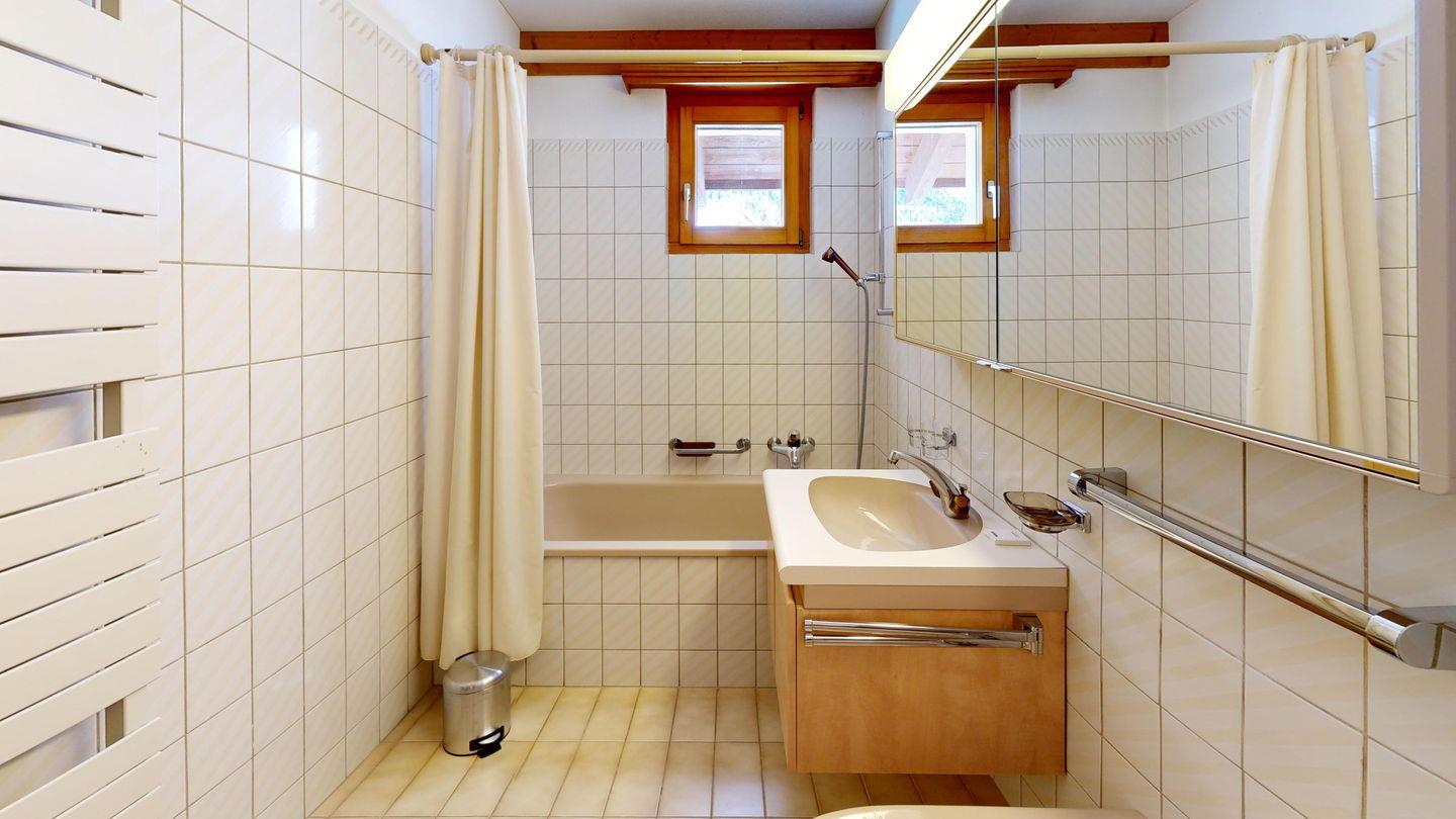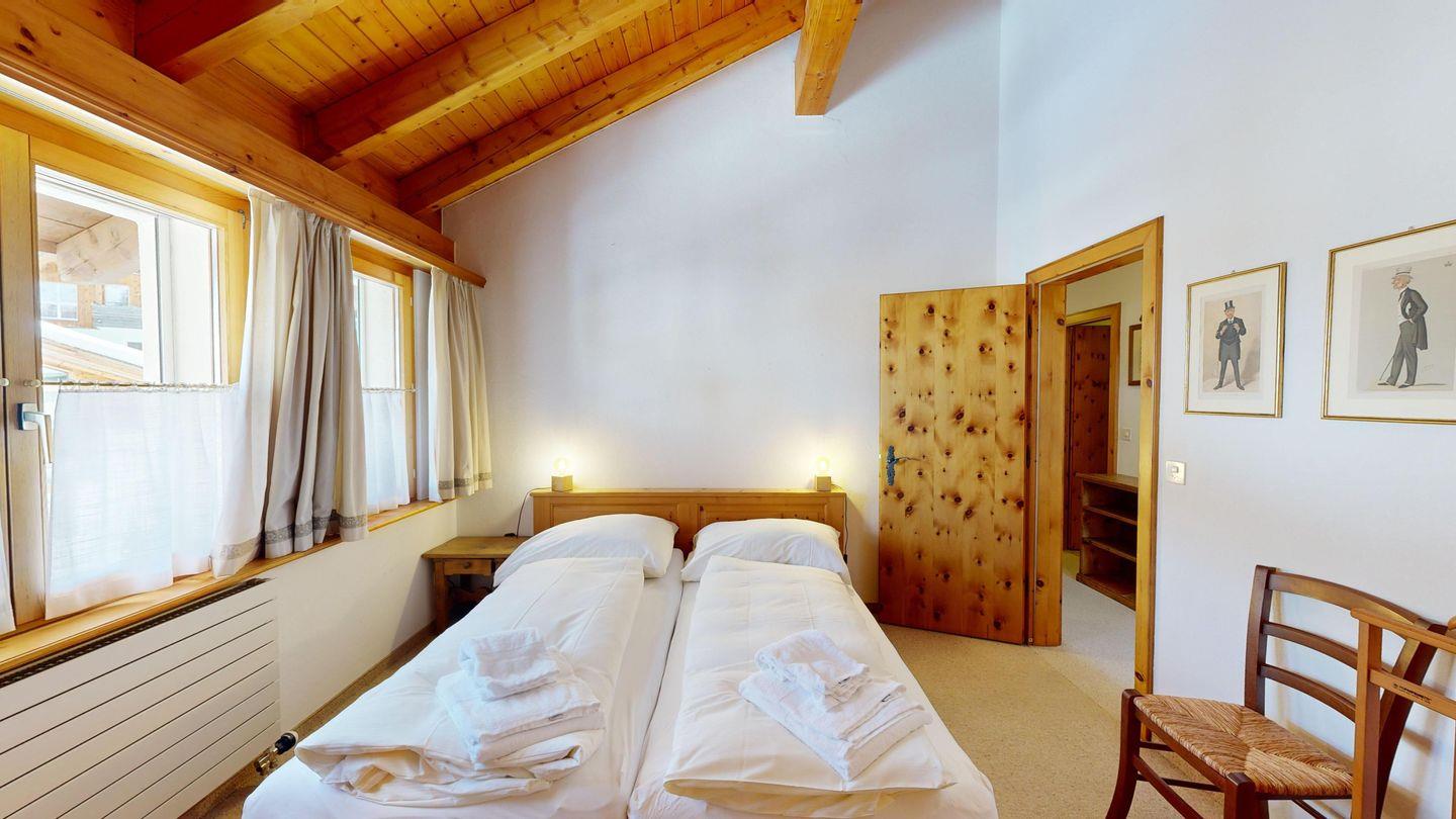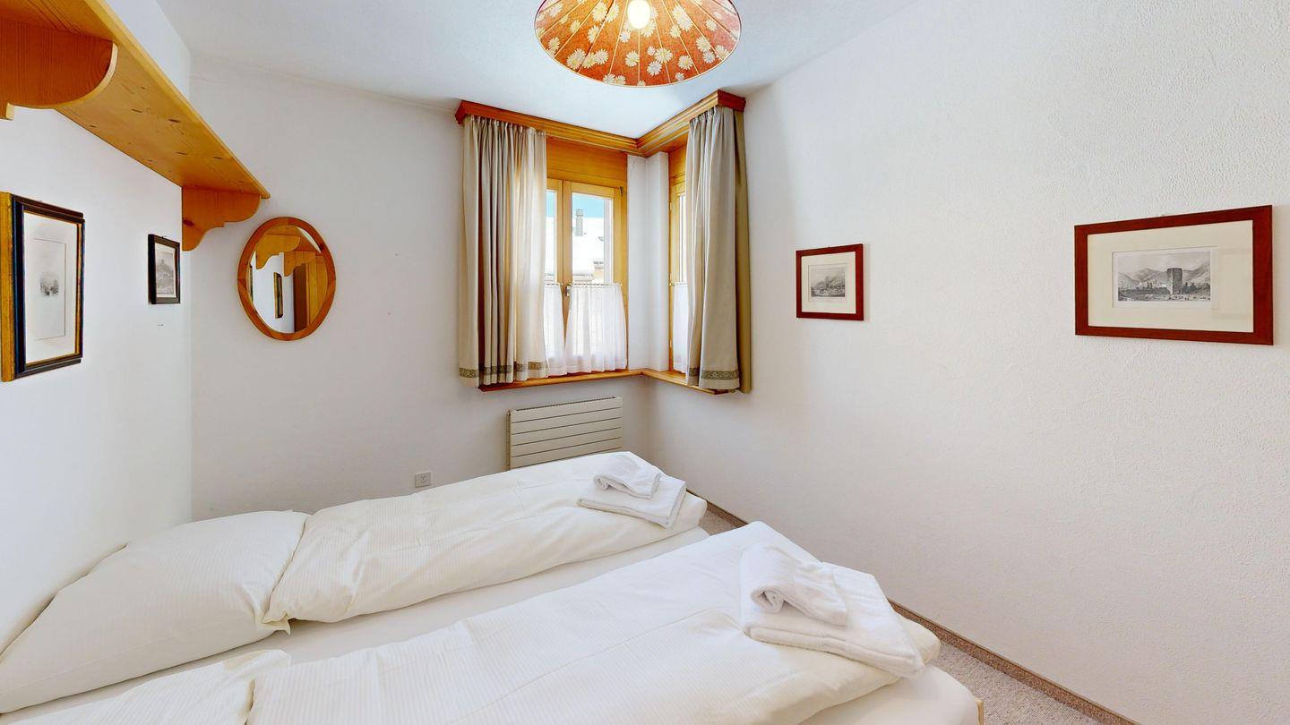 Der Eingangsbereich führt direkt zu den beiden Schlafzimmern und den zwei Badezimmern. Das grosse Schlafzimmer ist mit einem Doppelbett und einem Arvenschrank ausgestattet, während das zweite Schlafzimmer über zwei Einzelbetten und einen kleineren Kleiderschrank verfügt. Die beiden Badezimmer sind funktional eingerichtet, eines mit Badewanne und Duschmöglichkeit, das andere mit einer Dusche.