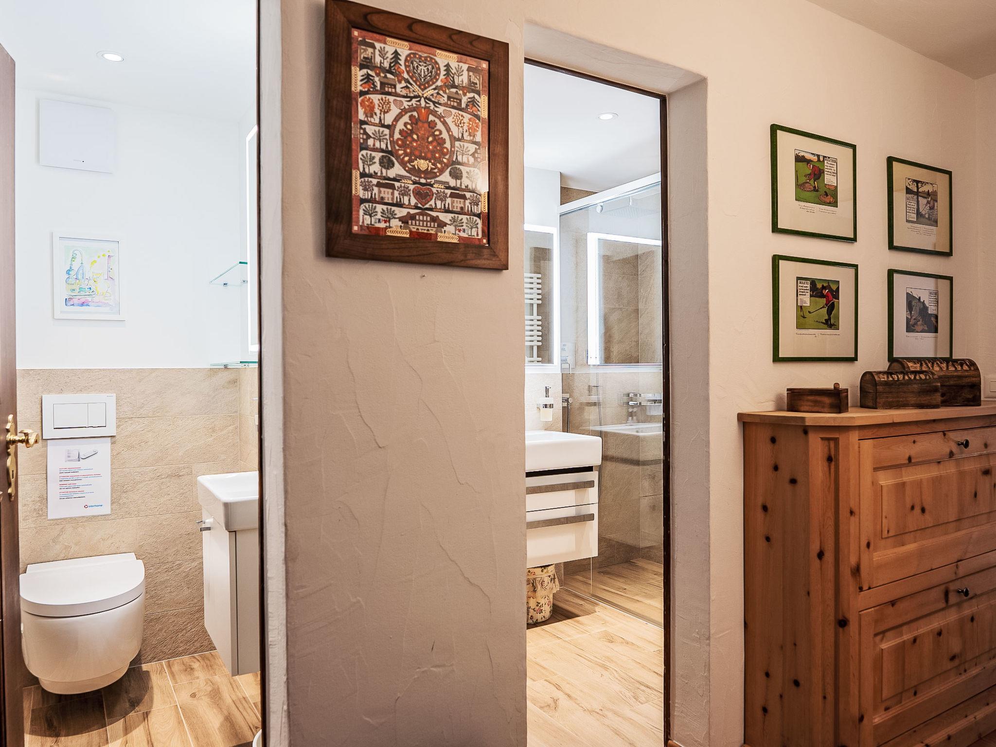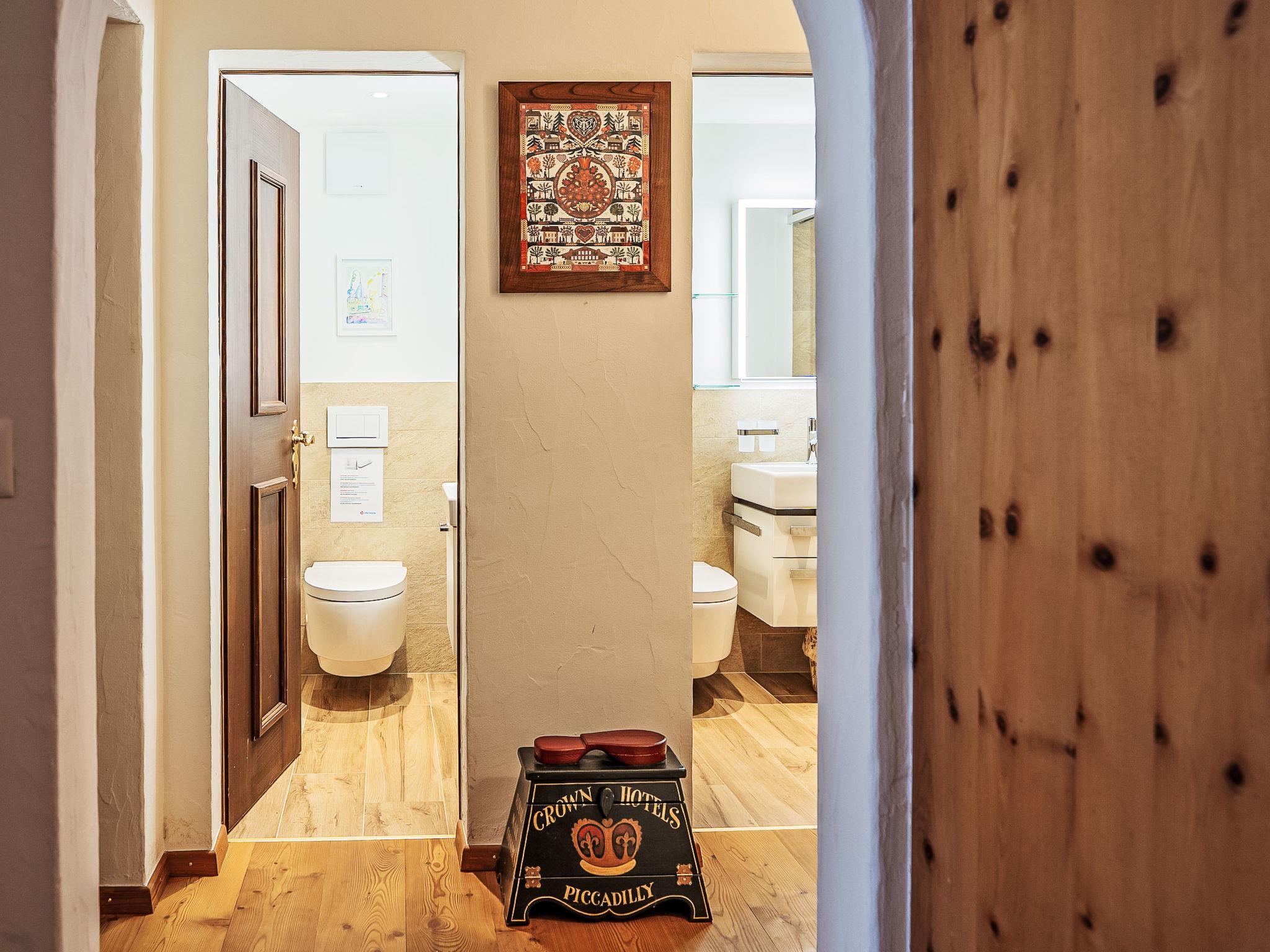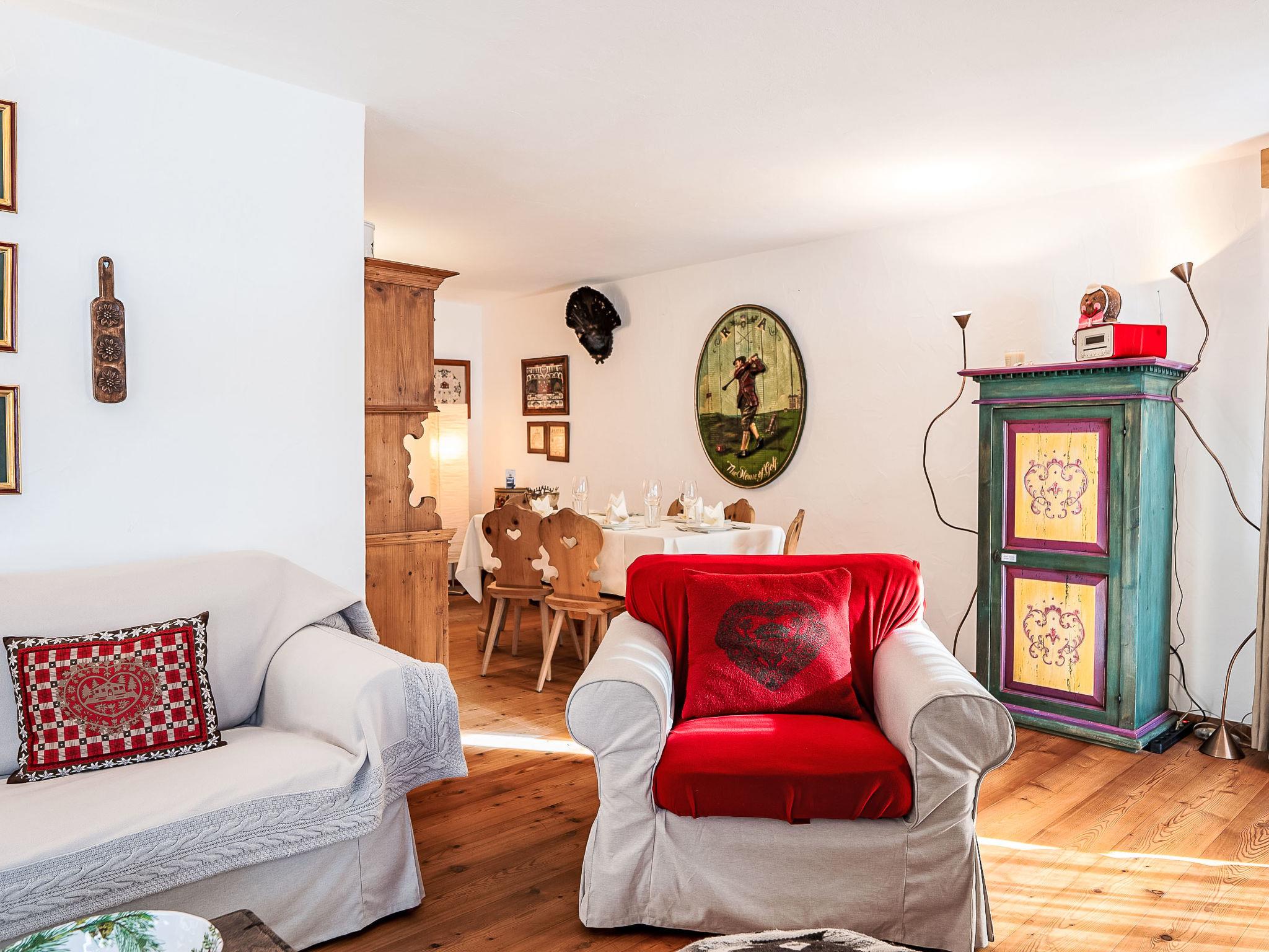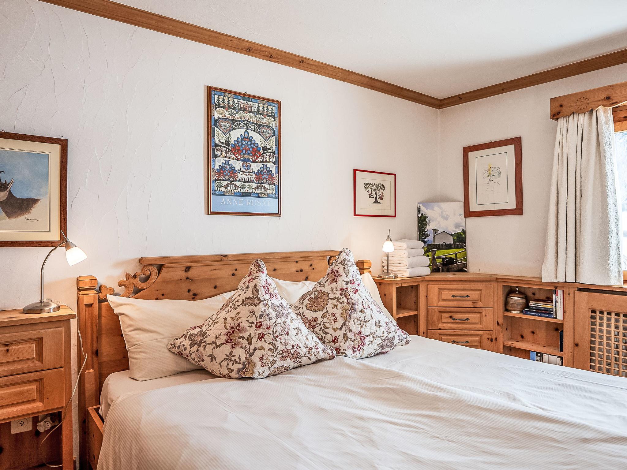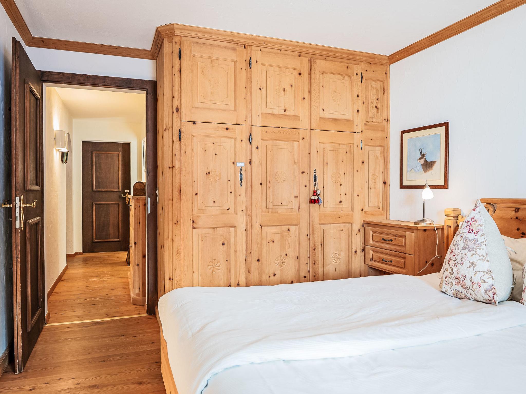 "Chesa Saira 2", 3-room apartment 90 m2, on the ground floor. Tasteful and wooden furniture furnishings: open living/dining room with dining table and TV (flat screen). Exit to the patio. 1 double bedroom with 1 double bed (2 x 90 cm, length 200 cm). 1 room with 1 bed (90 cm, length 190 cm), 1 x 2 bunk beds (90 cm, length 190 cm). Open kitchen (oven, dishwasher, 4 ceramic glass hob hotplates, toaster, kettle, electric coffee machine, Capsules for coffee machine (Nespresso) extra, raclette grill, fondue Set (cheese)). Shower/bidet/WC, sep. WC. Heating. Wooden floors. Patio. Terrace furniture, deck chairs (2). View of the mountains and the countryside. Facilities: iron, hair dryer. Extra. Garage space n 29 on the property (1 car), height 215 cm, width 220 cm. Please note: non-smokers only, non-smoking house. Maximum 2 small pets/ dogs allowed. No lift.