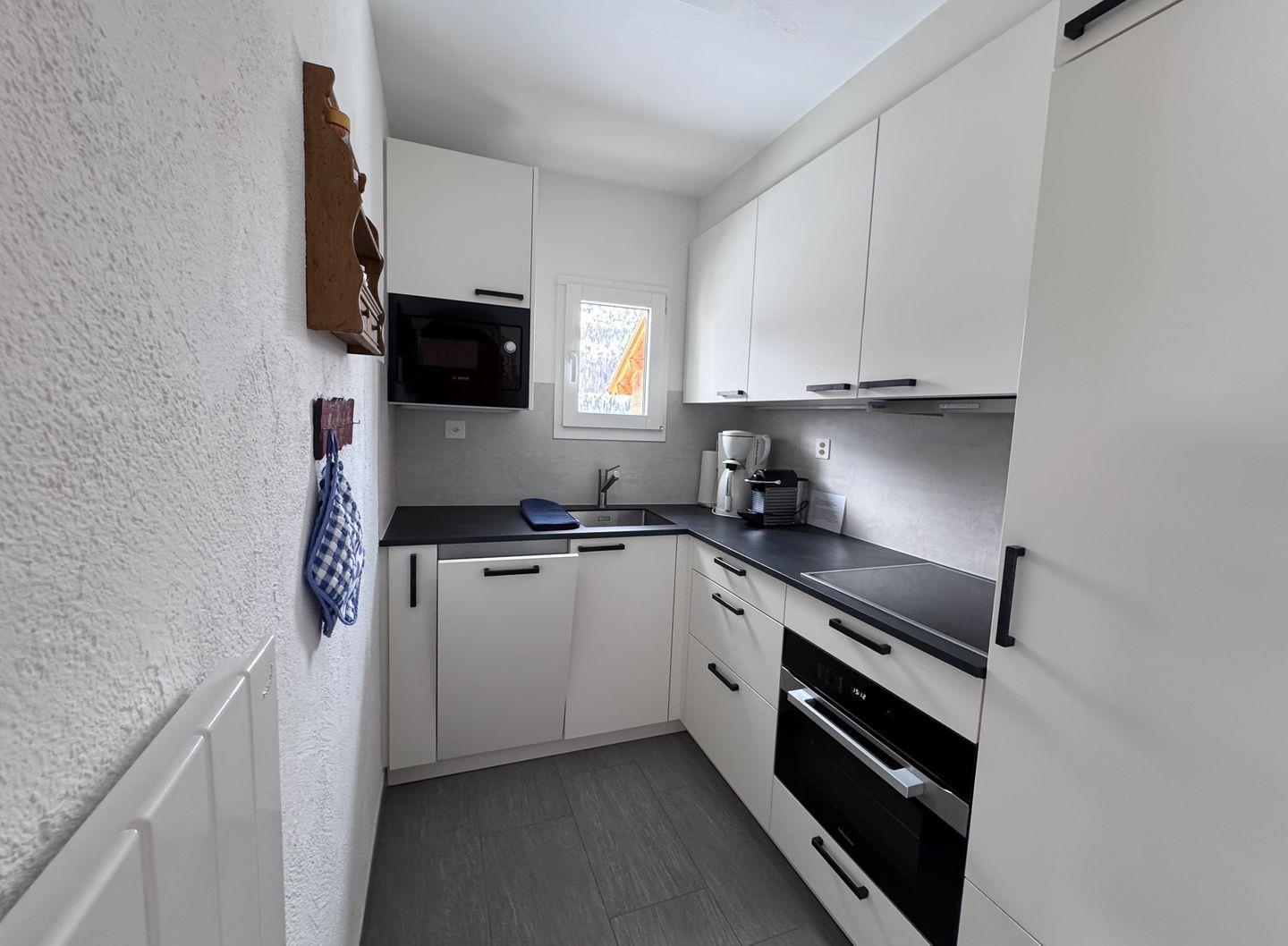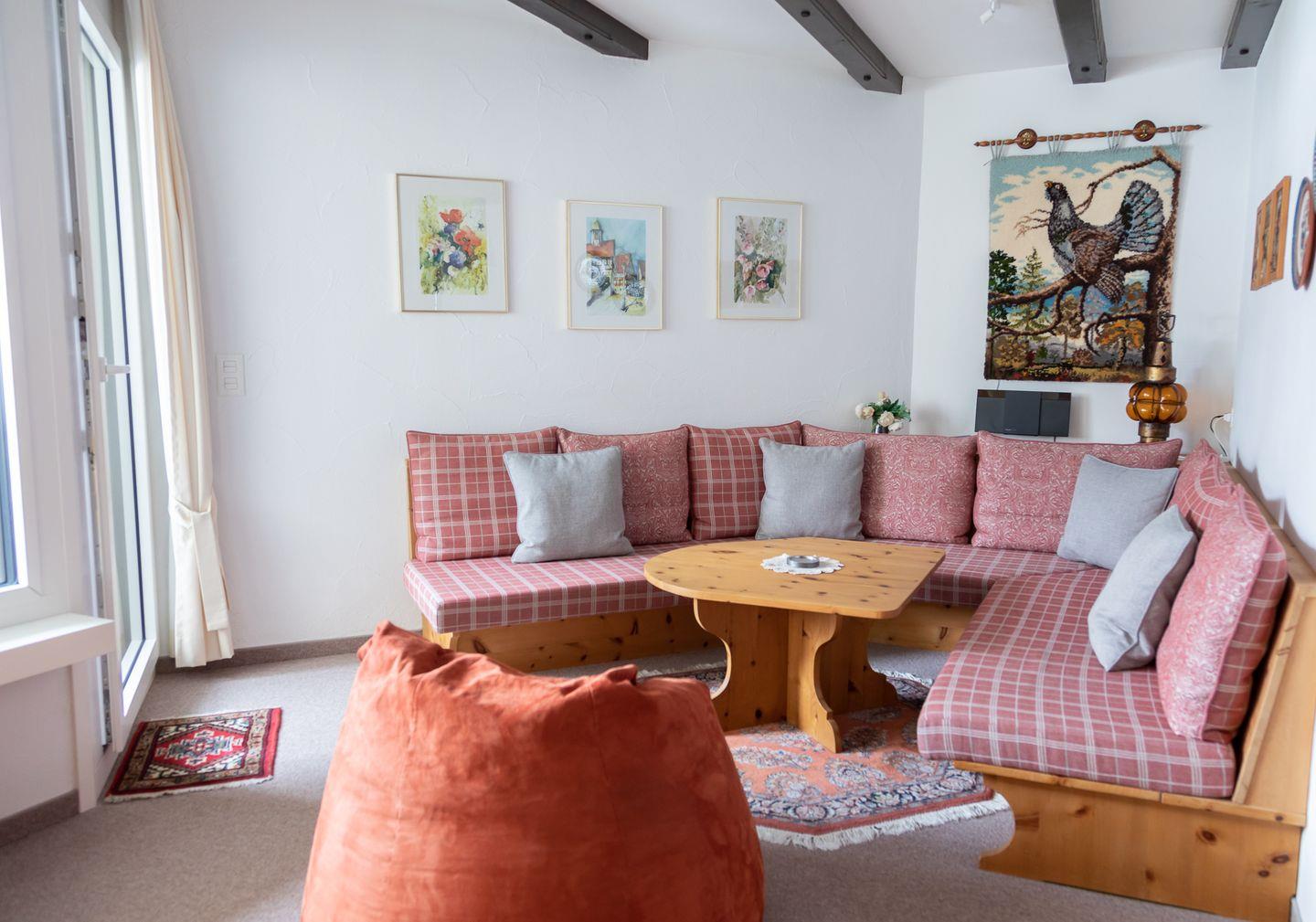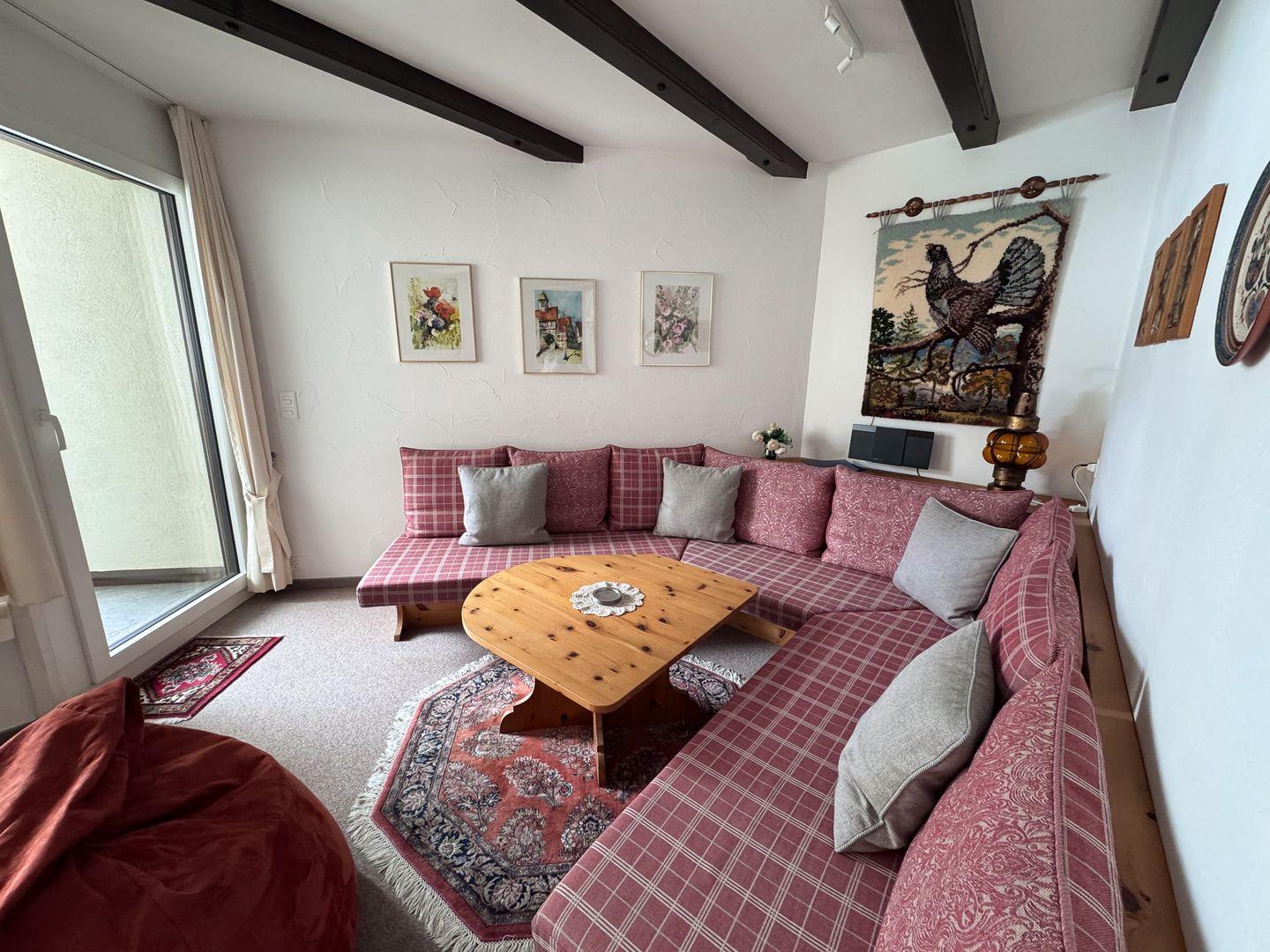 2½-Zimmerwohnung im 1. Stock. Wohnzimmer mit Essbereich, Balkon und TV. Schlafzimmer mit Doppelbett. Küche mit Herd, Ofen, Kühlschrank und Geschirrspüler. Badezimmer mit Dusche, WC und Lavabo. Ein Parkplatz in der Garage. Haustiere sind nicht erlaubt. Gemeinschaftliche Waschküche. Nichtraucherwohnung.