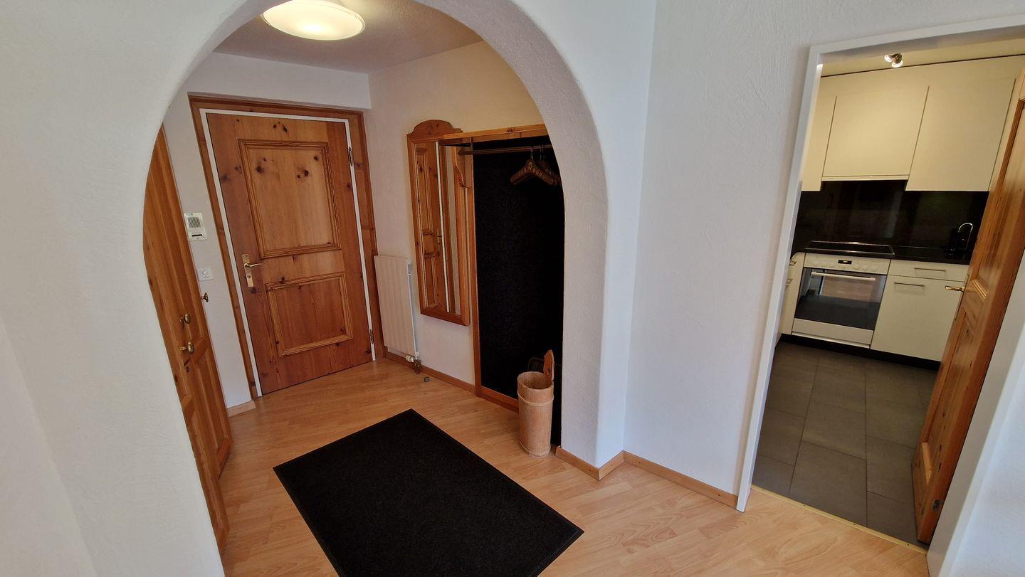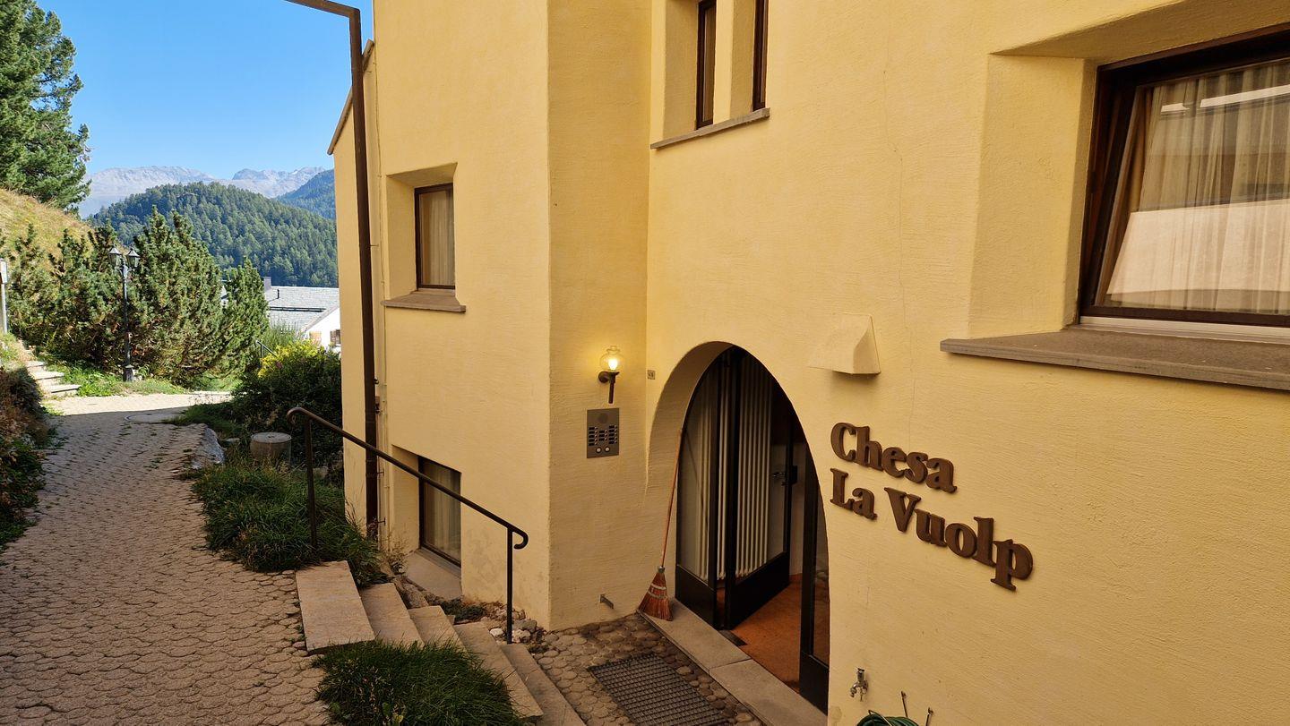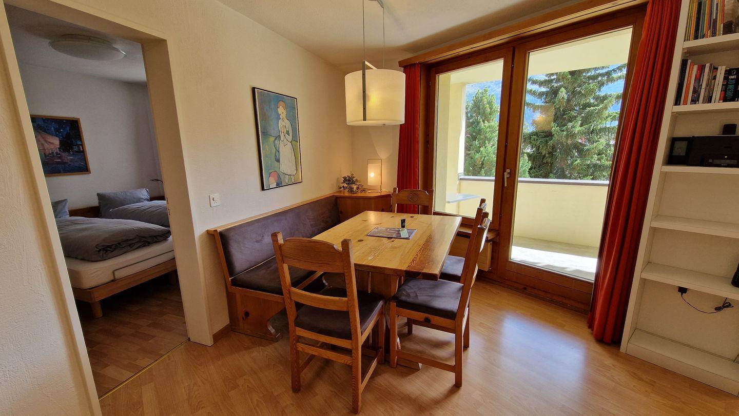 2 1/2-Zimmerwohnung im Haus la Vuolp, 1. Stock, 77 m2. Die nach Süden ausgelegte Wohnung verfügt über ein gemütliches und geräumiges Wohn-/Esszimmer mit zwei Schrankbetten (90x200) und grossem Fernseher, ein helles Schlafzimmer mit Doppelbett, ein Bad/WC, eine gut ausgestattete Küche mit Backofen, Geschirrspüler, Nesspresso-Kapselmaschine, Toaster und Wasserkocher und einen gedeckter, ruhigen Balkon. Nichtraucherwohnung.