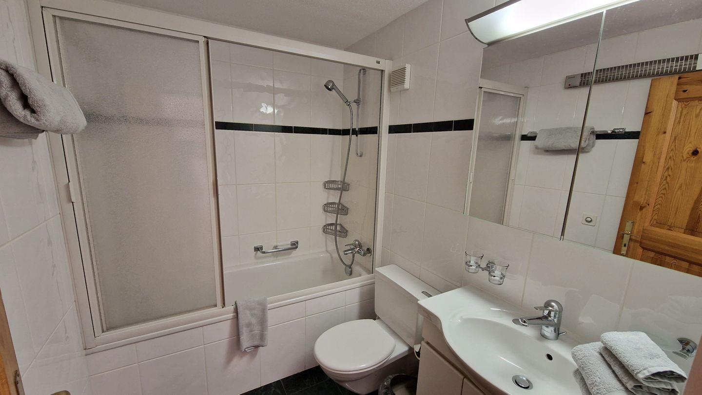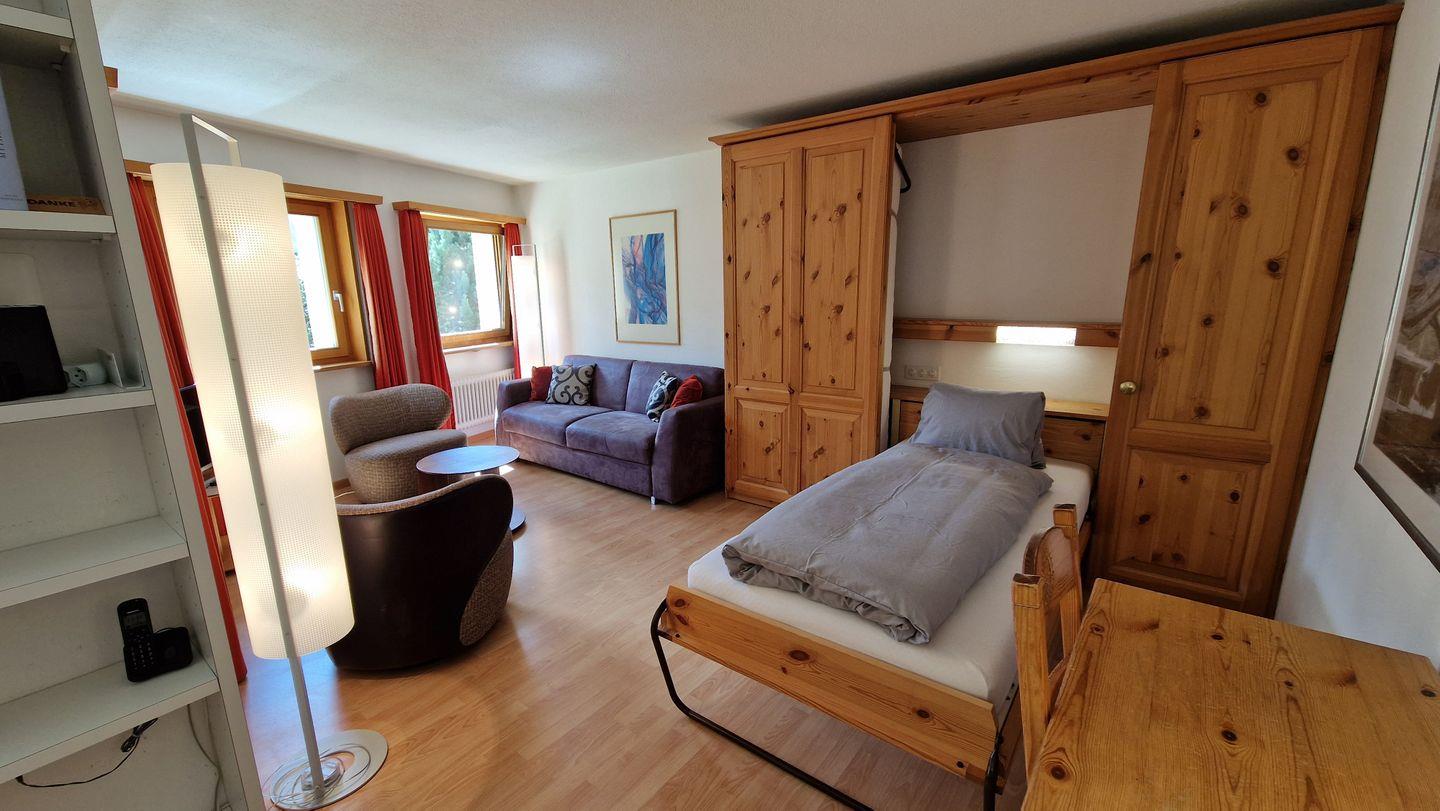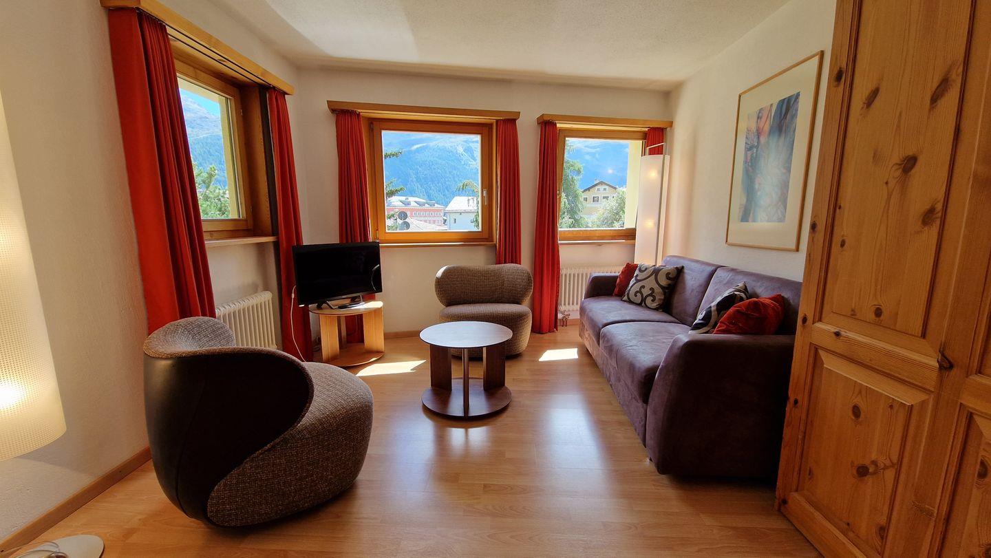 2 1/2-Zimmerwohnung im Haus la Vuolp, 1. Stock, 77 m2. Die nach Süden ausgelegte Wohnung verfügt über ein gemütliches und geräumiges Wohn-/Esszimmer mit zwei Schrankbetten (90x200) und grossem Fernseher, ein helles Schlafzimmer mit Doppelbett, ein Bad/WC, eine gut ausgestattete Küche mit Backofen, Geschirrspüler, Nesspresso-Kapselmaschine, Toaster und Wasserkocher und einen gedeckter, ruhigen Balkon. Nichtraucherwohnung.