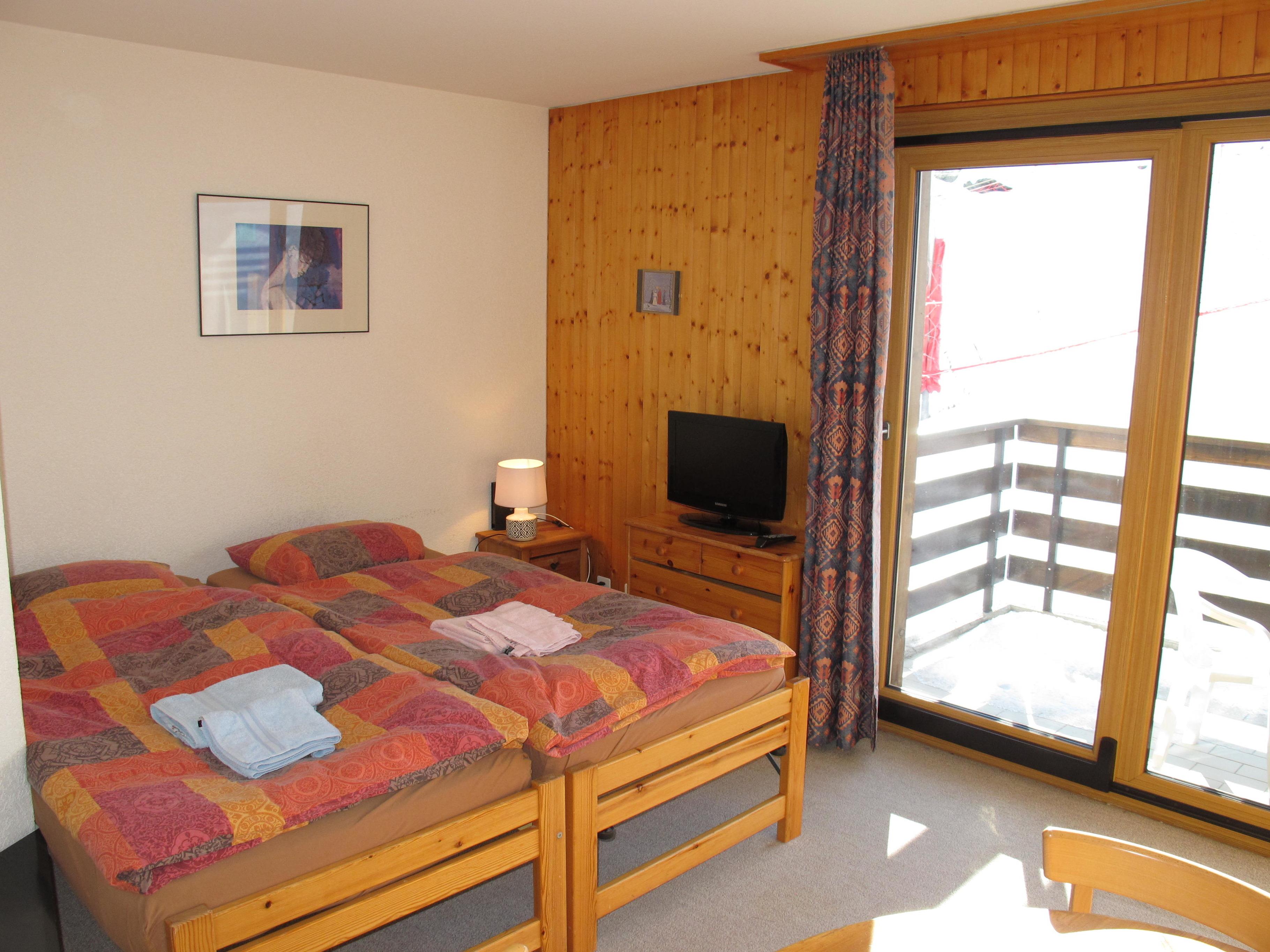 Gut ausgestattete 1,5-Zimmer-Wohnung, 1. Etage (Aufzug), ca. 33 m². Wohn-/Schlafraum mit 2 Einzelbetten, Essplatz und Küchenzeile mit 2 Platten, Mikrowelle, Kühlschrank, Kaffeemaschine, Wasserkocher, Fondue-Rechaud, Raclette-Gerät. Bad/WC. Balkon mit Mobiliar und Blick auf Piste. Im Eingangsbereich/Flur ein Etagenbett, räumlich mit Vorhang zum Wohnraum abteilbar.