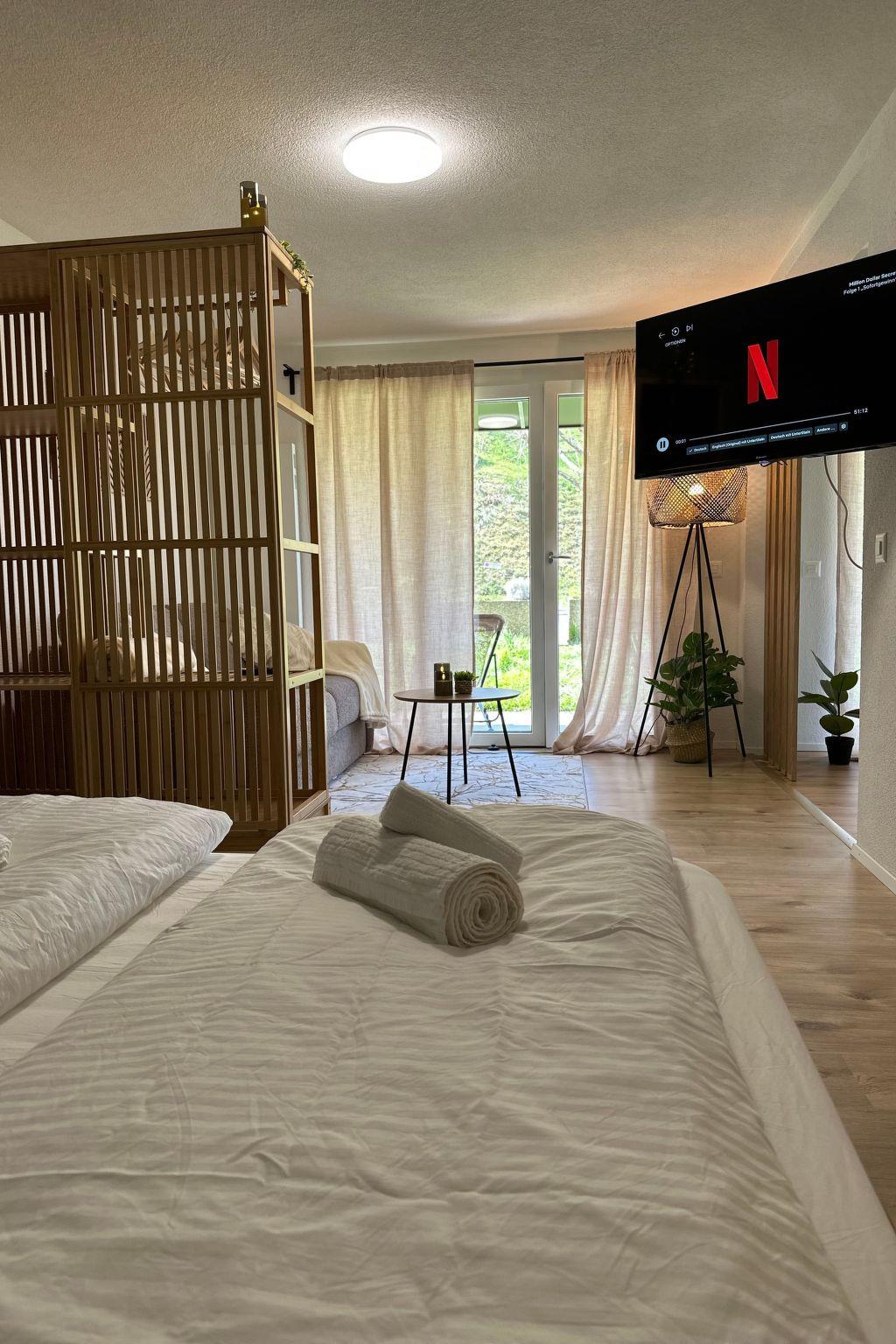 The location in Spiez is ideal for anyone who appreciates being close to nature as well as a wide range of leisure activities. Just a 3-minute walk from the lake, this holiday flat offers the perfect base for water sports, hiking and cycling tours. The proximity to Interlaken (20 minutes) and Thun (10 minutes) also opens up great opportunities for excursions and shopping trips. Public transport is only a 2-minute walk away, making exploring the surrounding area a breeze.