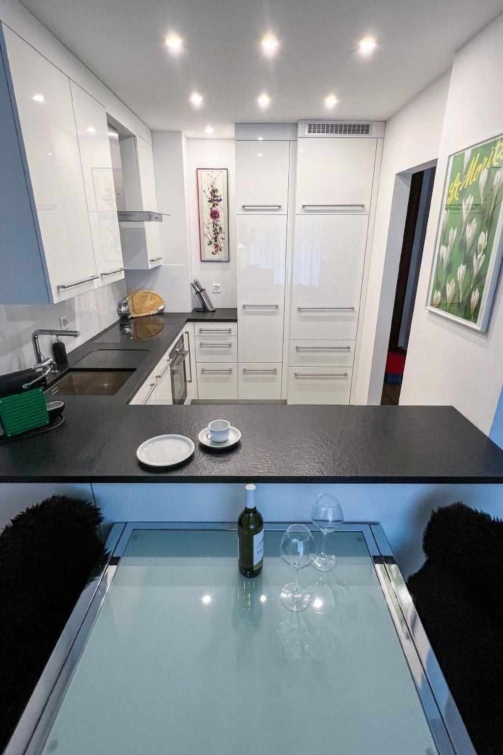 Our spacious apartment Chesa Derby 47 is located on the fourth, top floor of the Chesa Derby with a large south-facing balcony. The apartment is accessible barrier-free by elevator from the underground garage. The apartment is newly renovated in 2016 and equipped with a modern, new designer kitchen, granite countertop, stove with ceramic hob, extractor fan to the outside, oven, microwave, dishwasher, coffee maker, NESPRESSO machine, toaster, fondue set, etc.