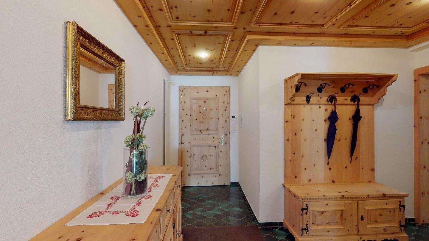 Geräumige mit gut riechendem Arvenholz ausgebaute 5-Zimmer Ferienwohnung im 1. Obergeschoss. Eingang mit generöser Garderobe und Gäste/WC. Wohnbereich mit Balkon Richtung Süden. Grosszügige Küche mit entsprechender Durchreiche ins Wohnzimmer. Elternschlafzimmer aus Arve. 1 Doppelschlafzimmer. 1 Bad/Dusche. 1 Schlafzimmer mit Etagenbetten und Dusche. 1 Einzelzimmer. Lift. Waschküche. 1 Garagenparkplatz im Parkhaus "Quadrellas" 4 Gehminuten entfernt von der Wohnung inklusive. Weitere Parkplätze gegen Gebühr möglich.