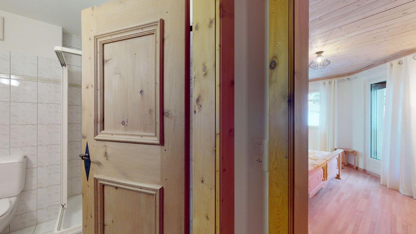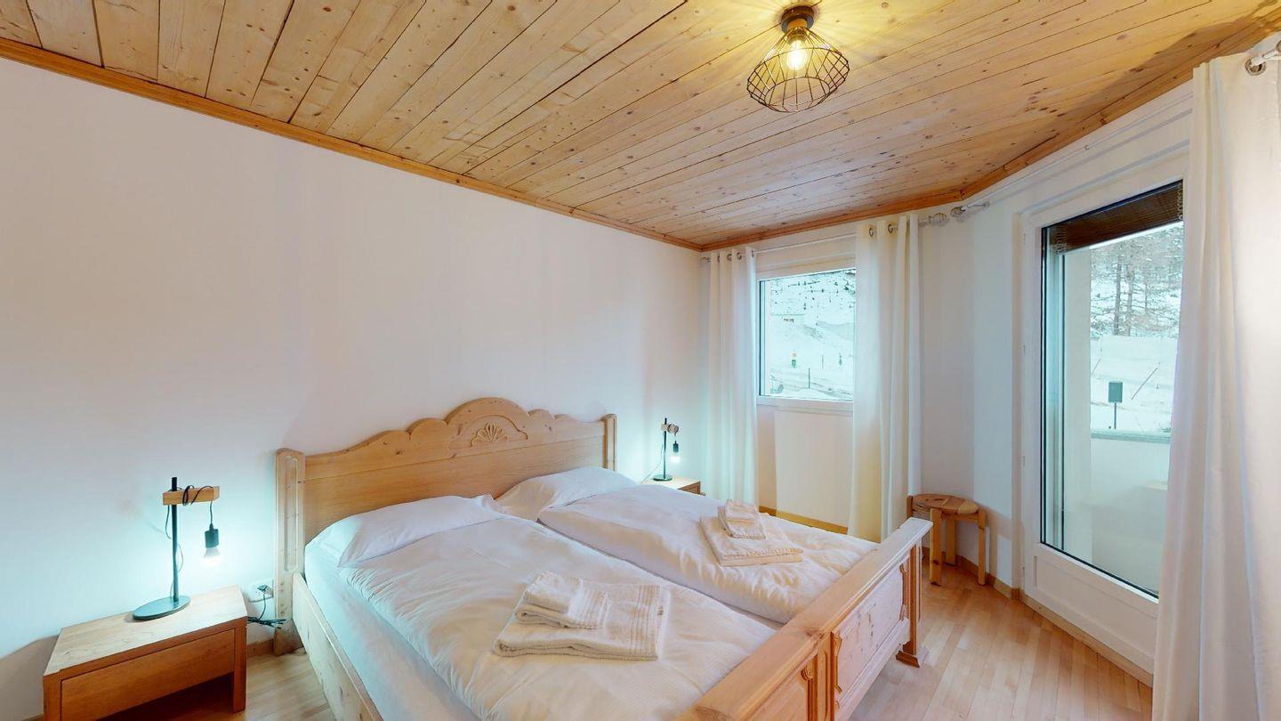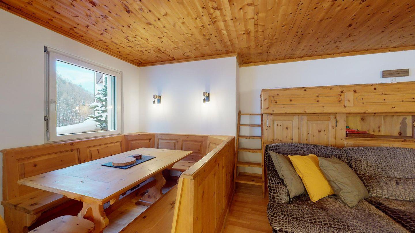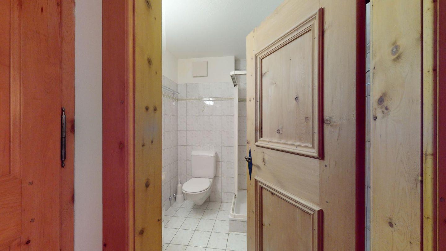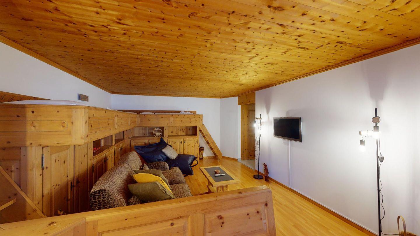 2 ½ Zimmerwohnung im 1. Obergeschoss. Entrée mit Garderobe. Wohn-/Esszimmer mit 3 eingebauten Hochbetten und Ausgang auf den Balkon. Geschlossene Küche mit Ausgang auf den Balkon. Ein Doppelschlafzimmer mit Ausgang auf den Balkon. Dusche/WC/Lavabo. Garagenplatz. Gemeinschaftliche Waschküche.