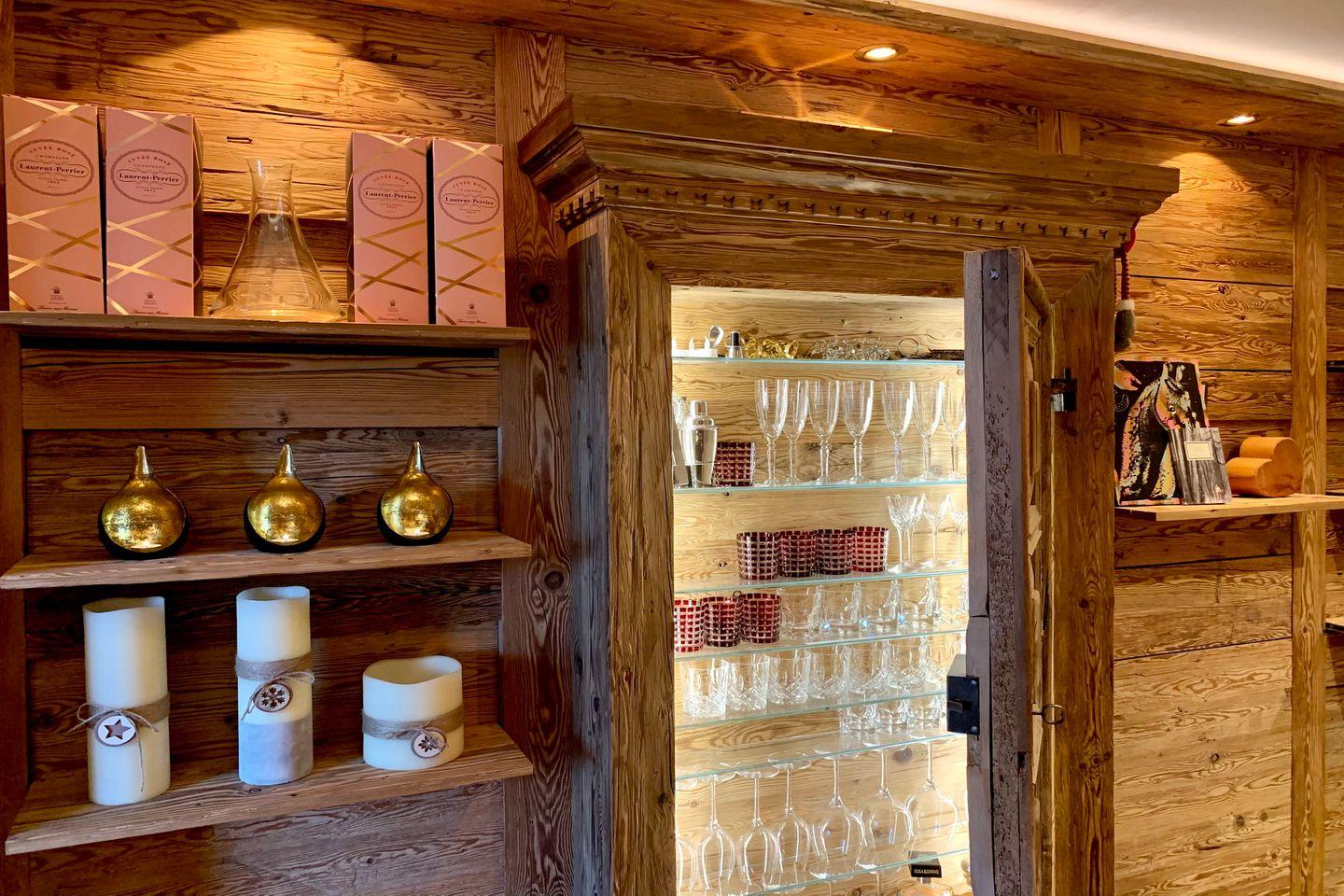 Die Ferienwohnung verfügt über ein sehr gemütliches Wohnzimmer mit einem grosszügigen Esstisch und einem Ledersofa und ein Kaminfeuer mit Optiflame Technologie. Das Sofa lässt sich nicht nur in ein grosses Doppelbett, sondern auch in eine Kinoliegefläche mit grossem Flatscreen-TV umwandeln. Hinter der geheimnissvollen antiken Türe befindet sich eine schicke Hausbar mit edlen Gläsern und Spirituosen.