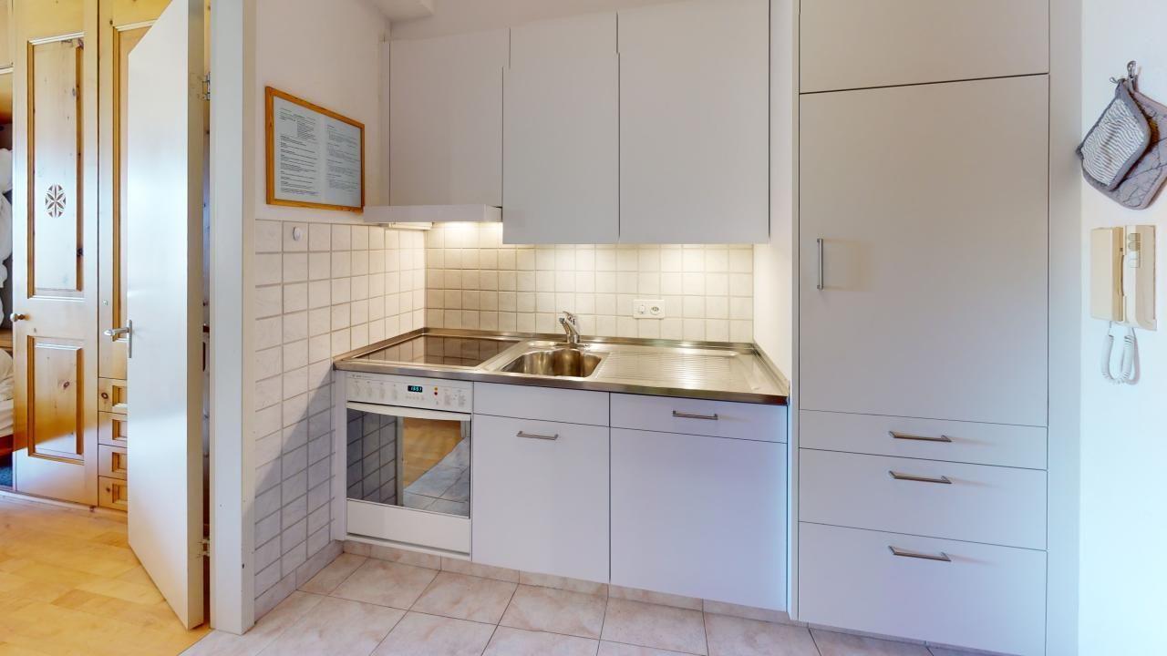 Gemütliche 1-Zimmer-Ferienwohnung im 4. Obergeschoss, eingerichtet im traditionellen Engadiner Stil. Wohn- /Esszimmer mit 2 integrierten Schrankbetten 80 x 200. Überdachter Balkon mit Aussicht. Kleine Küche. Bad mit Dusche. Beschränkte Anzahl Aussenparkplätze (max. 1 Auto/Wohnung, nicht reserviert). Fitnessraum zur öffentlichen Nutzung befindet sich im Ferien-Wohnhaus.