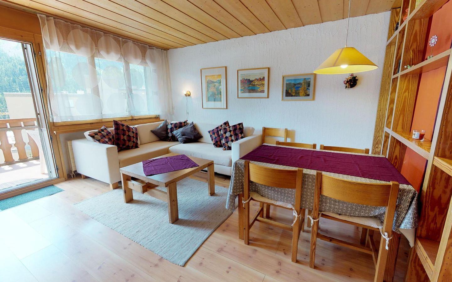 Gemütliches, praktisches 2.5 - Zimmer-Appartement im 1. Stock. Wohn- /Esszimmer, Balkon. Offene Küche. Optisch abgetrennt zum Wohnzimmer 1 Doppelbett. 1 Schlafzimmer mit 2 separaten Betten. 1 Bad/Dusche. Lift. Garagenplatz.
