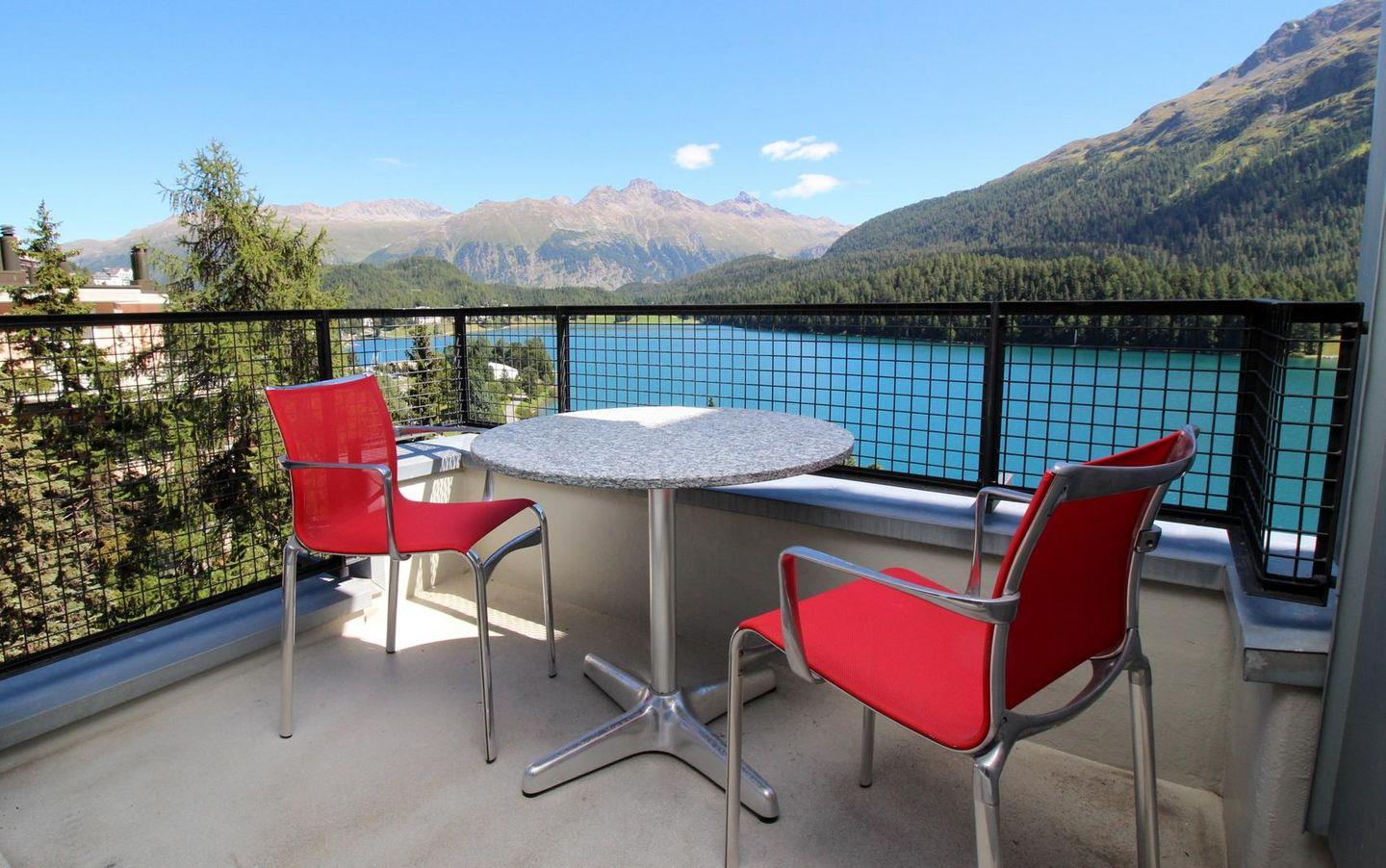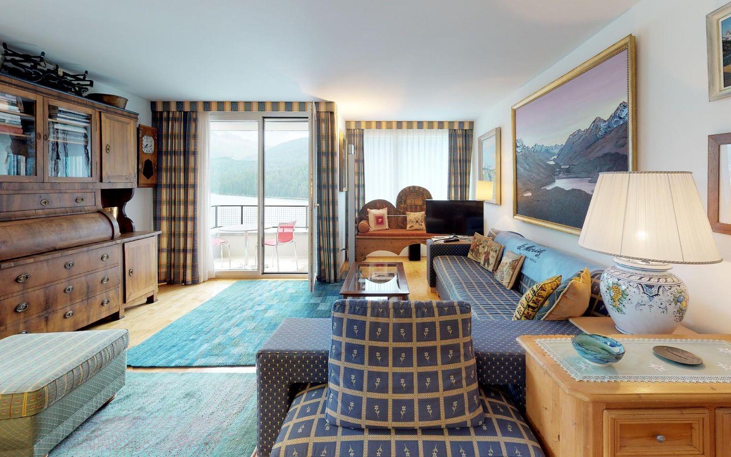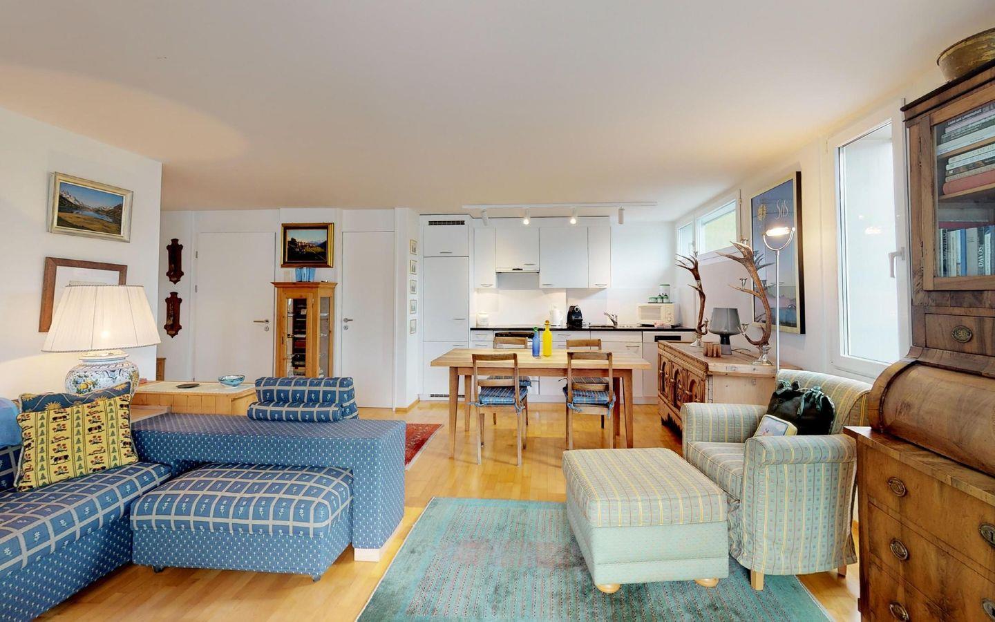 Gepflegte, helle 2 - Zimmer Ferienwohnung mit fantastischer Aussicht auf den See und die Engadiner Berge. Wohn- /Esszimmer mit offener Küche. 1 Doppelschlafzimmer. Bad/Dusche. 2 kleine Balkone. Gedeckter Autoeinstellplatz.