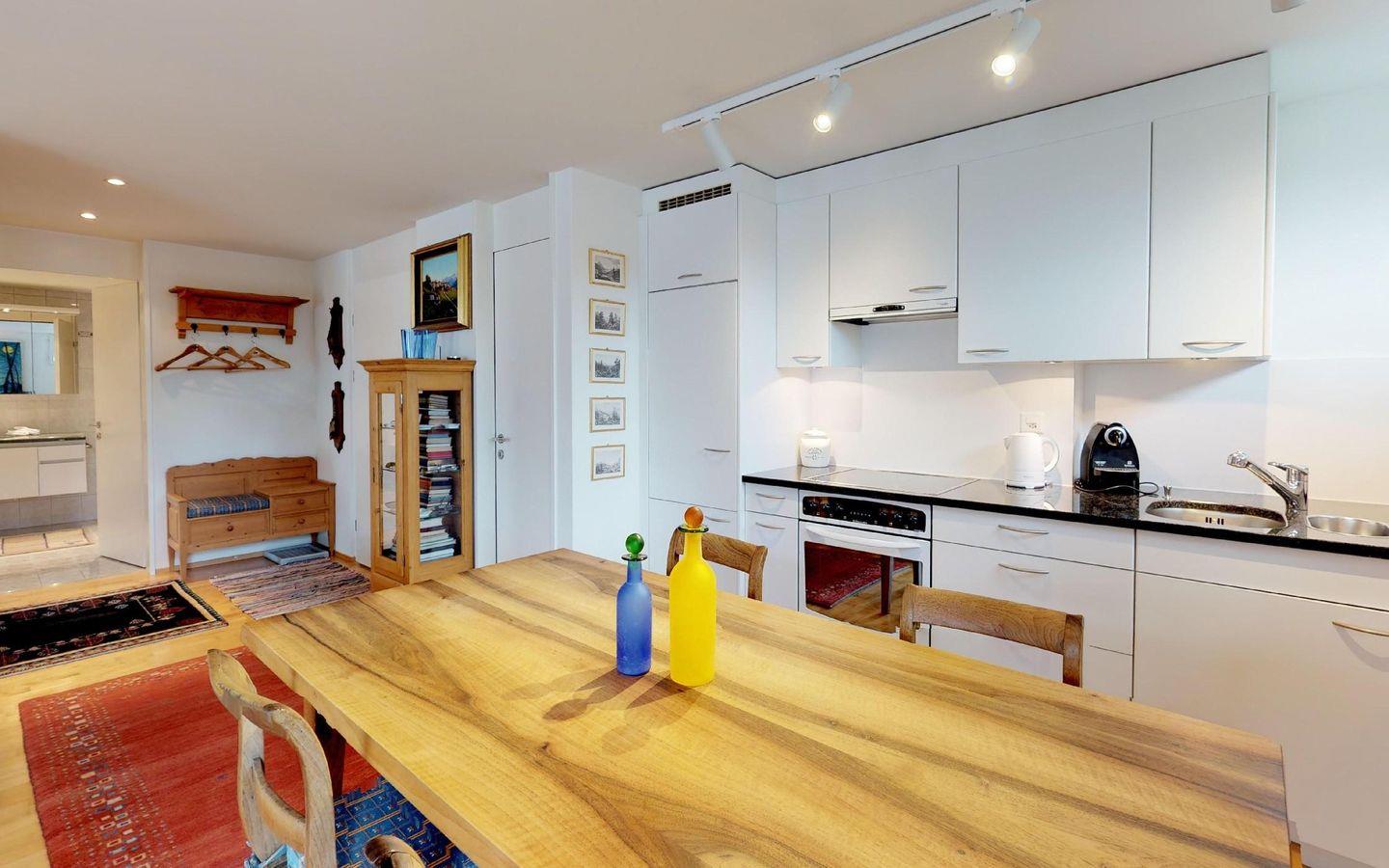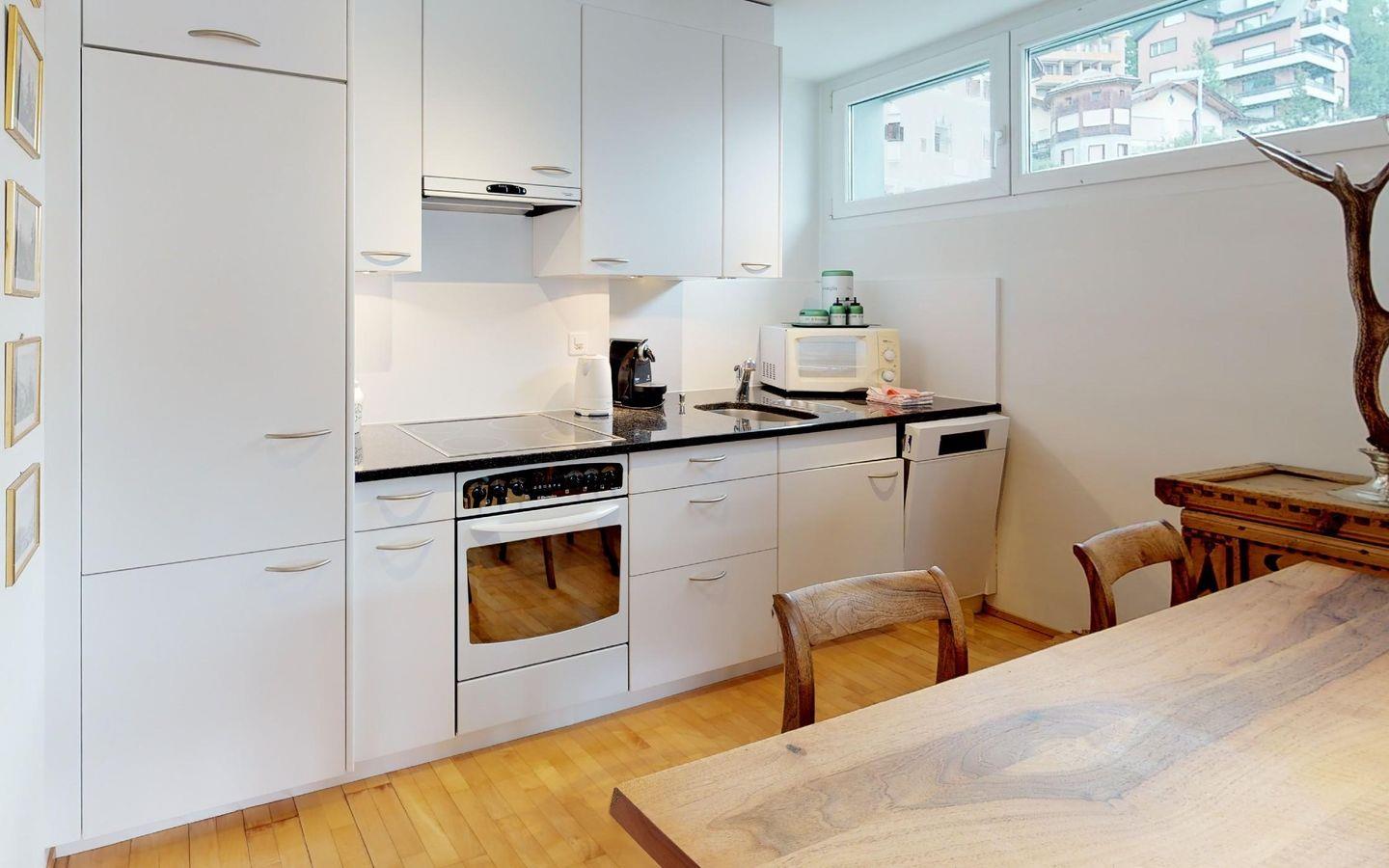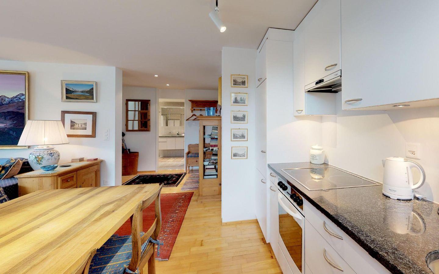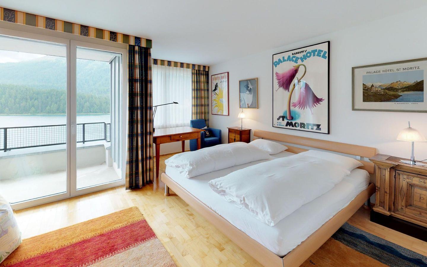 Gepflegte, helle 2 - Zimmer Ferienwohnung mit fantastischer Aussicht auf den See und die Engadiner Berge. Wohn- /Esszimmer mit offener Küche. 1 Doppelschlafzimmer. Bad/Dusche. 2 kleine Balkone. Gedeckter Autoeinstellplatz.