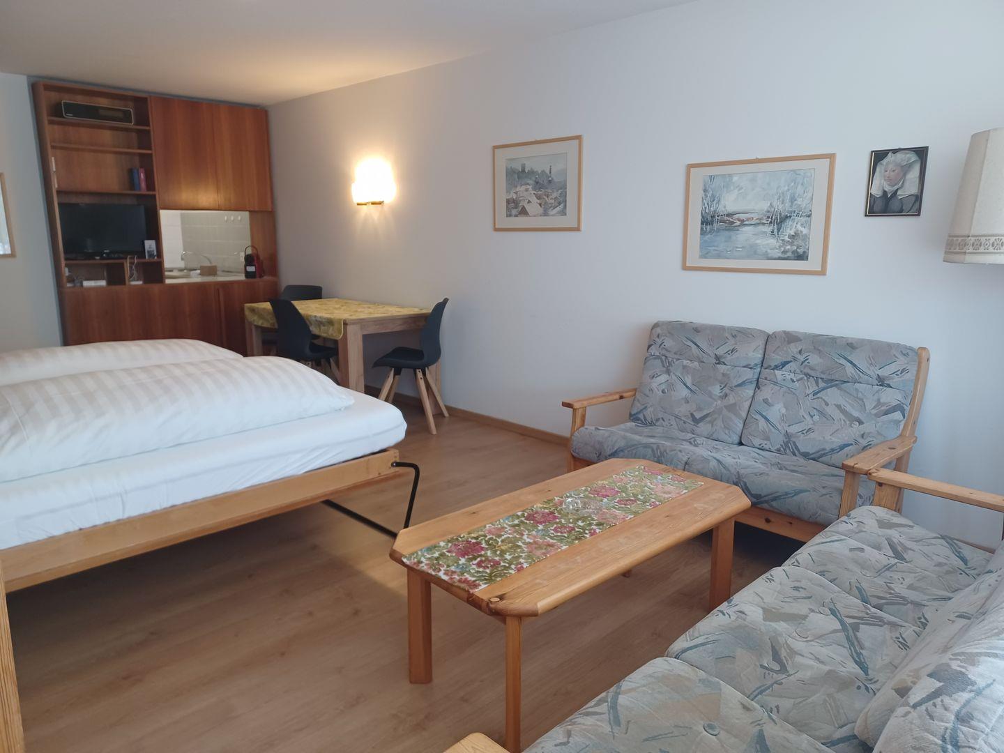 Sympathische Ferienwohnung im 5. Stock. Zirka 40 m2. Wohn- /Esszimmer mit Schrankbetten, Kleine Küche ohne GS, Balkon Süd. Bad/Dusche, WC. Lift.