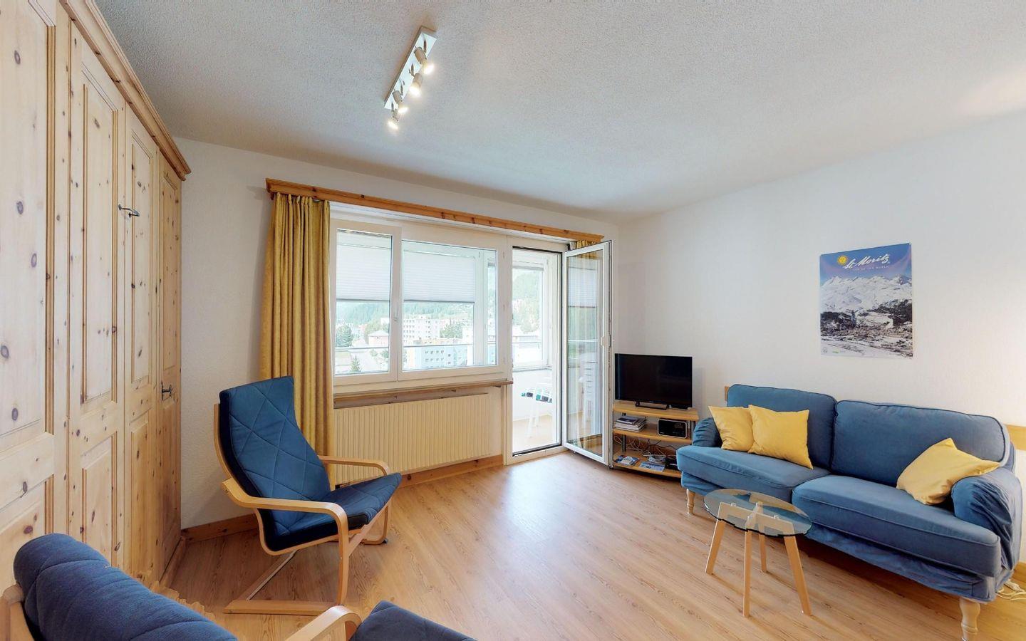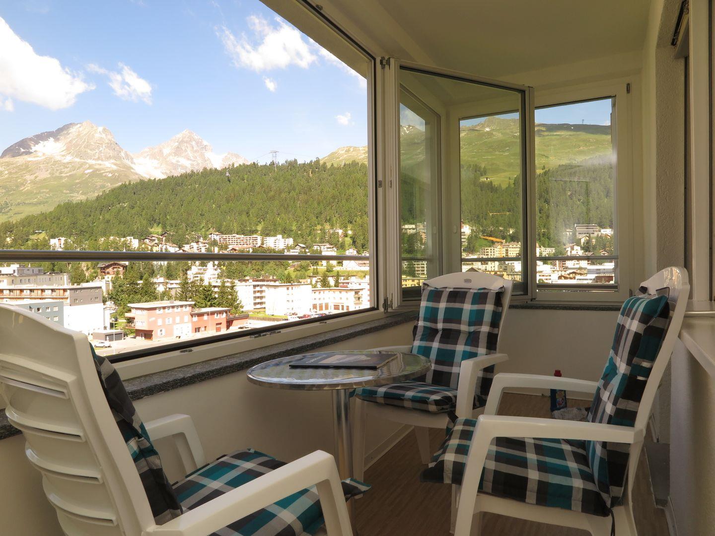 Gepflegte, schöne Ferienwohnung im 7. Stock mit wunderbarer Aussicht auf die Engadiner Berge. Wohn- /Esszimmer mit 2 Arvenklappbetten und Küche. Zusätzliche Loggia/Balkon. Doppelschlafzimmer. Bad/Dusche. Lift, Garagenplatz, Ski- und Fahrradkeller.