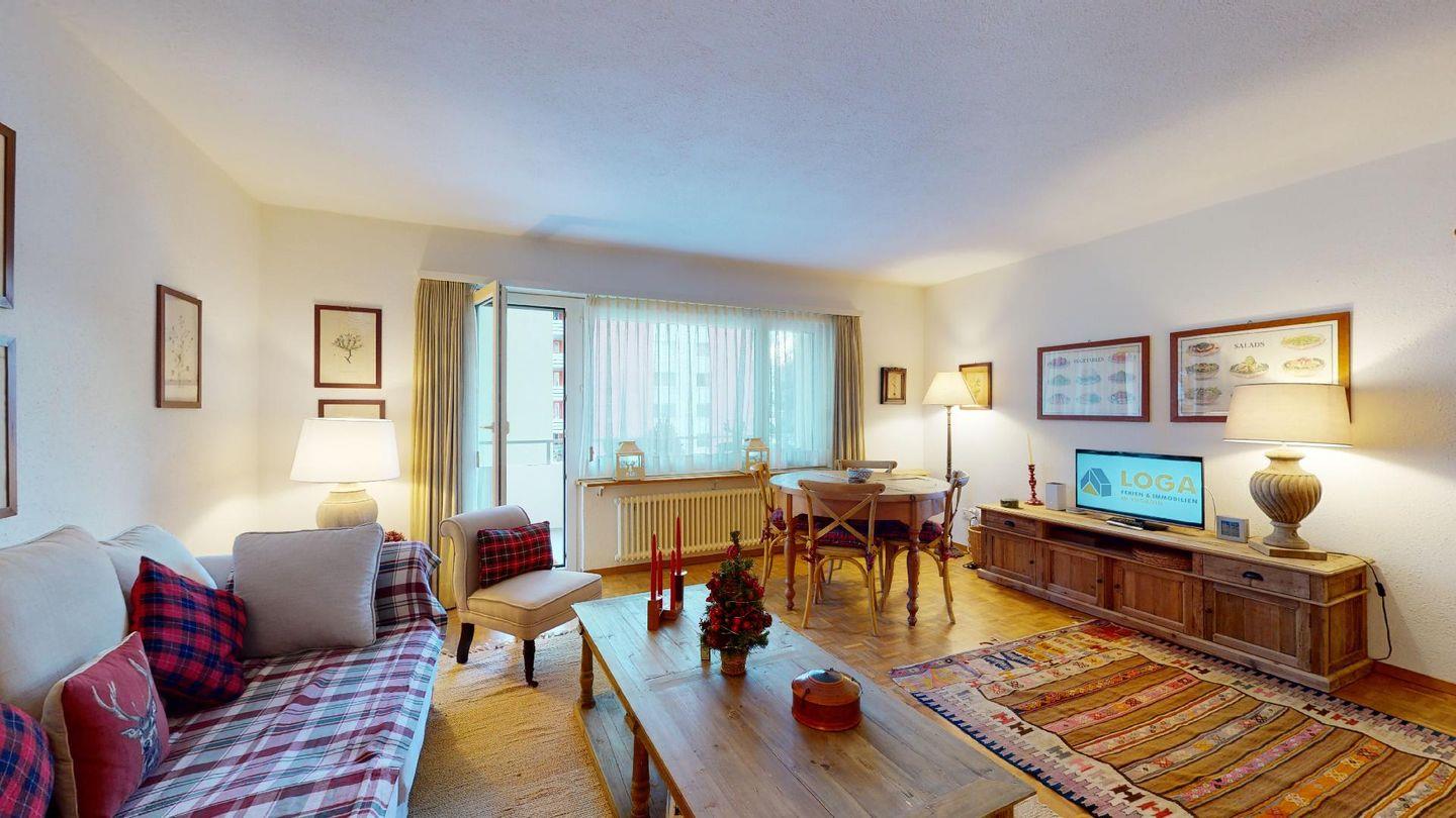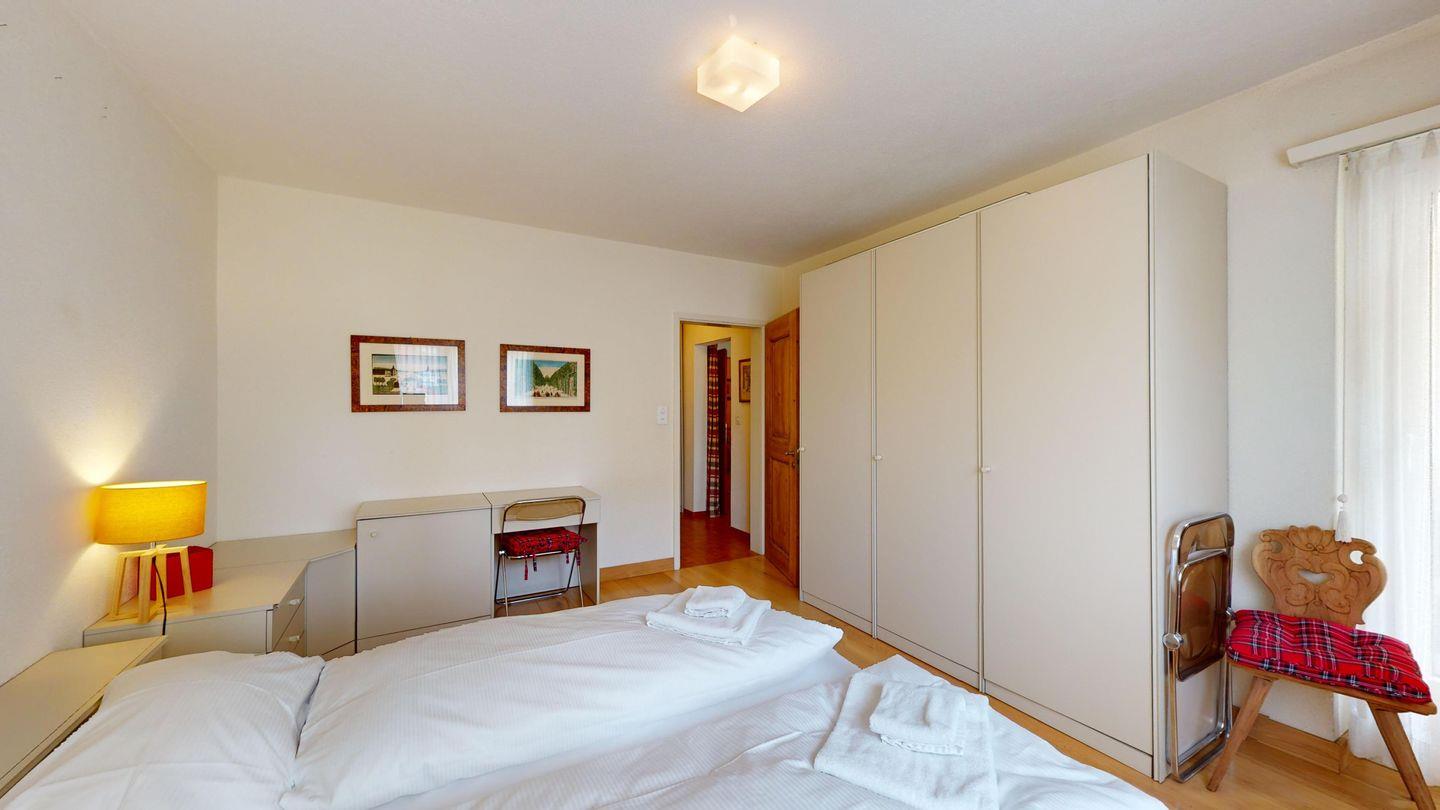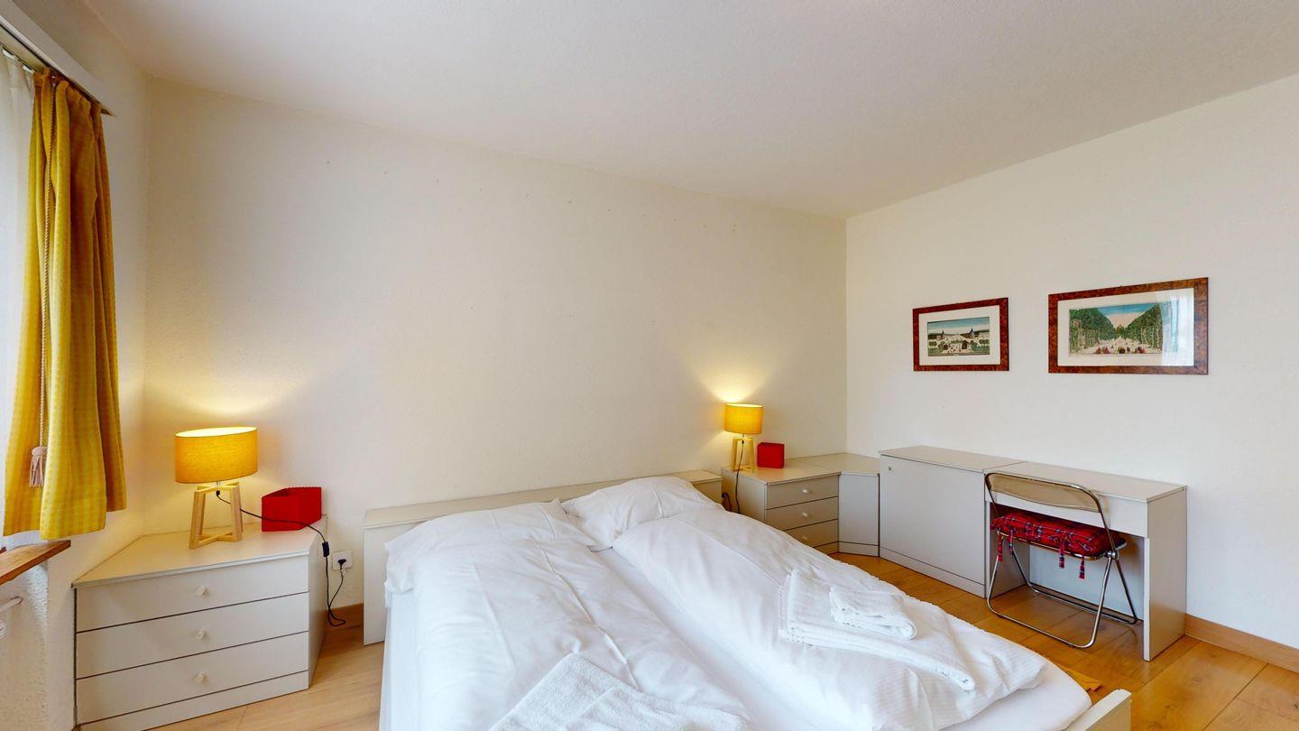 2½ -Zimmerwohnung ca. 72 m² auf der ersten Etage, mit Lift. Entree mit Garderobe und einem Einzelbett. Wohn-/ Esszimmer mit Ausgang zum Süd-Balkon. Radio/TV und Internet. Separate Küche mit Fenster, Geschirrspüler, Backofen, Kühlschrank mit kleinem Gefrierfach. Bad/WC/Bidet/Lavabo. Doppelschlafzimmer. Waschküche zur Benützung (gegen Bezahlung). Garagenboxparkplatz (nicht für grössere Autos geeignet). Kein Ski- oder Veloraum