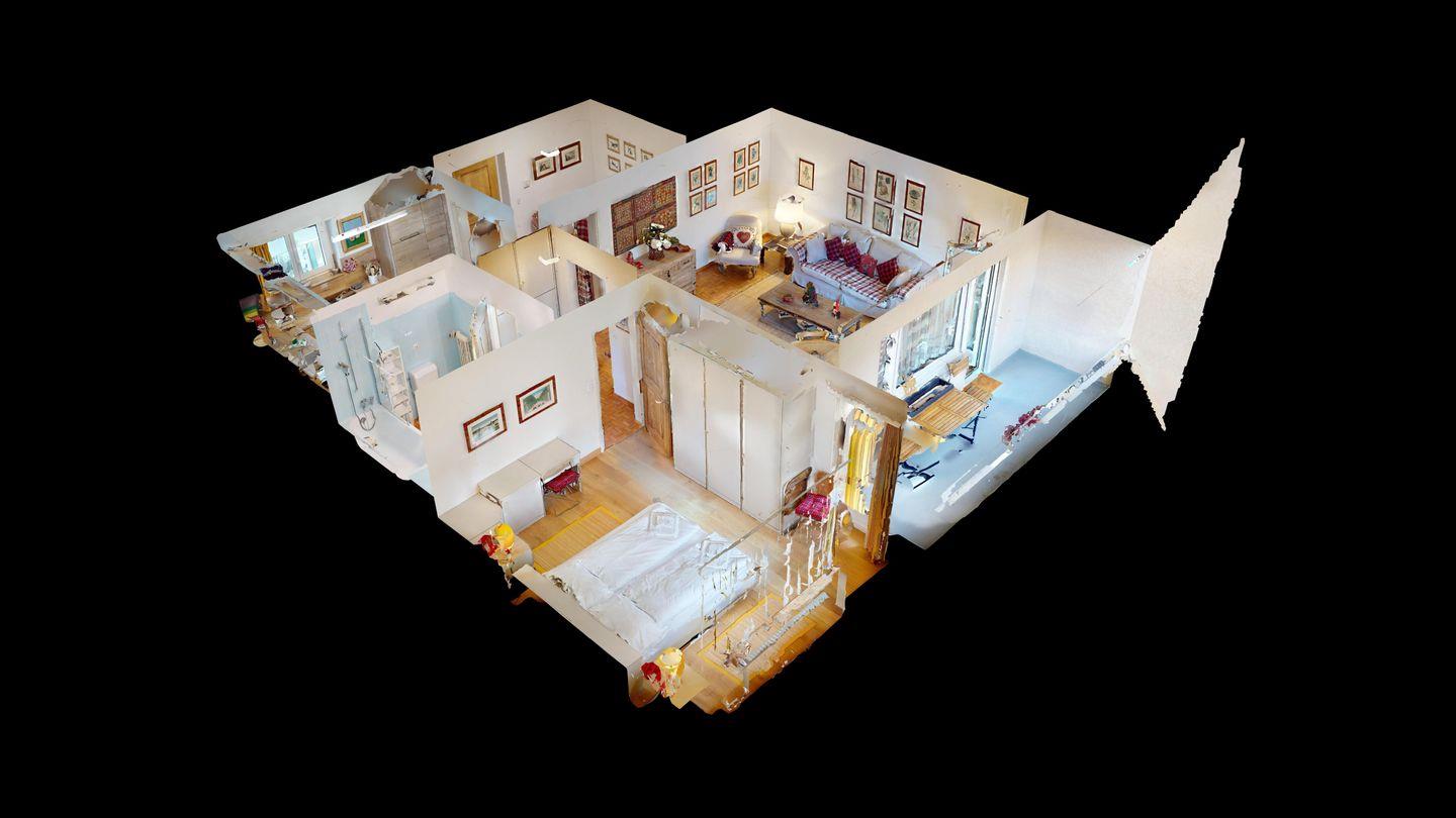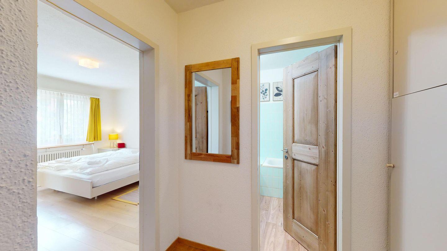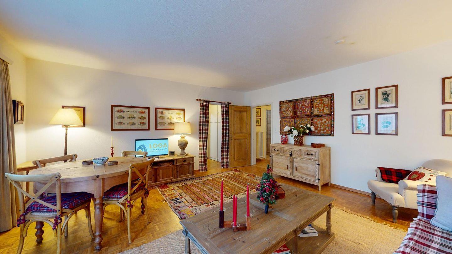 2½ -Zimmerwohnung ca. 72 m² auf der ersten Etage, mit Lift. Entree mit Garderobe und einem Einzelbett. Wohn-/ Esszimmer mit Ausgang zum Süd-Balkon. Radio/TV und Internet. Separate Küche mit Fenster, Geschirrspüler, Backofen, Kühlschrank mit kleinem Gefrierfach. Bad/WC/Bidet/Lavabo. Doppelschlafzimmer. Waschküche zur Benützung (gegen Bezahlung). Garagenboxparkplatz (nicht für grössere Autos geeignet). Kein Ski- oder Veloraum