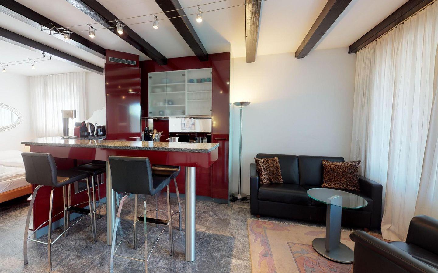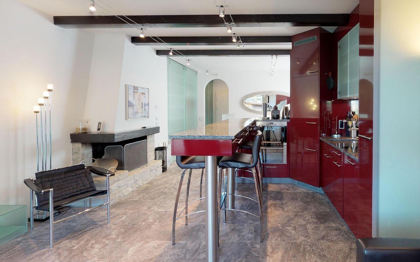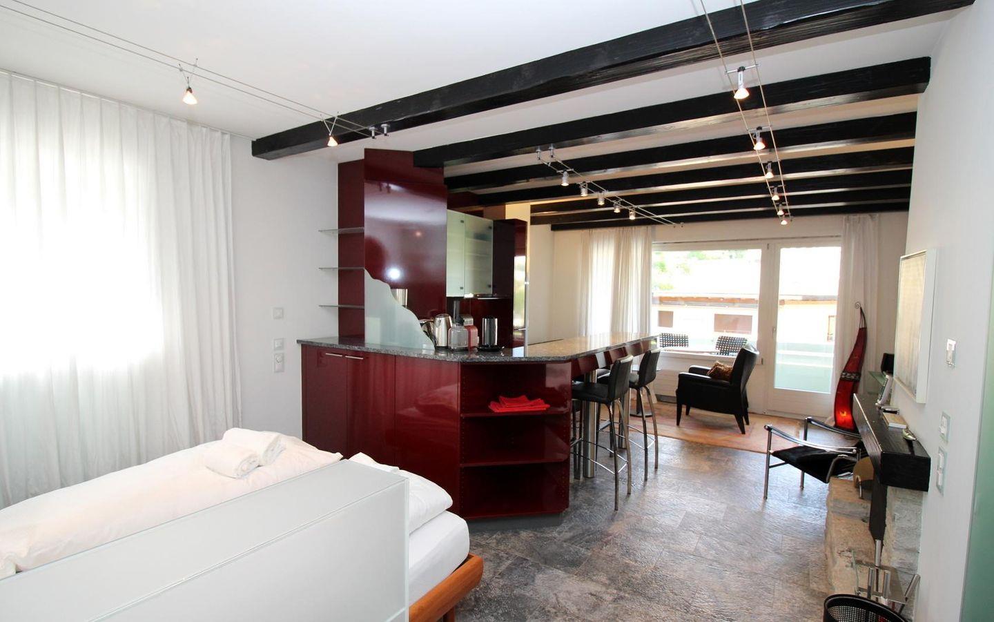 Renovierte, gemütliche 1.5 - Zimmer Ferienwohnung. Wohnzimmer mit Kamin und Schlafecke mit Doppelbett. Separates Badezimmer. Offene gut eingerichtete Bar-Küche. Balkon mit Panoramablick auf St. Moritz-Dorf (Palace-Hotel). Lift und Aussenparkplatz.