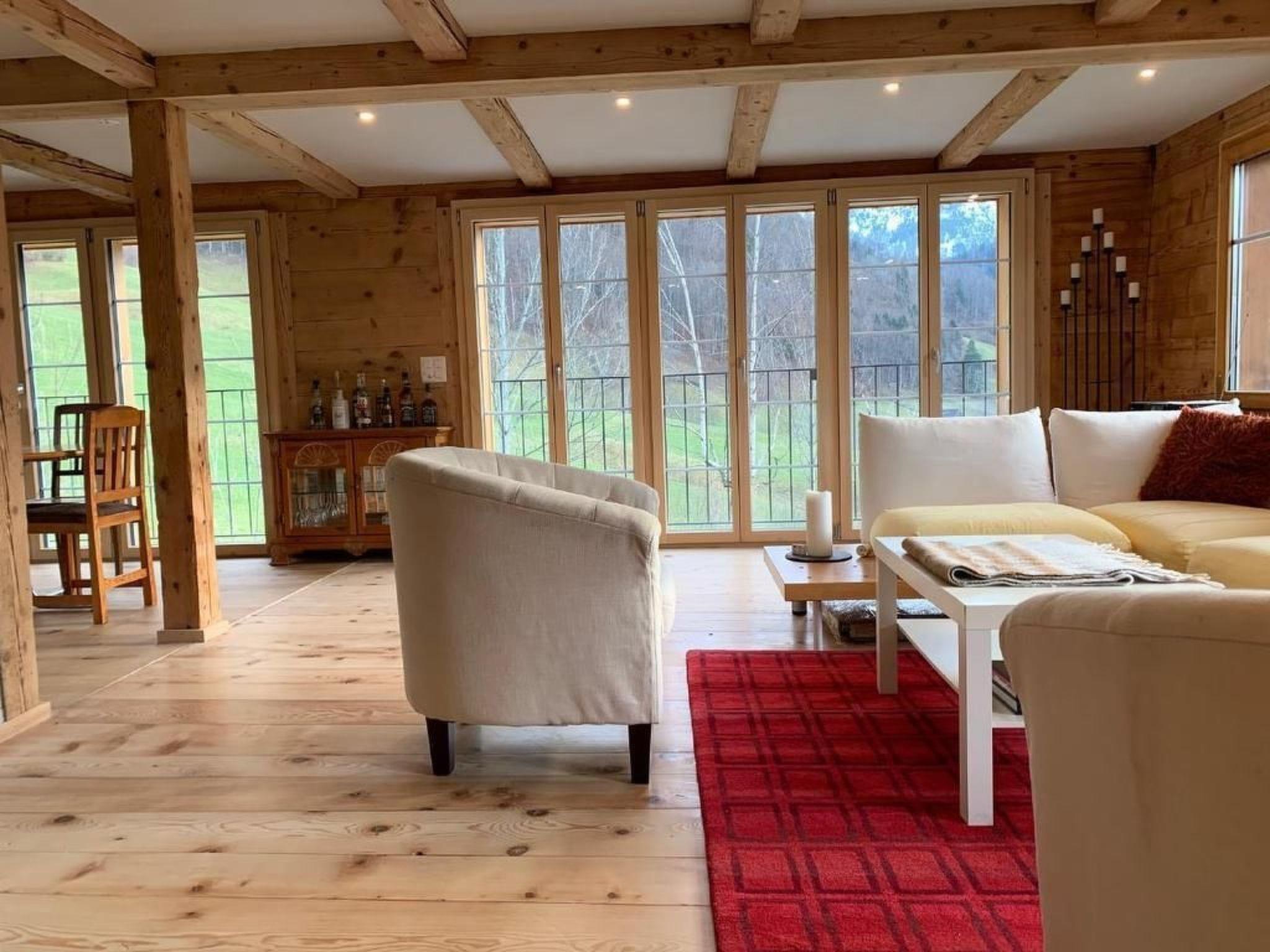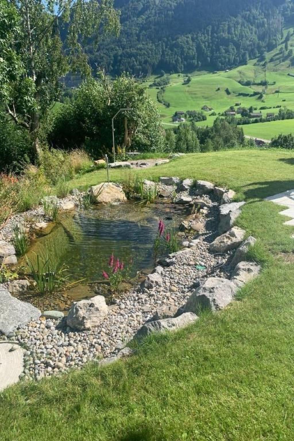 Garden: Large terrace 40 m2, natural swimming pond, barbecue area, lawn, further seating area (approx. 10 m2) with unobstructed view of the Churfirsten, the Speer and the valley. Garden furniture available.