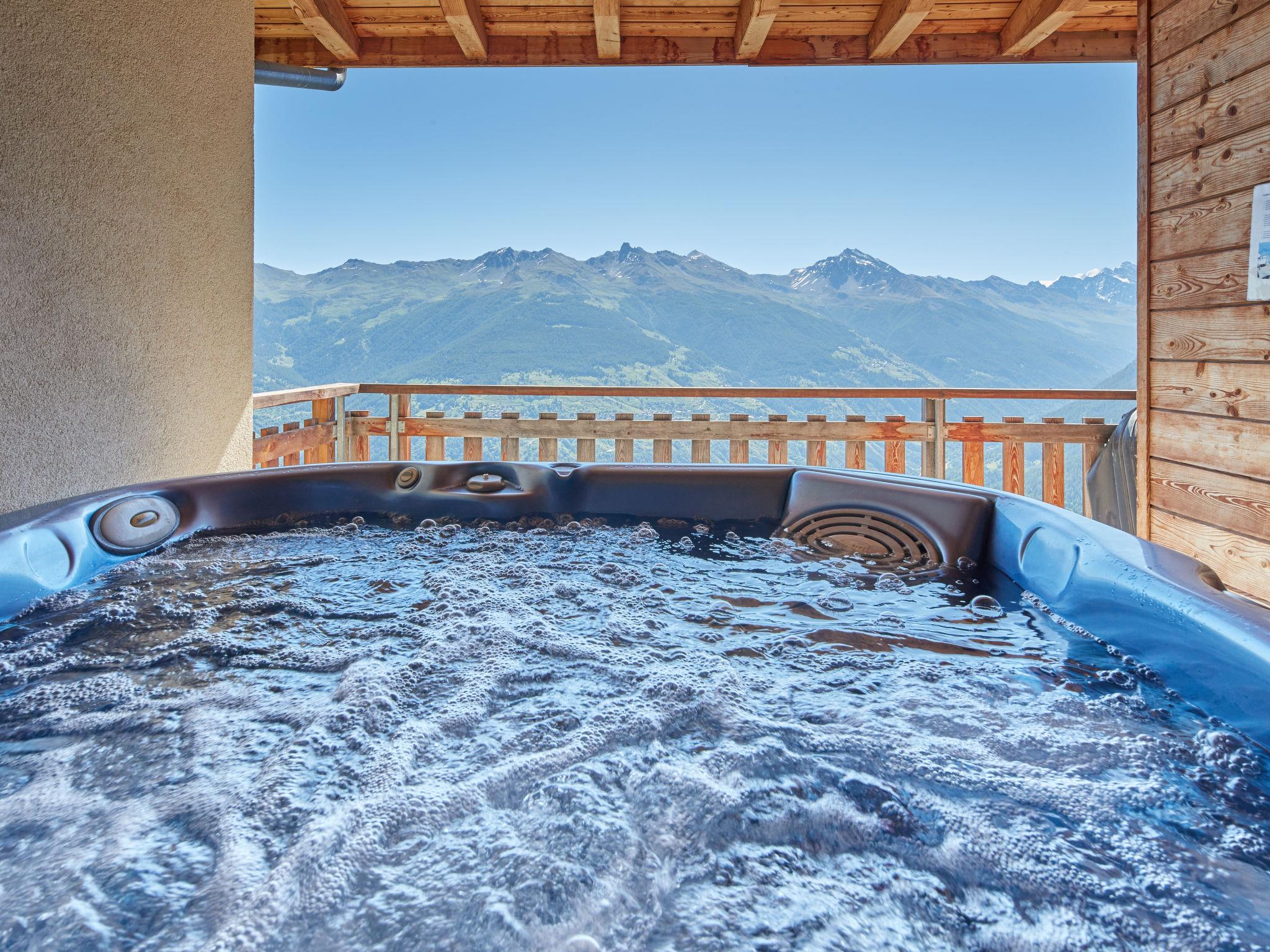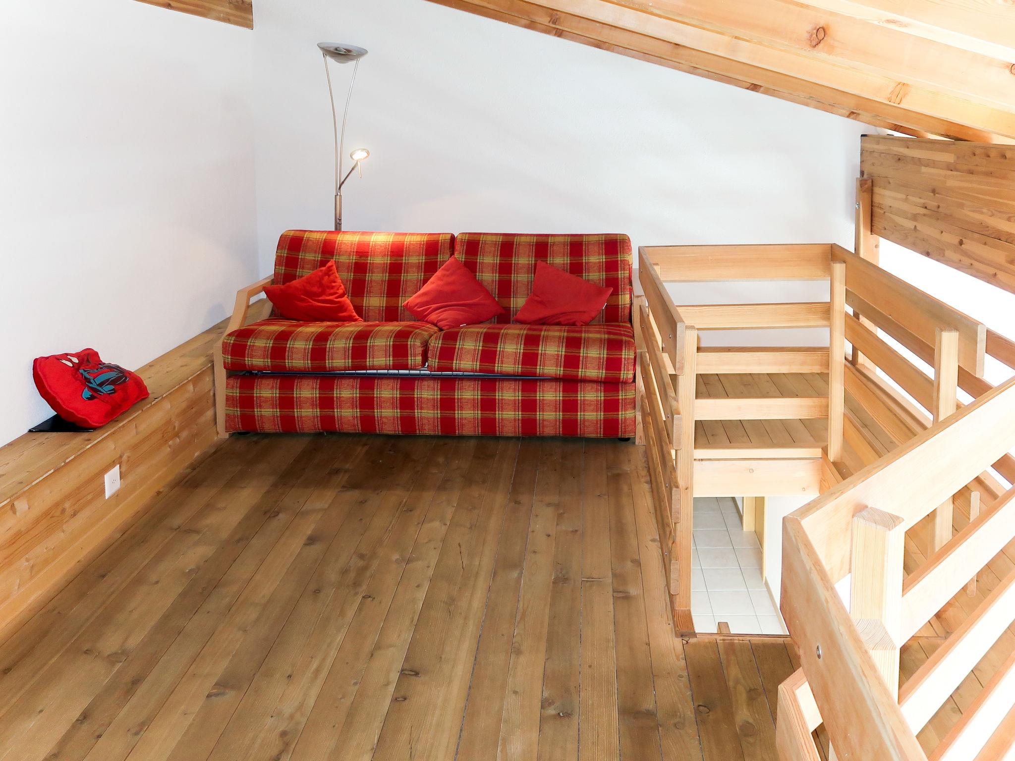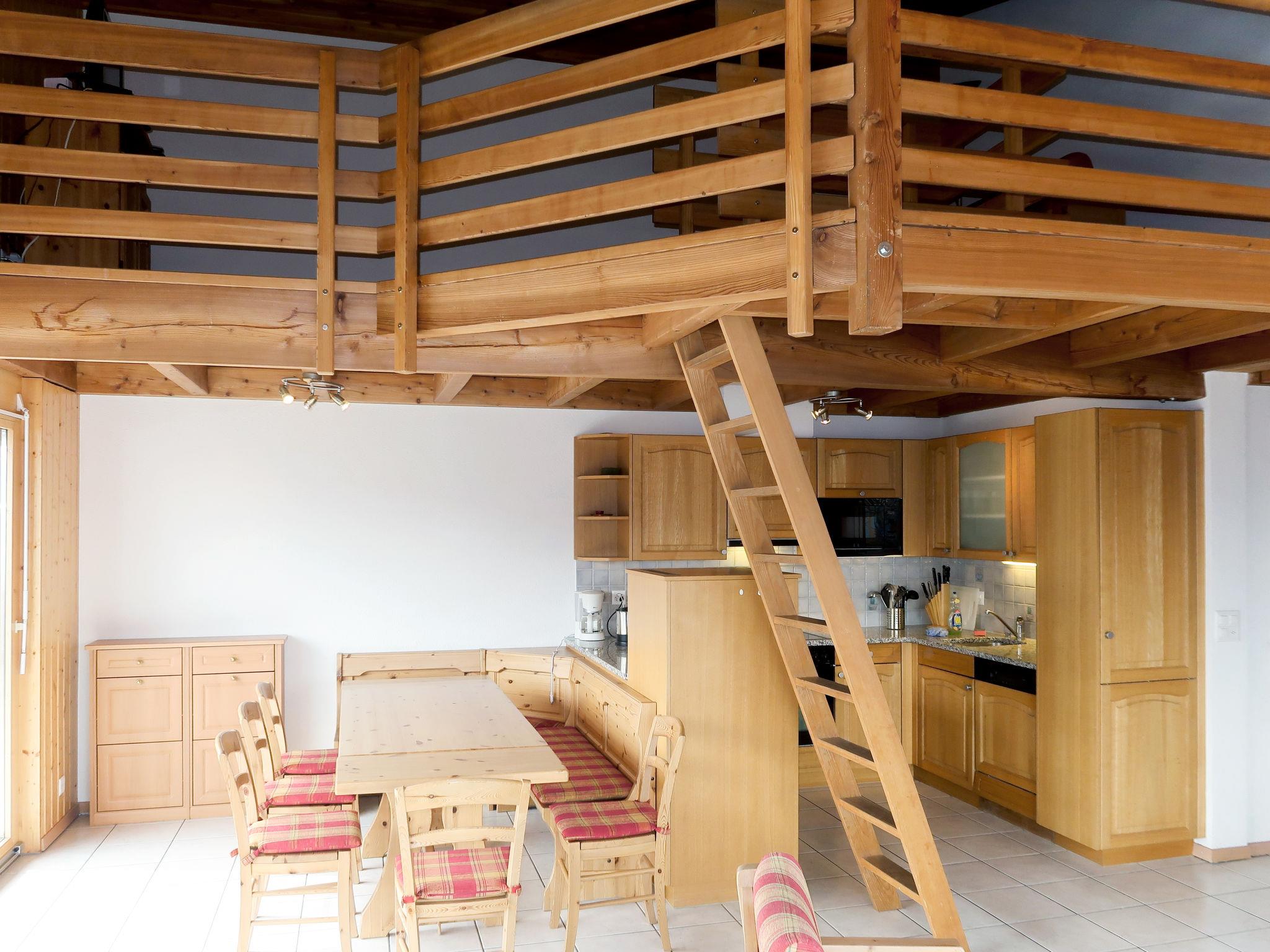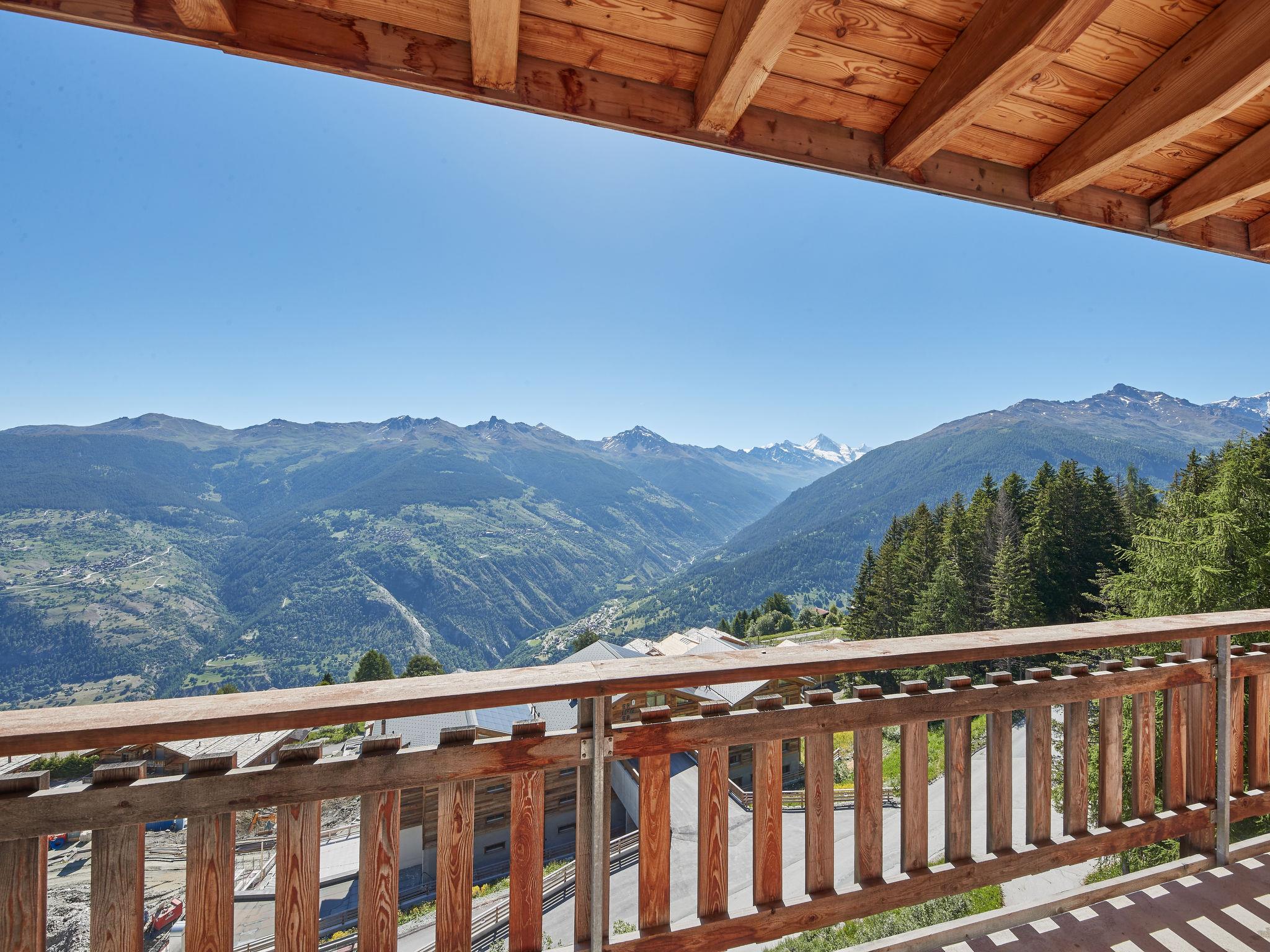 "Les Cîmes 8", 5-room apartment 110 m2 on 2 levels on 6th floor. Comfortable and tasteful furnishings: living/sleeping room, on 2 levels with 1 double sofabed and dining table. Exit to the balcony. 1 room with 1 french bed (140 cm, length 200 cm). Exit to the balcony. 1 room with 1 x 2 bunk beds (90 cm, length 200 cm). Exit to the balcony. 1 room with 1 double bed (180 cm, length 200 cm). Exit to the balcony. 1 room with sloping ceilings with 2 beds. Gallery with TV. Open kitchen (oven, dishwasher, 4 ceramic glass hob hotplates, microwave, electric coffee machine, fondue Set (cheese)). Bath/WC, 2 showers/WC, hydro massage bath. Parquet floors. Balcony 50 m2. Panoramic view. Facilities: Internet (WiFi, free). Please note: non-smokers only. Maximum 1 pet/ dog allowed. Instead of an enclosed bedroom, some sleeping areas are located in an open-plan area (gallery, alcove, etc.).