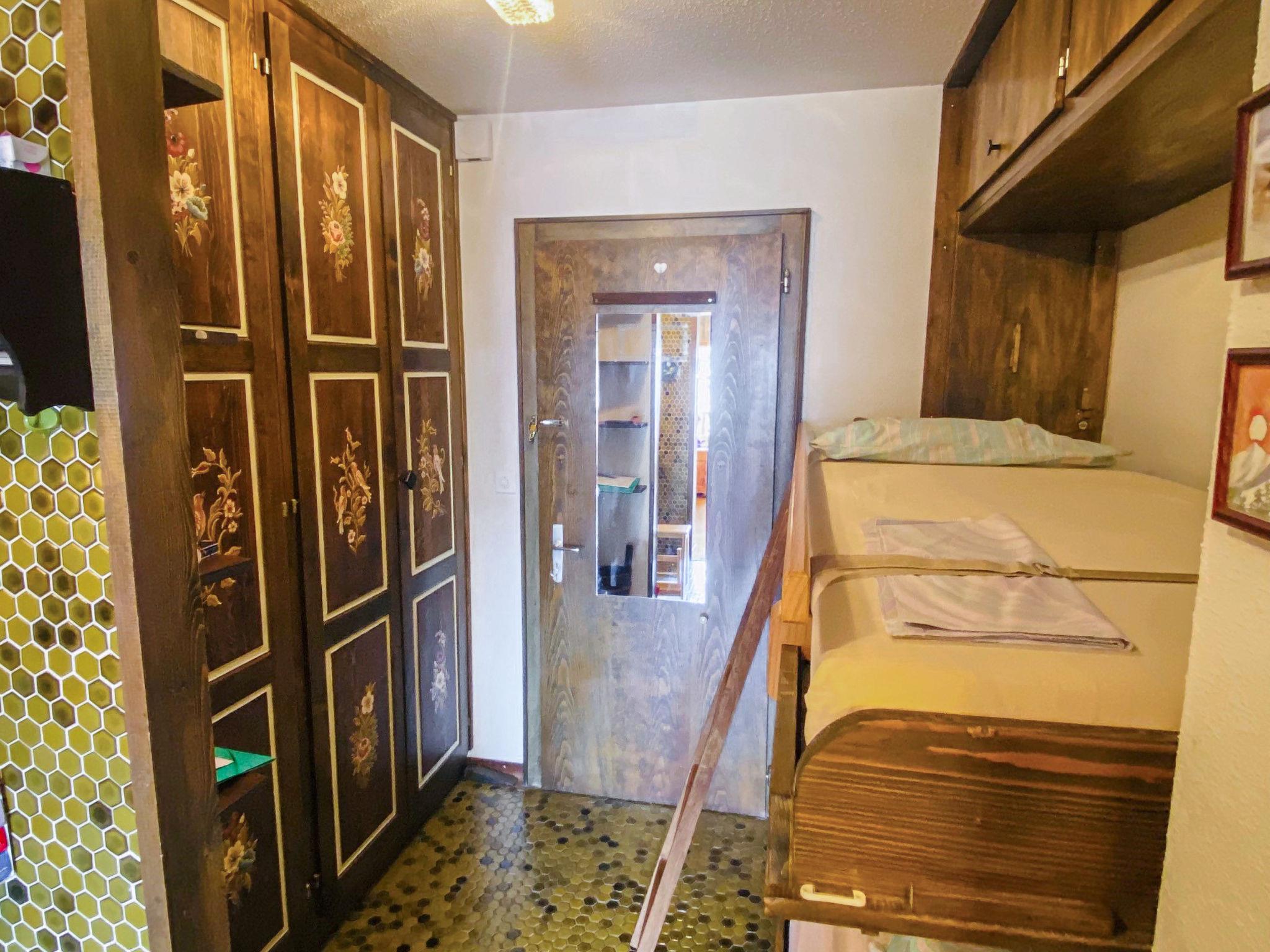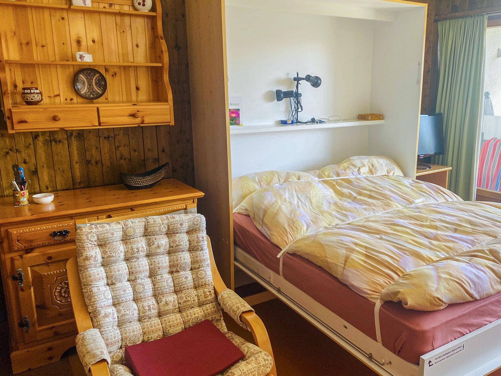 "Hameau A04", 1-room studio. Object suitable for 2 adults + 3 children. Simple and practical furnishings: living/sleeping room with 1 sofabed, 2 wall-trunk beds, 1 double wall-trunk bed and TV. Exit to the balcony. Open kitchen (4 hot plates, oven, electric coffee machine). Shower/WC. Balcony. Balcony furniture. Facilities: Internet (WiFi, extra). Please note: non-smokers only.