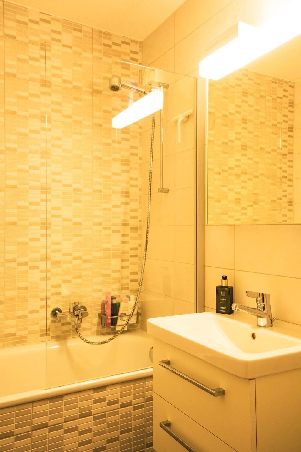 "Hameau A4", 2-room apartment on the ground floor. Fully renovated, comfortable and tasteful furnishings: living/dining room. Exit to the balcony, east facing position. 1 room with 2 beds (90 cm, length 190 cm), 1 x 2 bunk beds (90 cm, length 190 cm). Open kitchen (oven, dishwasher, 4 ceramic glass hob hotplates). Bath/WC. Balcony. Balcony furniture. Very beautiful view of the mountains and the valley. Please note: non-smokers only.