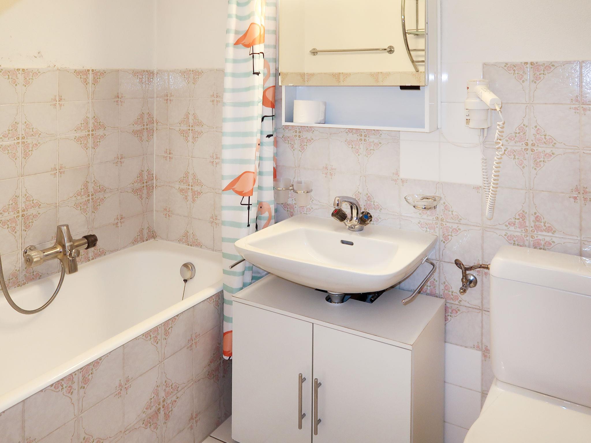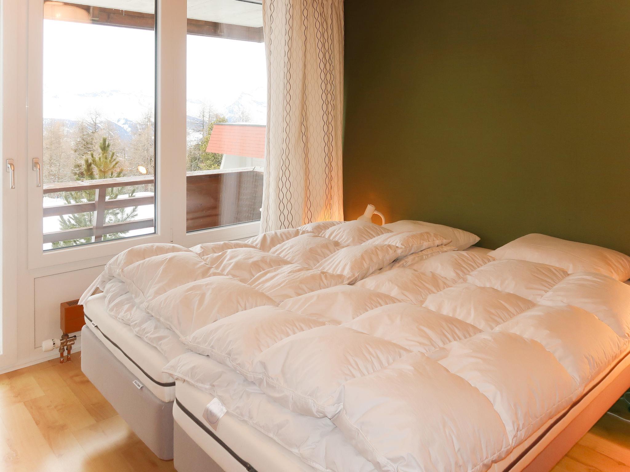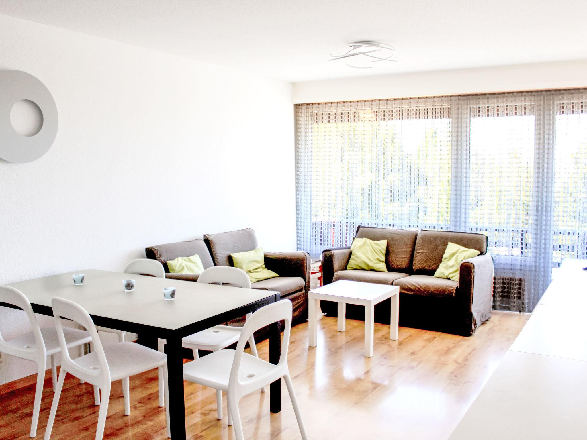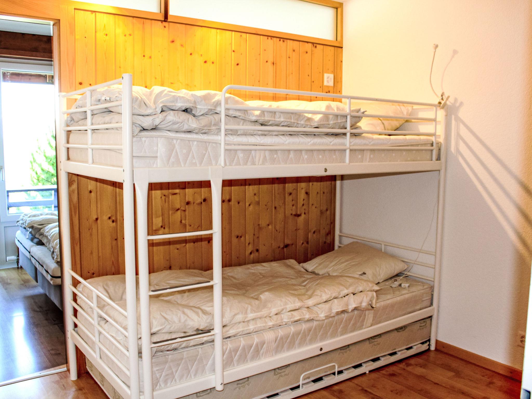 "Résidence Velan", 2-room apartment 52 m2 on 1st floor. Comfortable and tasteful furnishings: living/dining room with cable TV. Exit to the balcony. 1 room with 2 beds (80 cm, length 200 cm). Exit to the balcony. 1 children's room with 1 x 2 bunk beds (90 cm, length 190 cm), 1 pull-out bed (1 pers.). Open kitchen (3 hot plates, oven) with hatch. Bath/WC. Balcony, west facing position. Balcony furniture. Very beautiful view of the mountains and the countryside. Facilities: hair dryer. Please note: non-smokers only. Maximum 1 pet/ dog allowed.