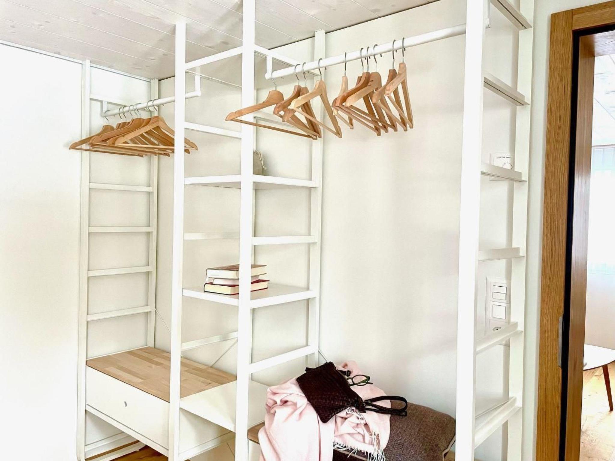 In addition, a cosy sofa (extendable, space for 2 adults) invites you to linger. Two cosy armchairs round off the stylish furnishings. The bedroom with a double bed promises restful nights. A baby cot can also be booked. The baby cot must be placed in the living room.