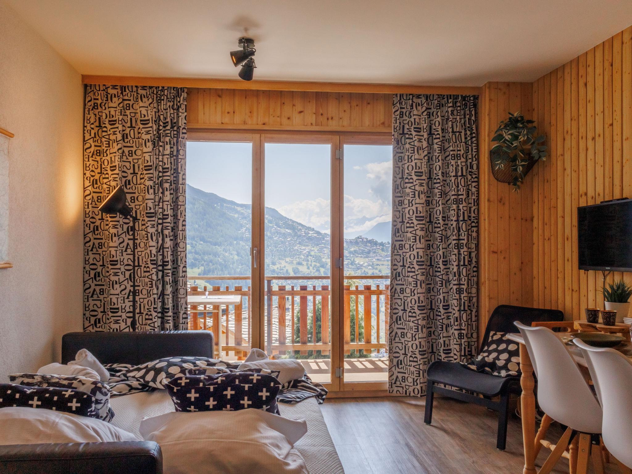 "Beau Soleil G11", 1-room studio 25 m2 on 1st floor. Object suitable for 2 adults + 1 child. Beautiful furnishings: entrance hall with 1 wall-trunk bed (80 cm, length 190 cm). Living/dining room with 1 sofabed (140 cm, length 200 cm), cable TV. Exit to the balcony. Small, open kitchen (4 ceramic glass hob hotplates, kettle, microwave, electric coffee machine, Capsules for coffee machine (Nespresso) extra, raclette grill, fondue Set (chinoise, cheese)). Shower/WC. Small balcony, north-west facing position. Balcony furniture. Very beautiful view of the mountains and the valley. Facilities: Internet (WiFi, free). Please note: non-smokers only, no parking. Instead of an enclosed bedroom, some sleeping areas are located in an open-plan area (gallery, alcove, etc.).