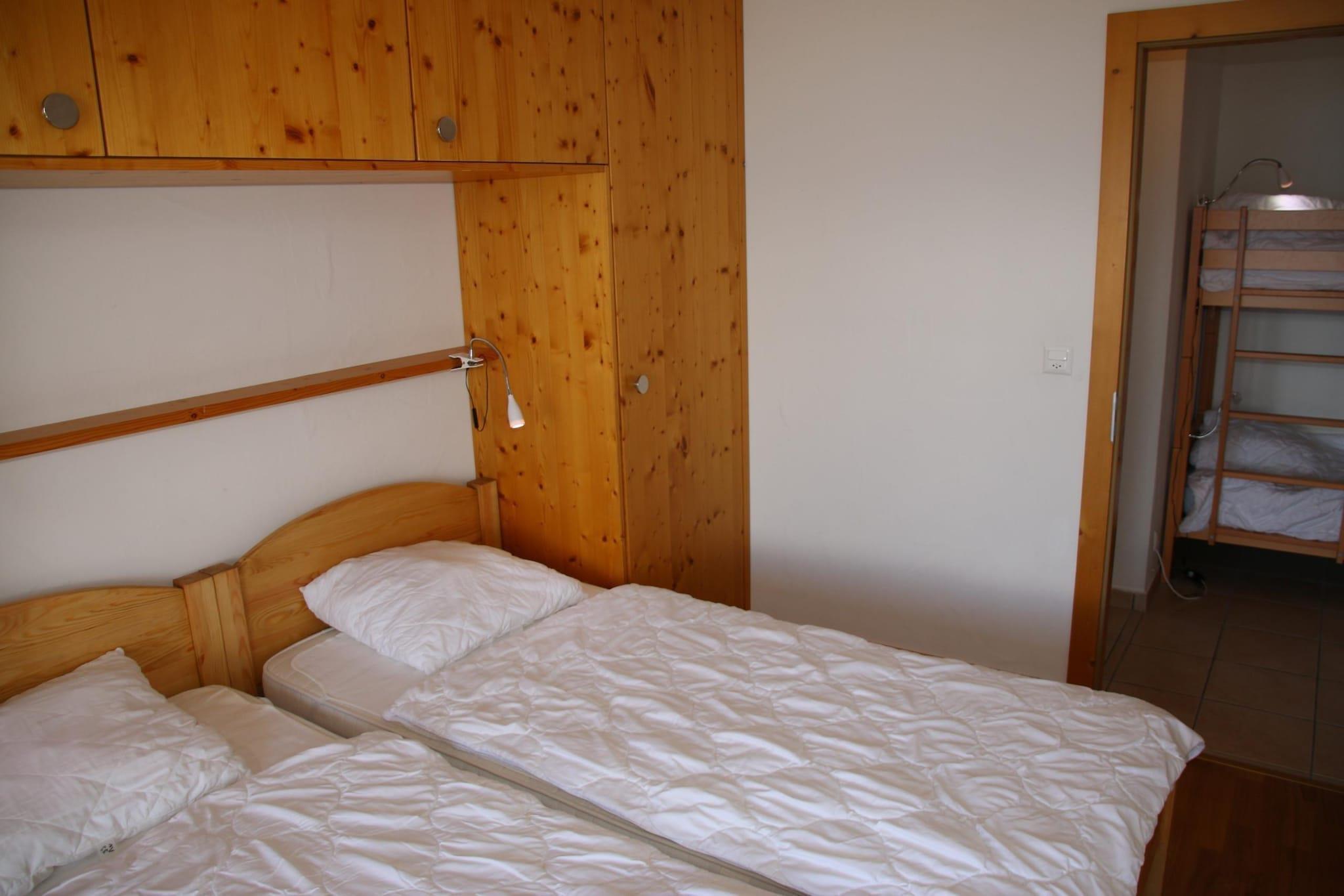 Oplev et hyggeligt familieophold i denne autentiske skisportslejlighed beliggende i Veysonnaz, Schweiz. Denne rummelige lejlighed på 60 m² kan rumme op til 8 gæster, hvilket gør den perfekt til familieferier eller grupperejser. Den charmerende lejlighed har en lys stue med en sovesofa, en hyggelig pejs, kabel-tv og en dvd-afspiller, hvilket skaber en indbydende atmosfære. Det åbne køkken er fuldt udstyret med køleskab, ovn, mikroovn, brødrister, filterkaffemaskine, kedel og opvaskemaskine til alle dine madlavningsbehov. Plein Ciel-residensen ligger kun 270 meter fra svævebanen, butikker og fritidsaktiviteter og sikrer bekvemmelighed lige ved hånden. Sovearrangementer inkluderer en køjeseng i korridoren (90x200) til to, soveværelse 1 med to enkeltsenge (90x200), og soveværelse 2 også med to enkeltsenge (90x200). Lejligheden har to badeværelser - det ene med badekar og toilet, og det andet med bruser og toilet. Træd ud på balkonen for at nyde panoramaudsigten over Rhône-dalen, møbleret til din afslapning. Yderligere faciliteter inkluderer et vaskerum (digital betaling), et skirum og en inkluderet indendørs parkeringsplads, med mere tilgængelig på den offentlige betalingsparkering. Kæledyr er velkomne, og adgang er let via elevator eller trapper. Bemærk venligst, at der opkræves ekstra omkostninger for sengelinned og håndklæder, slutrengøring, turistskat og et refunderbart depositum. Gæster nyder gratis adgang til den offentlige swimmingpool året rundt, deltagelse i aktivitetsprogrammet Sun&Fun i højsommersæsonen og rabatter på op til 50 % på leje af udstyr. Valgfri tjenester, såsom komfortpakker og gourmetkurve, er også tilgængelige. Velkommen til dit alpine hjem!