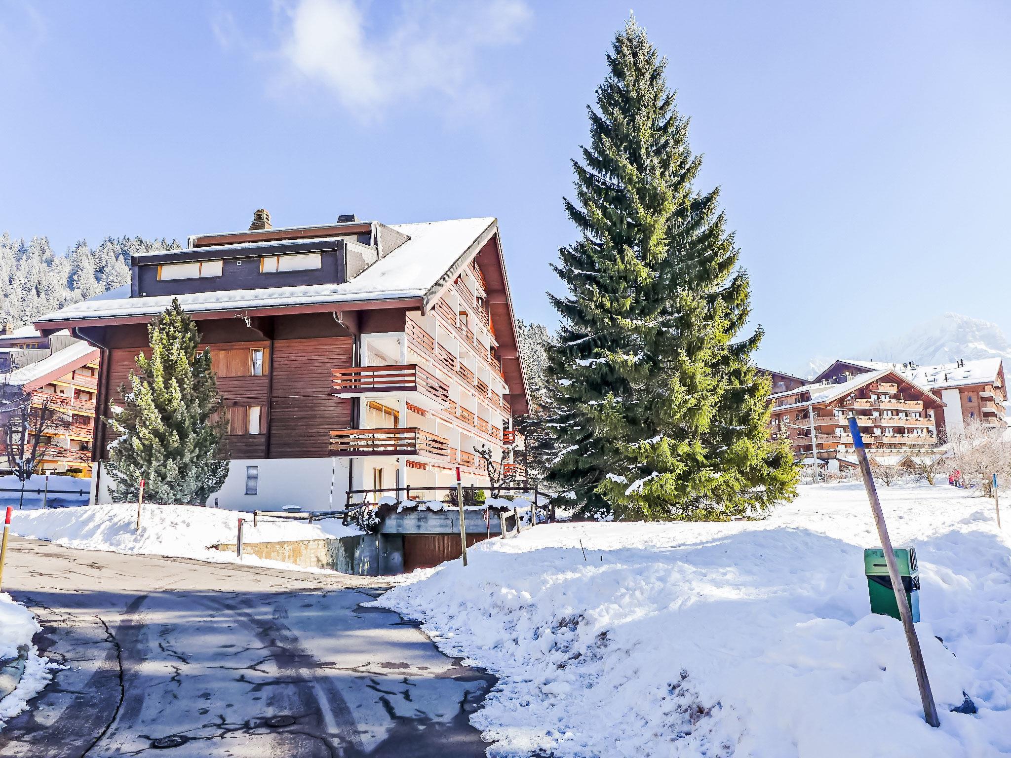Roches Grises: Residence "Diamant", 5 storeys. Above Villars, in a sunny position, 200 m from the skiing area, south facing position. For shared use: garden with lawn and plants. In the house: lift, storage room for skis, central heating system, washing machine (for shared use, extra), drying room. In Winter: please take snow chains. Public parking. Shop 1 km, grocery, restaurant 700 m, bakery 900 m, 12 minute walk to the centre, bus stop 1 km, railway station "Roches Grises" 20 m, indoor swimming pool 1.6 km, thermal baths "Lavey-es-Bains" 19 km. Sports harbour 25 km, golf course (18 hole) 7 km, indoor tennis centre, sports centre 160 m, mountain railway 100 m, gondola lift 1.6 km, ski bus stop 1 km, ski school 1.4 km, children's ski school 160 m, ice rink 1.6 km, children's playground 1.4 km. Please note: lift to 3rd floor. Free ski bus service to the ski region Villars.
