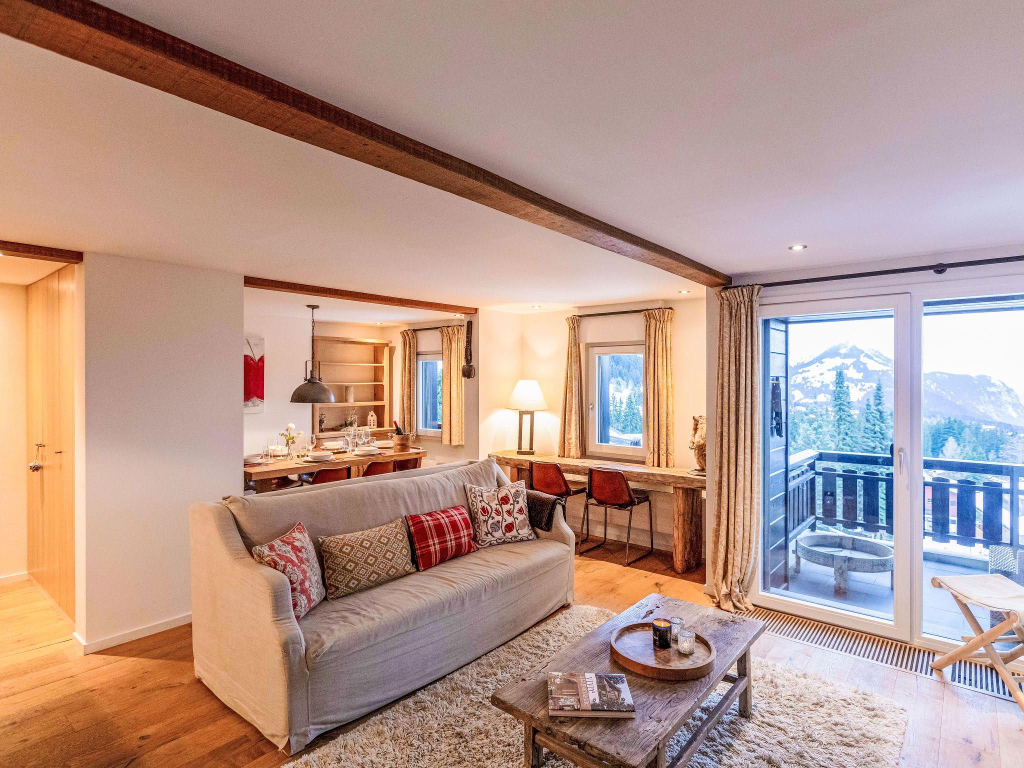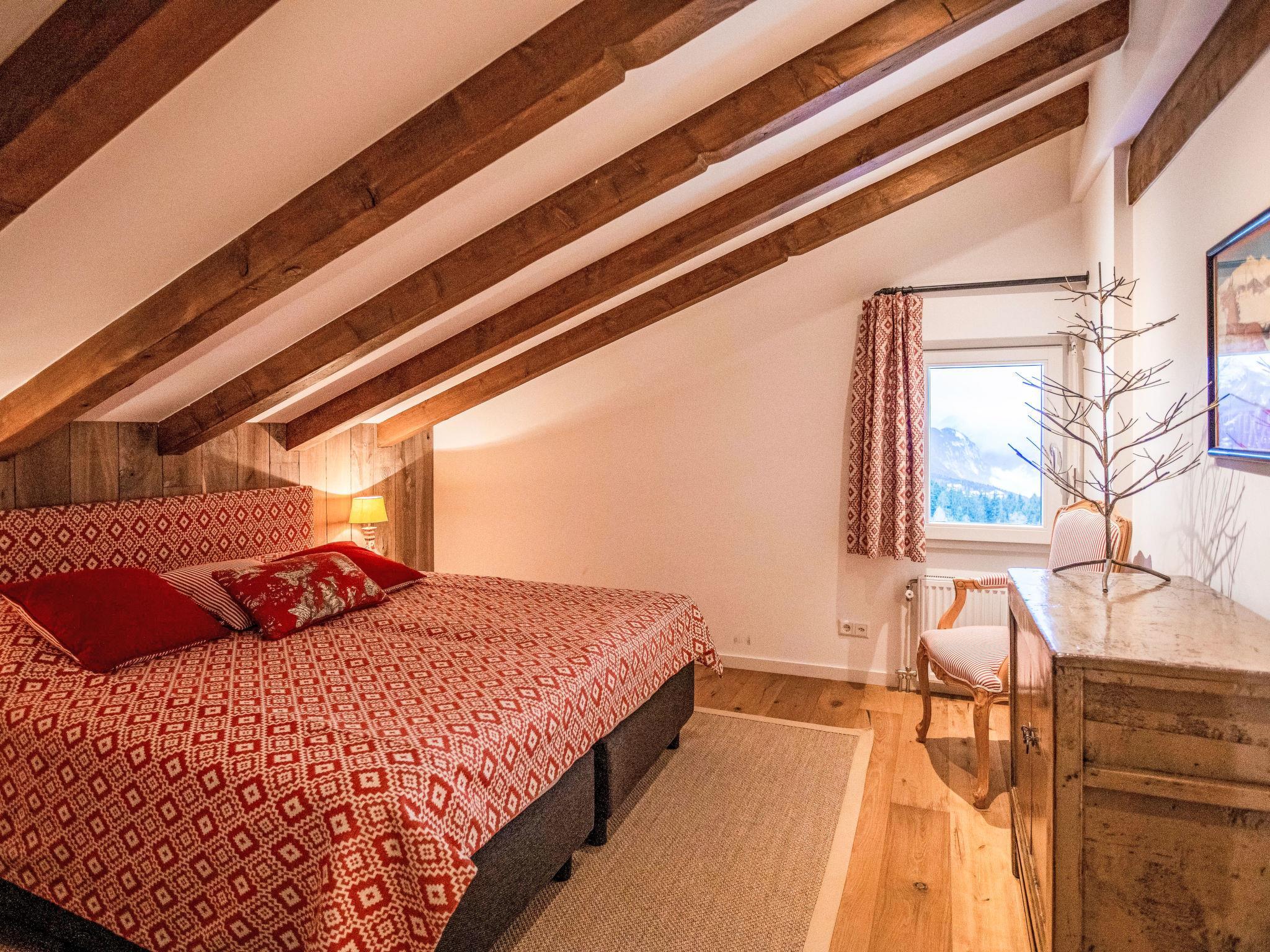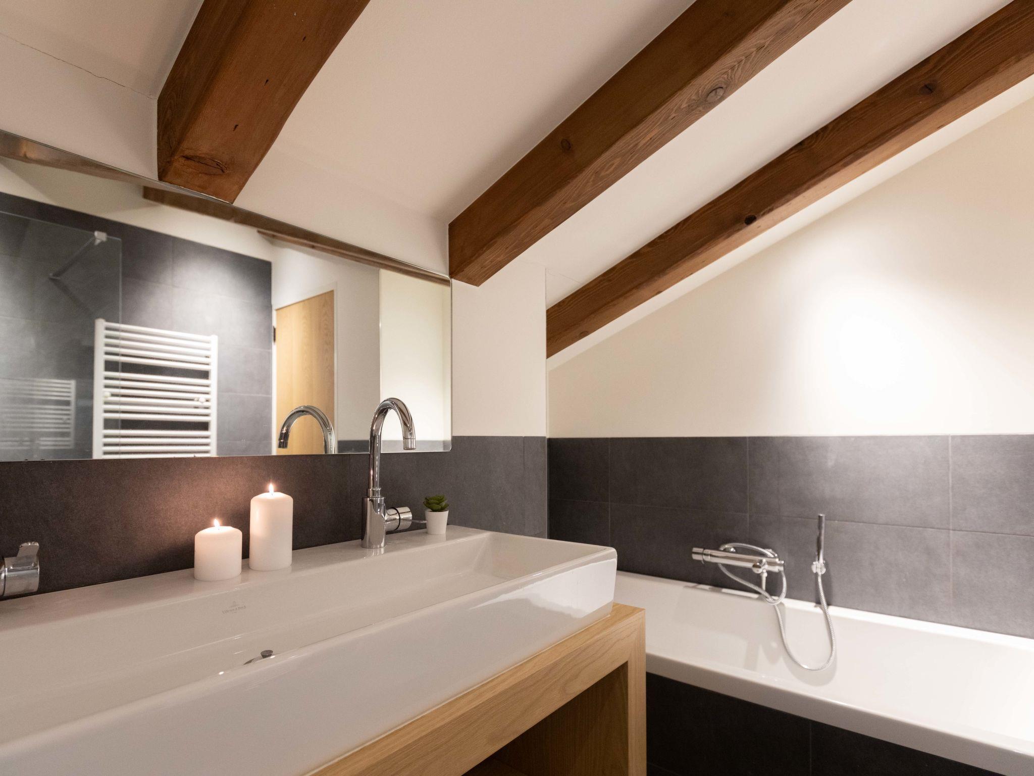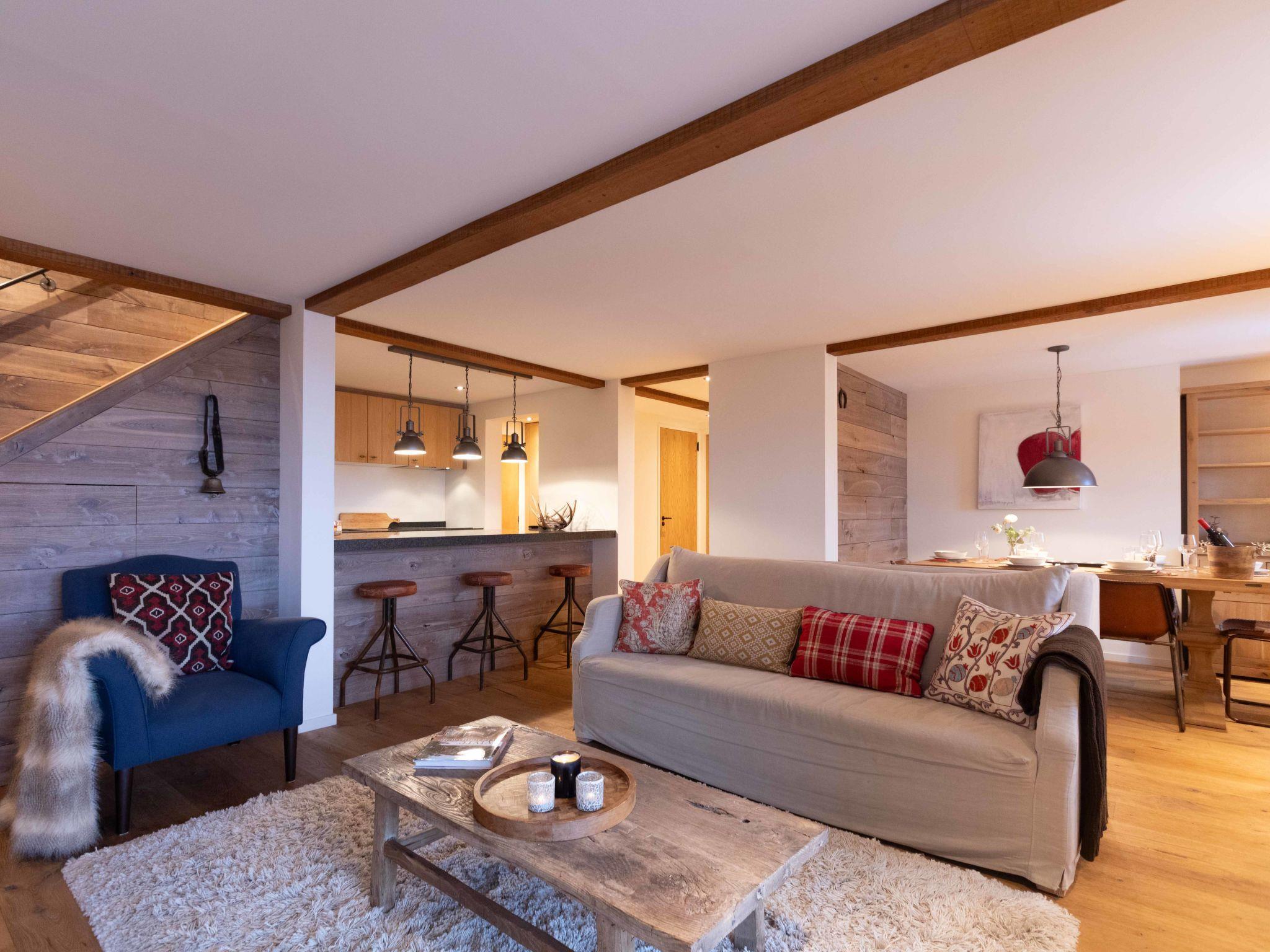 "Christina 9", 4-room penthouse 127 m2 on 2nd floor, south facing position. Object suitable for 6 adults + 1 child. Fully renovated, comfortable and modern furnishings: living/dining room with open-hearth fireplace (only for decoration), dining table, dining nook and TV (flat screen). Exit to the balcony, south facing position. 1 room with 2 beds (90 cm, length 200 cm), shower. Exit to the balcony, south facing position. Open kitchen (oven, dishwasher, 4 induction hot plates, toaster, kettle, microwave, freezer, electric coffee machine, Capsules for coffee machine (Nespresso) extra, raclette grill, fondue Set (cheese)) with bar. Sep. WC. Upper floor: 1 room with sloping ceilings, without wardrobe with 2 beds (90 cm, length 200 cm), 1 sleeping facility (1 x 80 cm, length 170 cm). 1 room with sloping ceilings, without wardrobe with 2 beds (90 cm, length 200 cm). Bath/shower/WC. 2 small balconies, south facing position. Terrace furniture. Very beautiful panoramic view of the mountains. Facilities: hair dryer. Garage space n 9 (1 car), height 190 cm. Please note: non-smokers only. No lift.