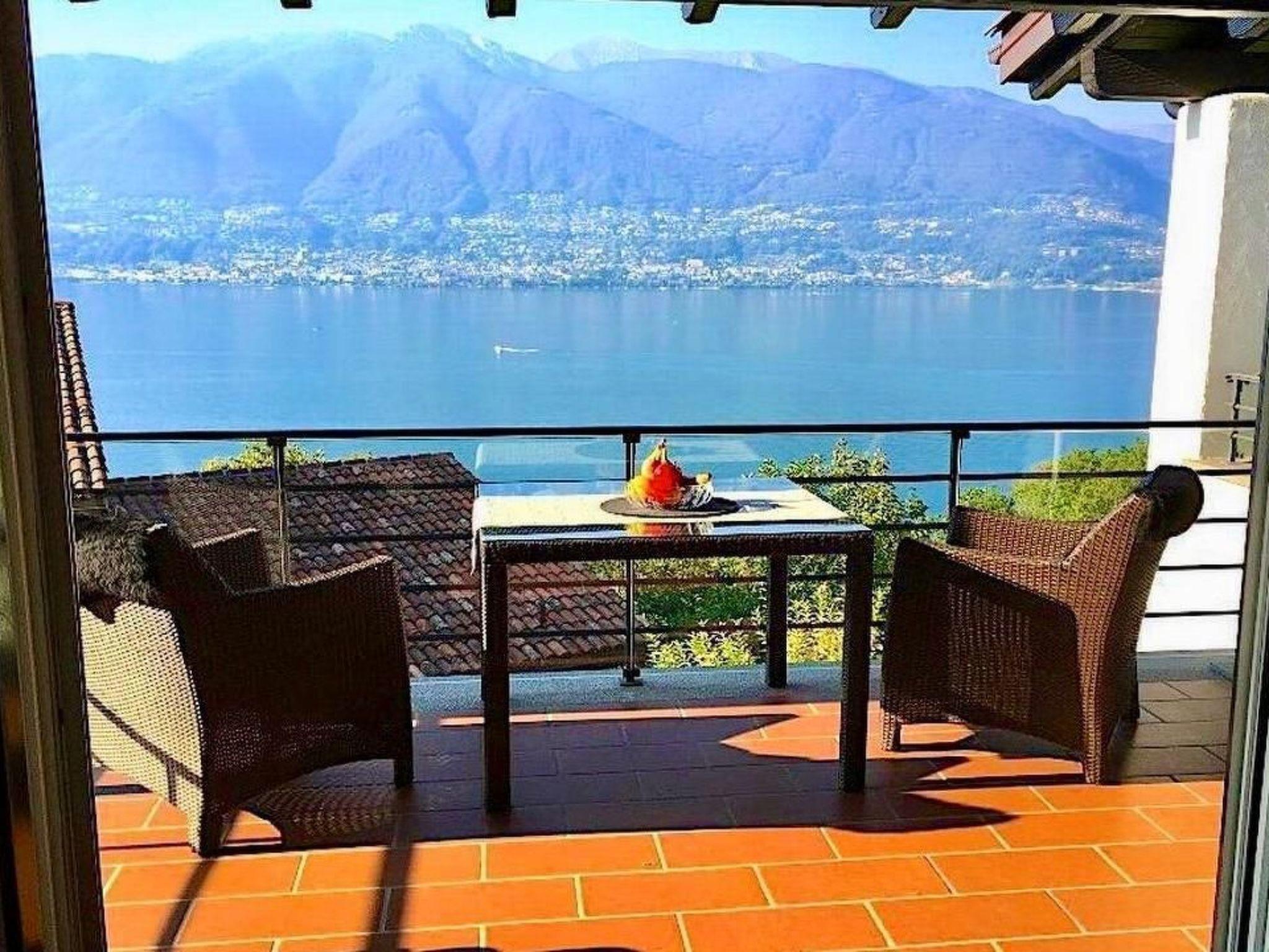 The outdoor area of the flat with its covered terrace is the ideal place to relax. Here you can enjoy the breathtaking lake view and the impressive view of the mountain peaks of Ticino. Lounge furniture ensures that you can experience the evening sun in all its splendour. In addition, the park-like, well-tended garden with pool, sun loungers and other leisure facilities provides you with a comfortable place to spend time outdoors.