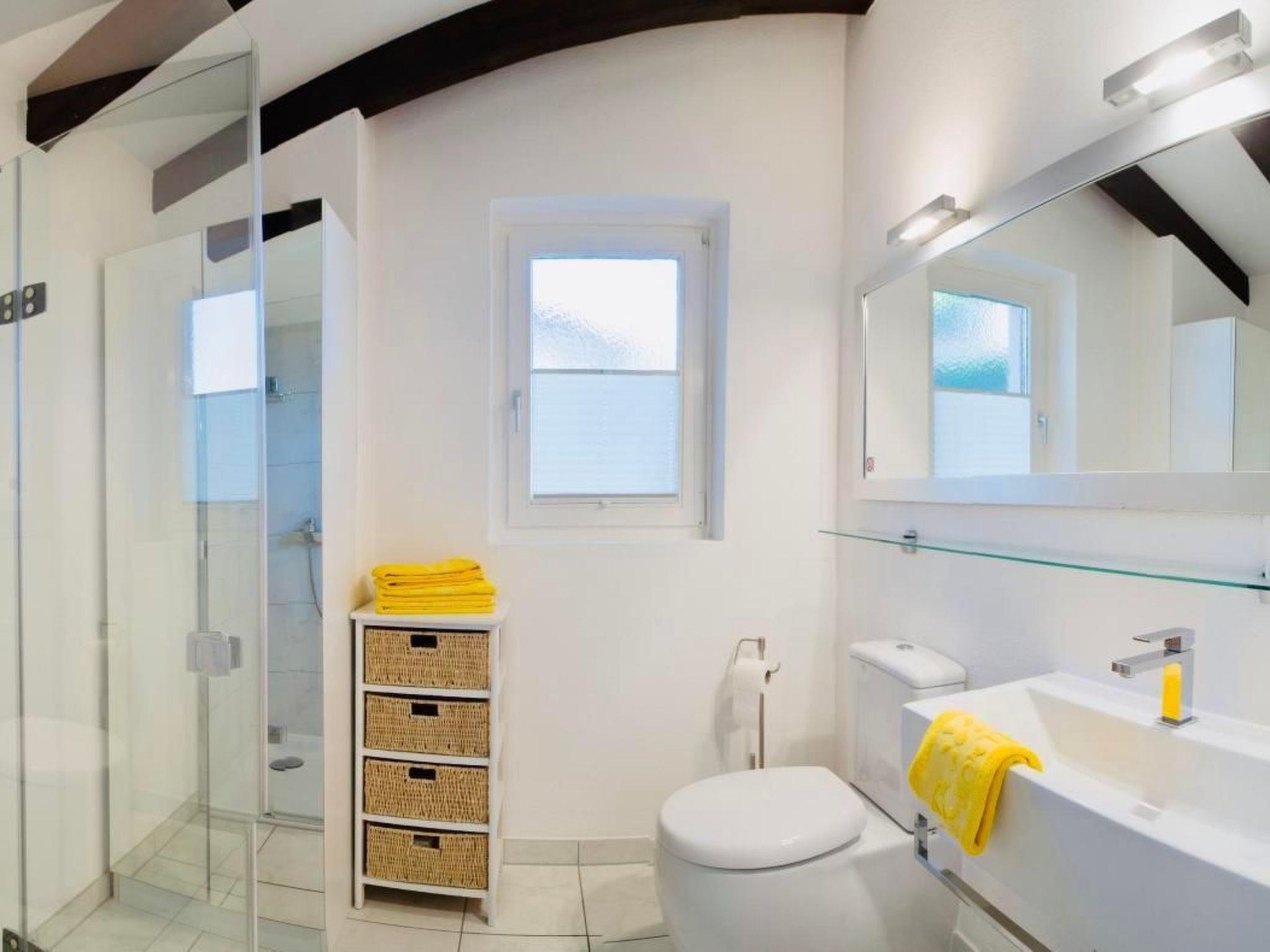 Upon entering the flat, you will find a modern kitchen with every conceivable convenience, including a ceramic hob, oven, fridge with freezer compartment and even a Nespresso machine. The bright living room with comfortable leather sofa, relaxing armchair and a round glass table invites you to linger, while you can enjoy the sunlight through the panoramic window with pleated insect screen and the side windows. Comfort and functionality are perfectly combined here.