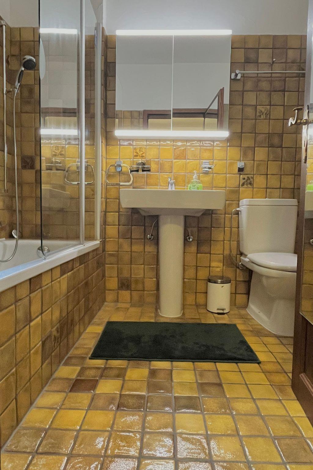 The spacious bathroom with window is fully equipped with bathtub and integrated shower, WC and hairdryer.
