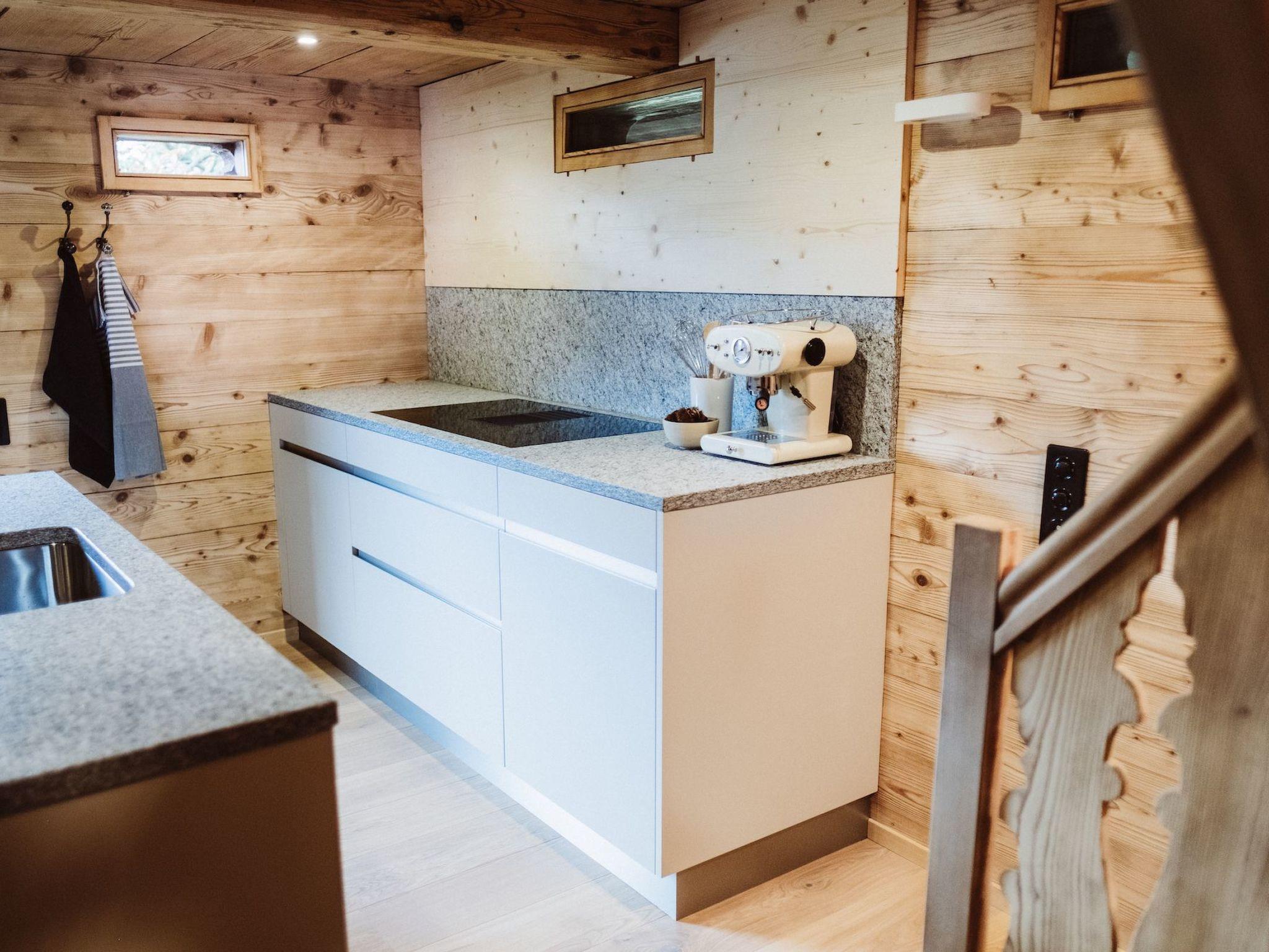 Furthermore, a narrow and slightly steep staircase leads to a sleeping gallery and a bathroom. From the gallery, you can enjoy a charming view of the open-plan living area.