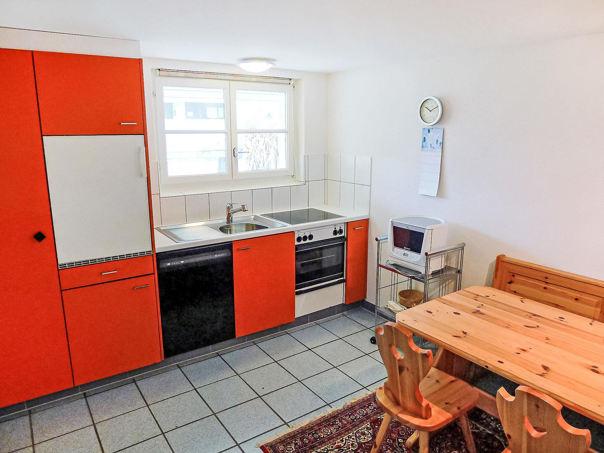 1-room apartment 31 m2, on the ground floor. Practical and cosy furnishings: 1 room 17 m2 with 1 double bed and satellite TV (flat screen). Exit to the patio. Kitchen-/living room (oven, dishwasher, 4 ceramic glass hob hotplates, microwave) with dining table. Shower/WC. Patio 8 m2, south facing position. Terrace furniture, conservatory. Partial view of the lake, the mountains and the resort. Facilities: Internet (WiFi, free). Parking at the house. Please note: non-smokers only.