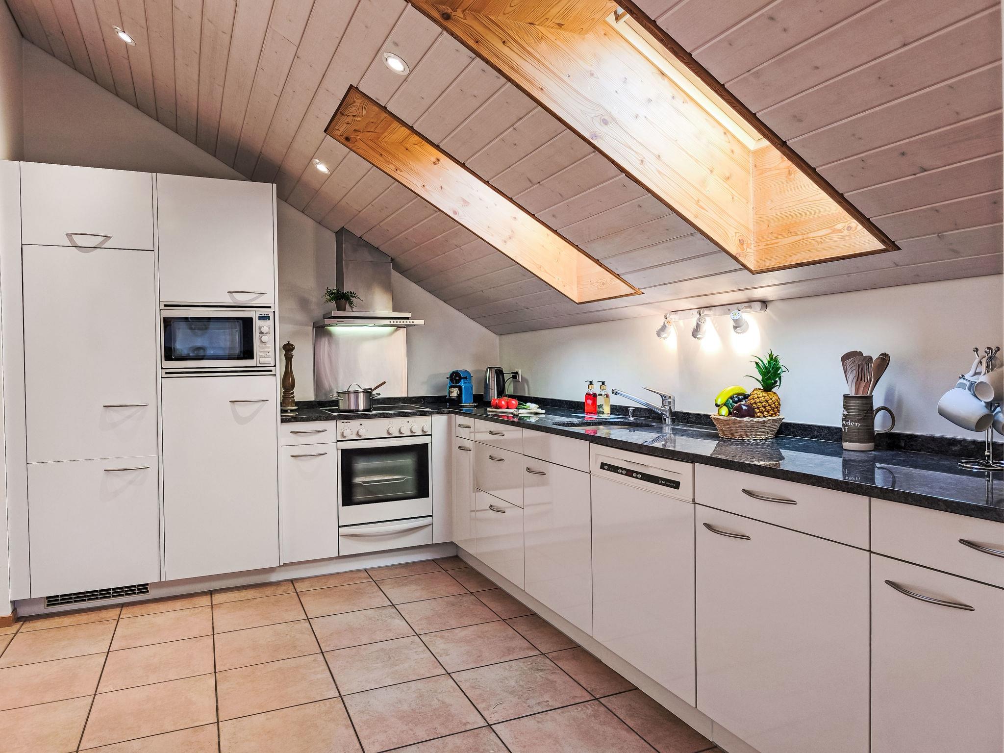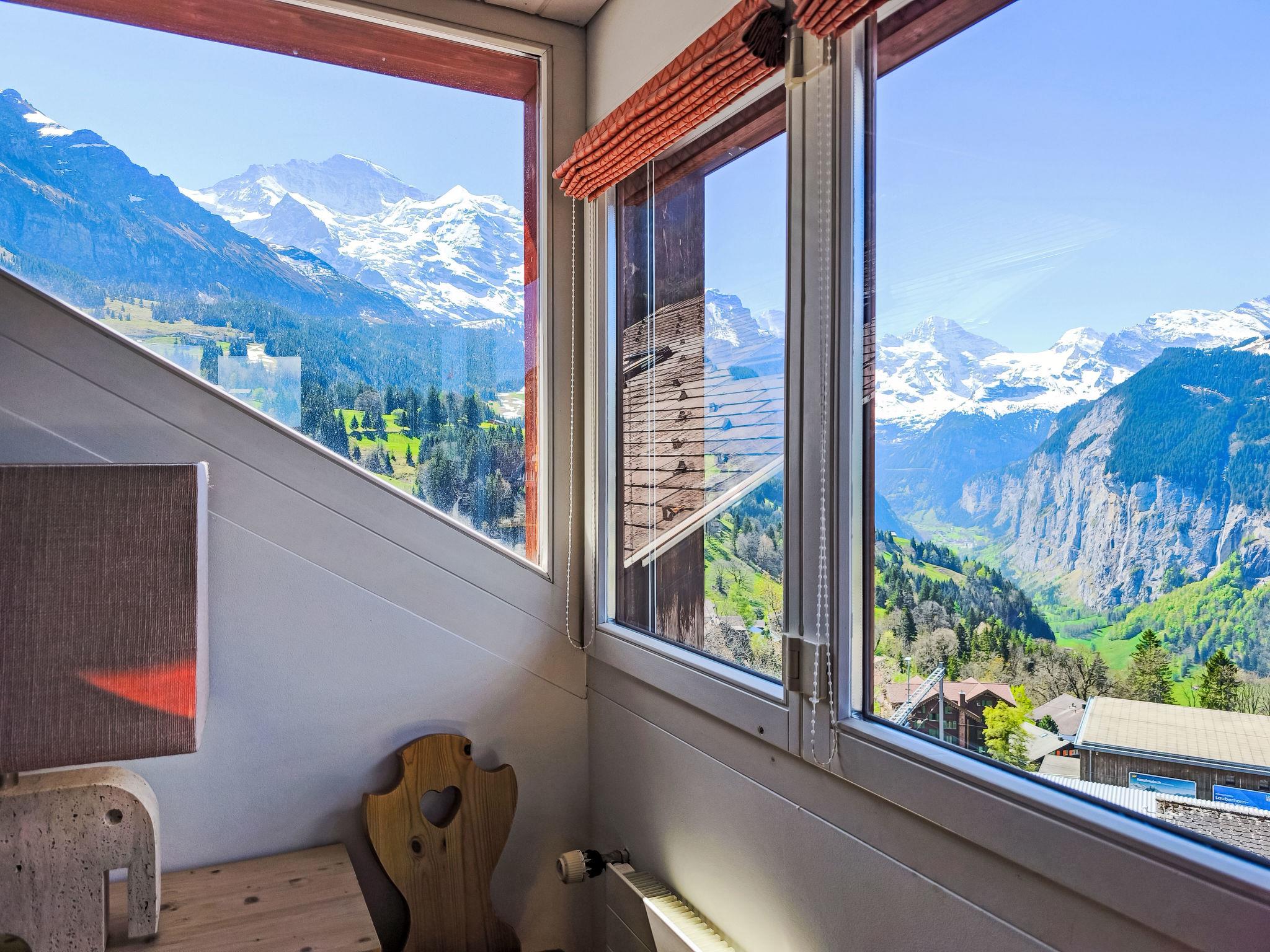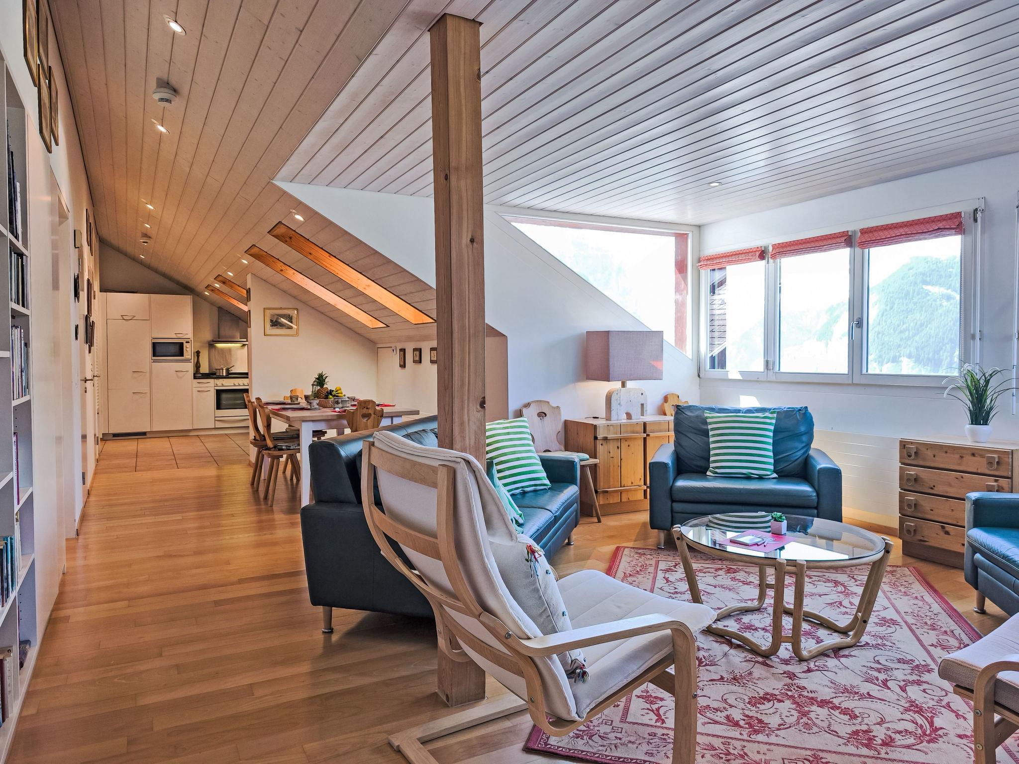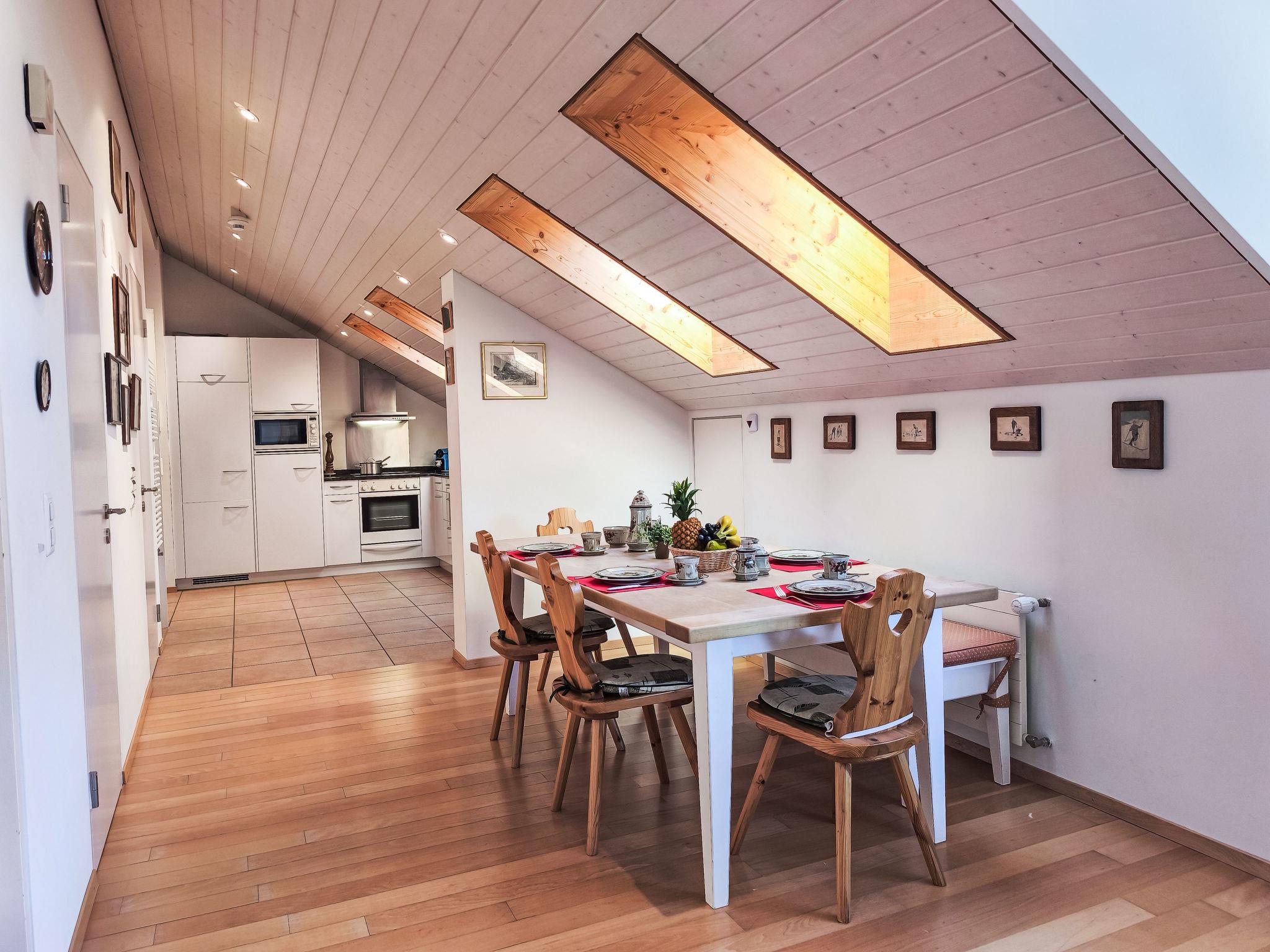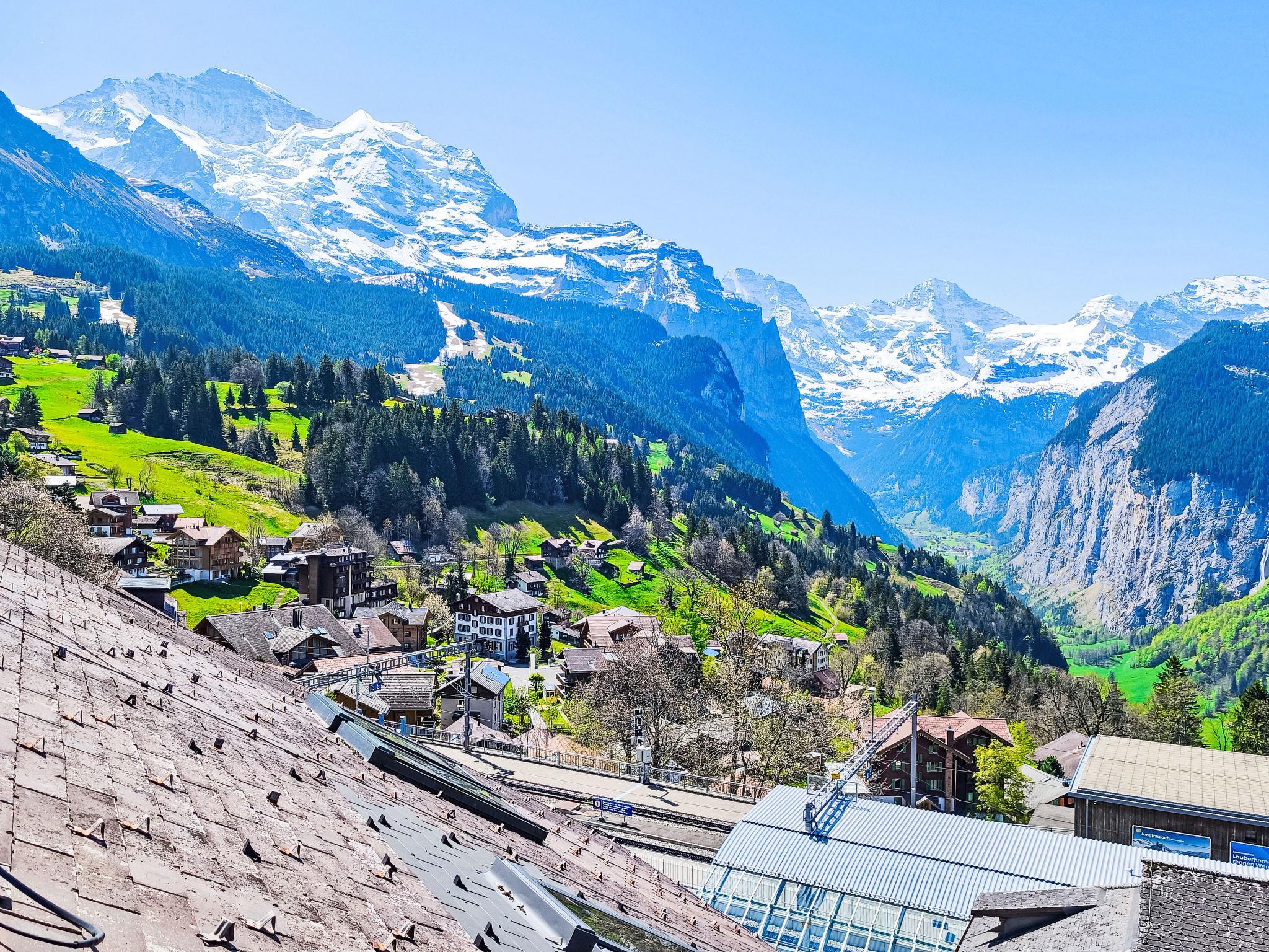 "Eiger Residence Top Floor Apt P", 3-room apartment 95 m2, on the top floor. Spacious and bright, partly with sloping ceilings, comfortable and modern furnishings: open living/dining room with panoramic window with cable TV. 1 room with 3 beds (90 cm, length 200 cm). 1 room with 2 beds (90 cm, length 200 cm). Large, open kitchen (oven, dishwasher, 4 ceramic glass hob hotplates, kettle, microwave, freezer, electric coffee machine, Capsules for coffee machine (Nespresso) extra, raclette grill, fondue Set (chinoise)). Bath/WC, shower/WC. Marvellous panoramic view of the mountains, the valley and Jungfrau. Facilities: washing machine, dryer, iron, hair dryer. Internet (WiFi, free). Please note: suitable for families. Non-smokers only.