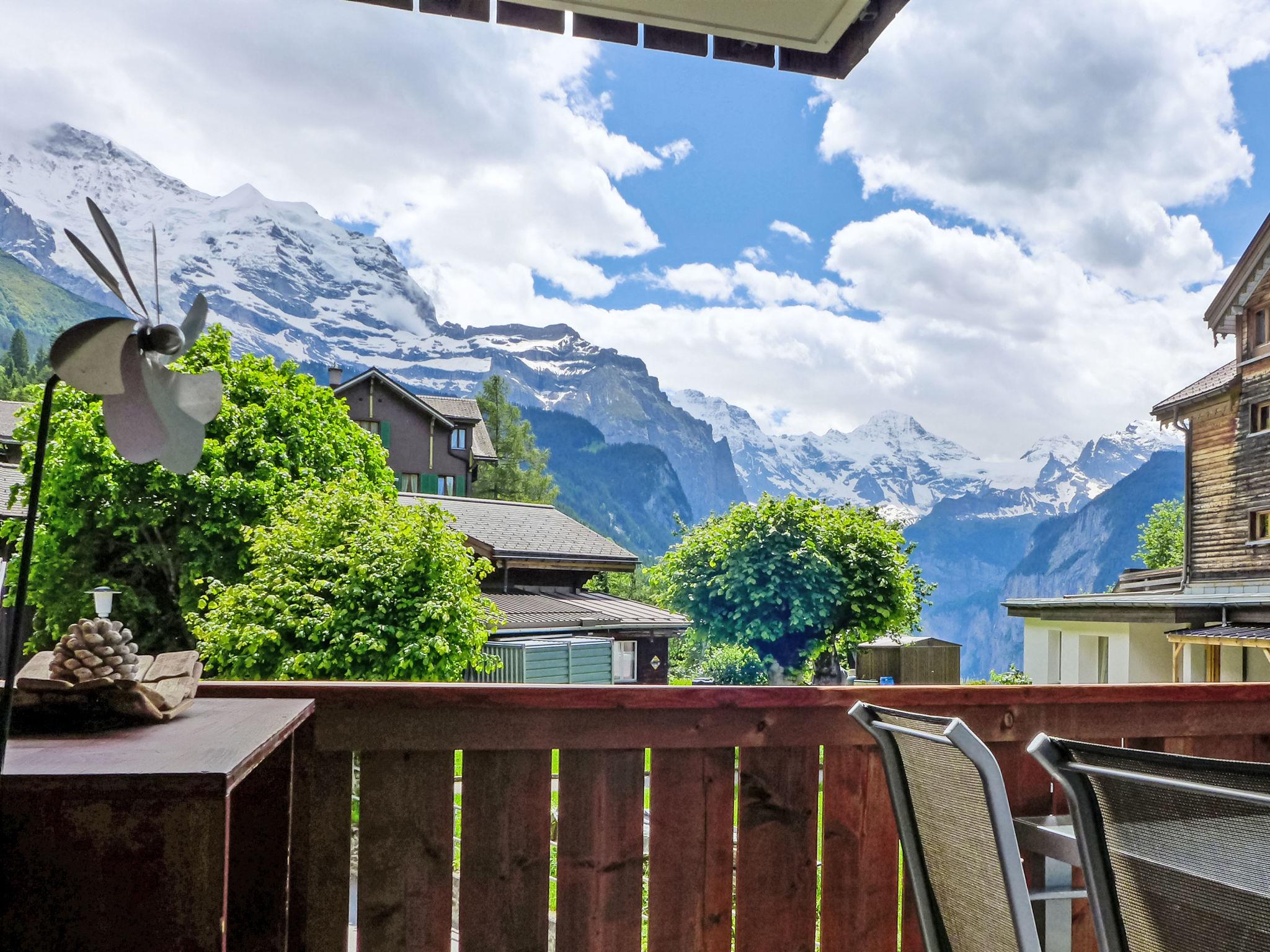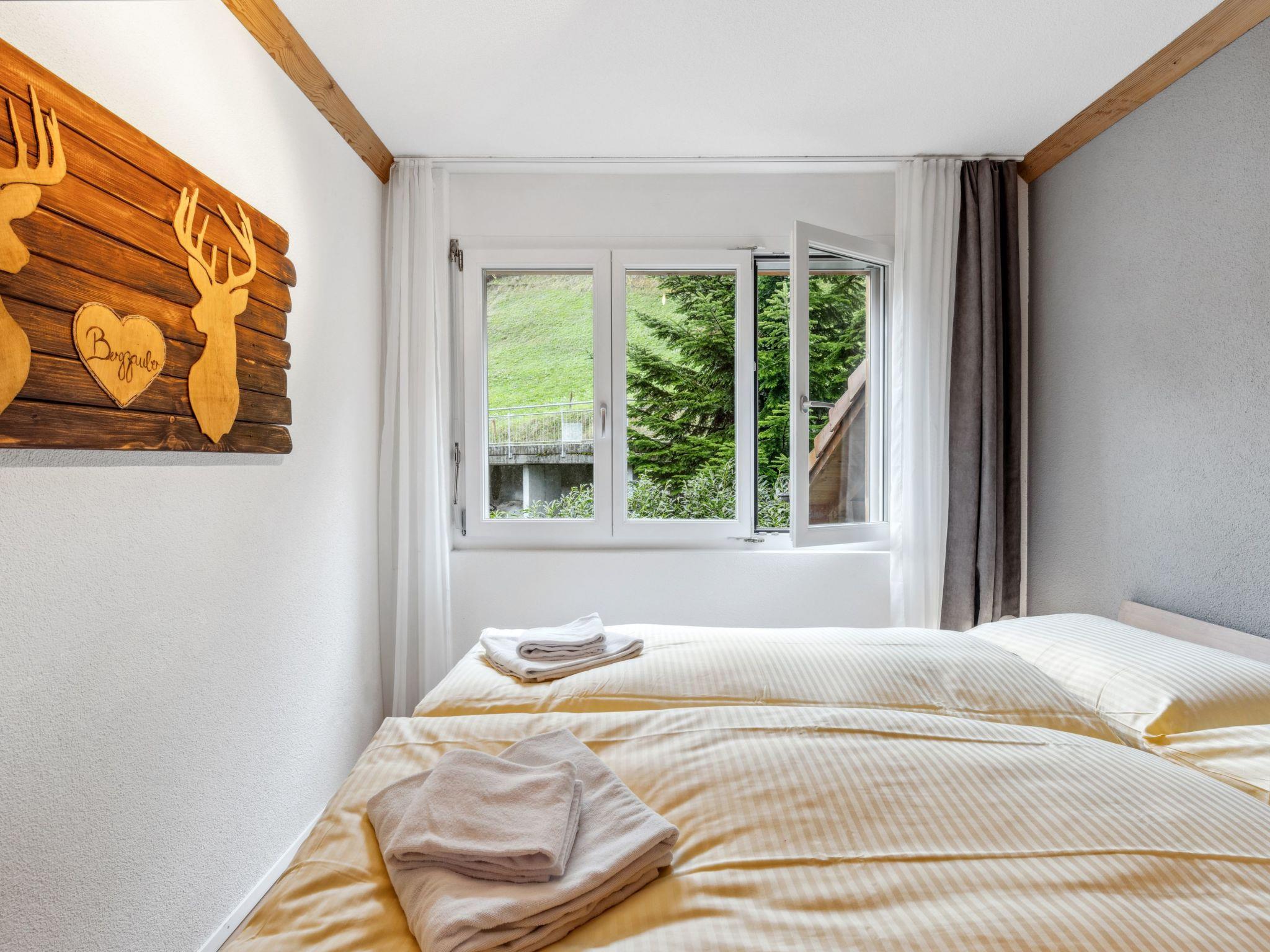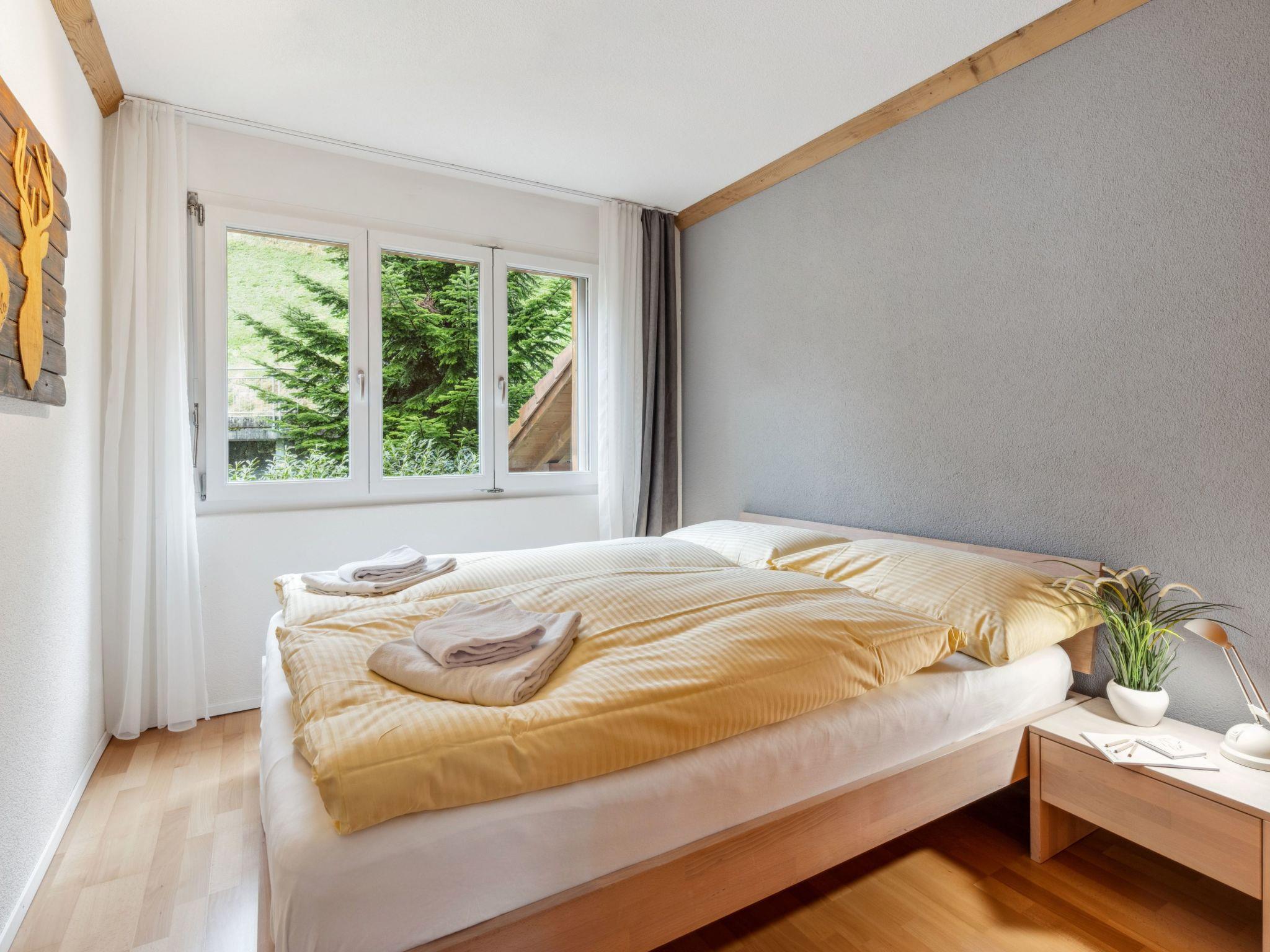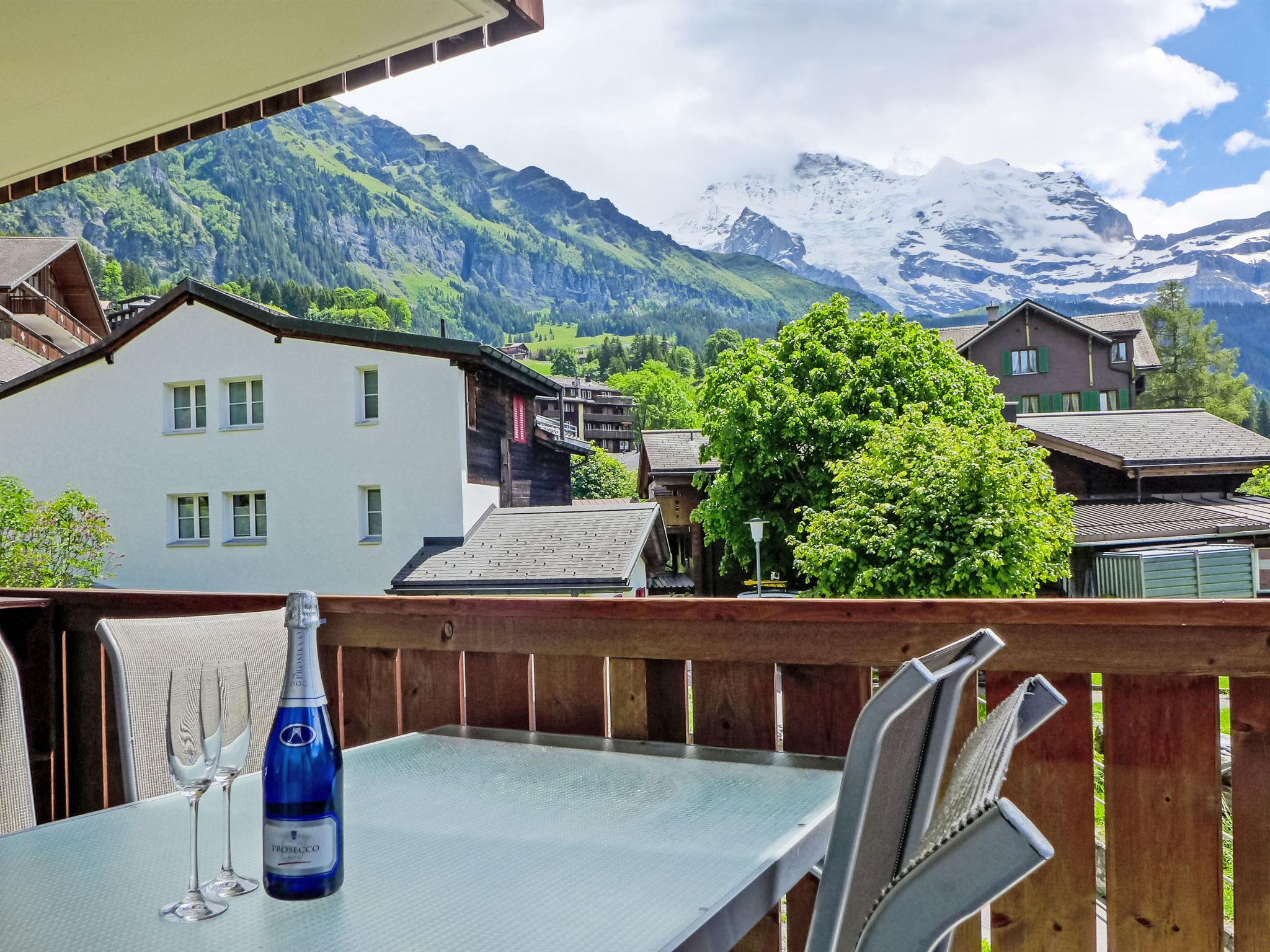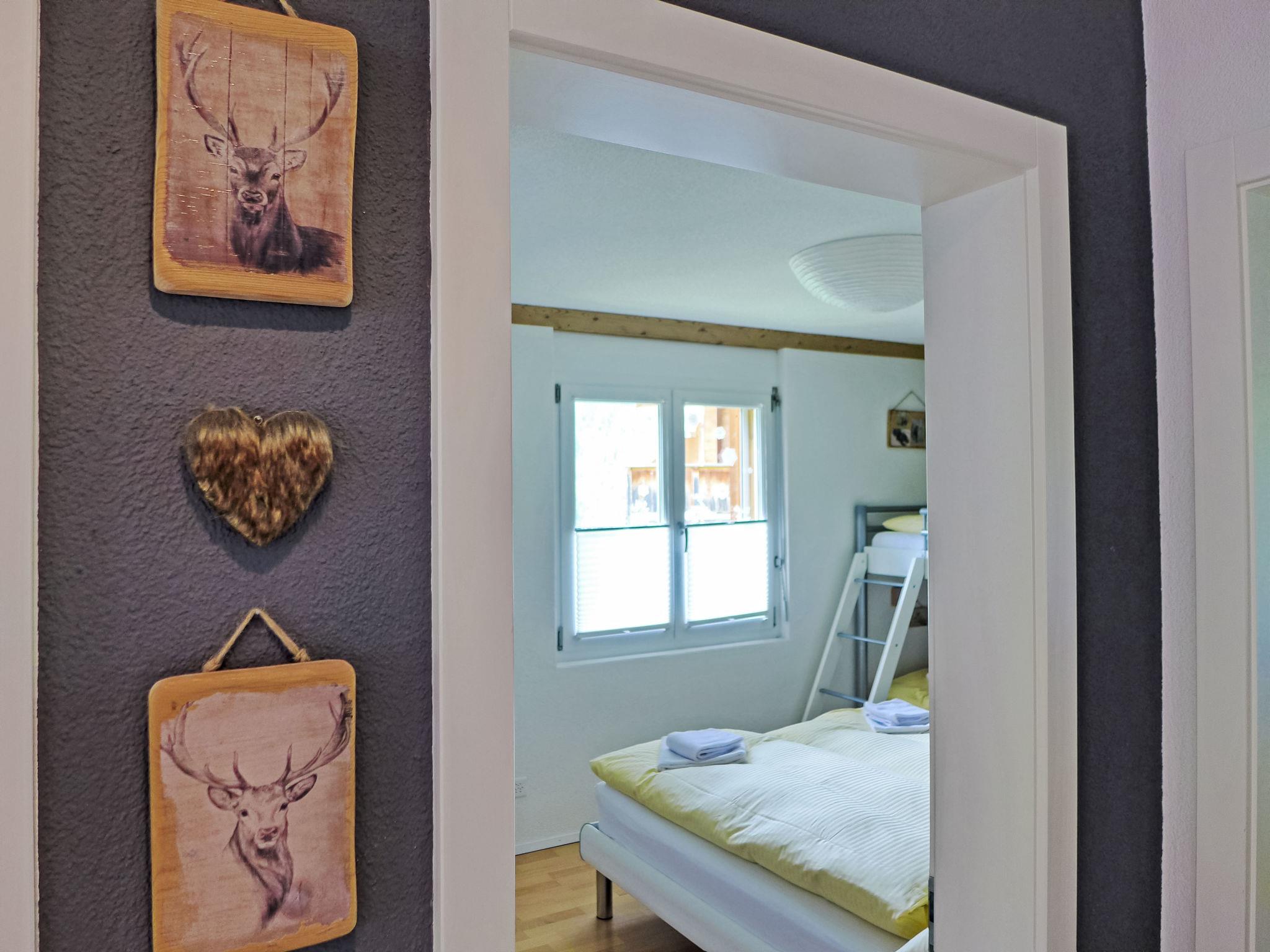 "Goldenhorn Apt.S", 3-room apartment 70 m2 on 2nd floor. Spacious and bright, comfortable and tasteful furnishings: living/dining room with Scandinavian wood stove and cable TV. Exit to the balcony. 1 room with 1 double bed (160 cm, length 200 cm). 1 room with 1 x 2 bunk beds (90 cm, length 190 cm), 1 double bed (160 cm, length 200 cm). Large, open kitchen (oven, dishwasher, 4 ceramic glass hob hotplates, toaster, kettle, electric coffee machine, Capsules for coffee machine (Nespresso) extra, fondue Set (cheese)). Shower/WC. Balcony, south facing position. Balcony furniture. Marvellous view of the mountains and Jungfrau. Facilities: hair dryer, logs (extra). Internet (WiFi, free). Please note: suitable for families. Non-smokers only.