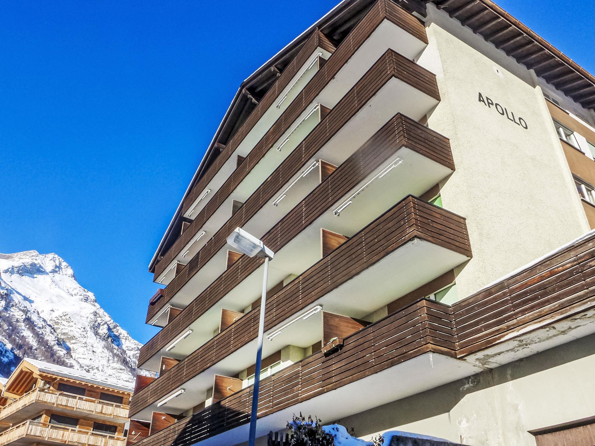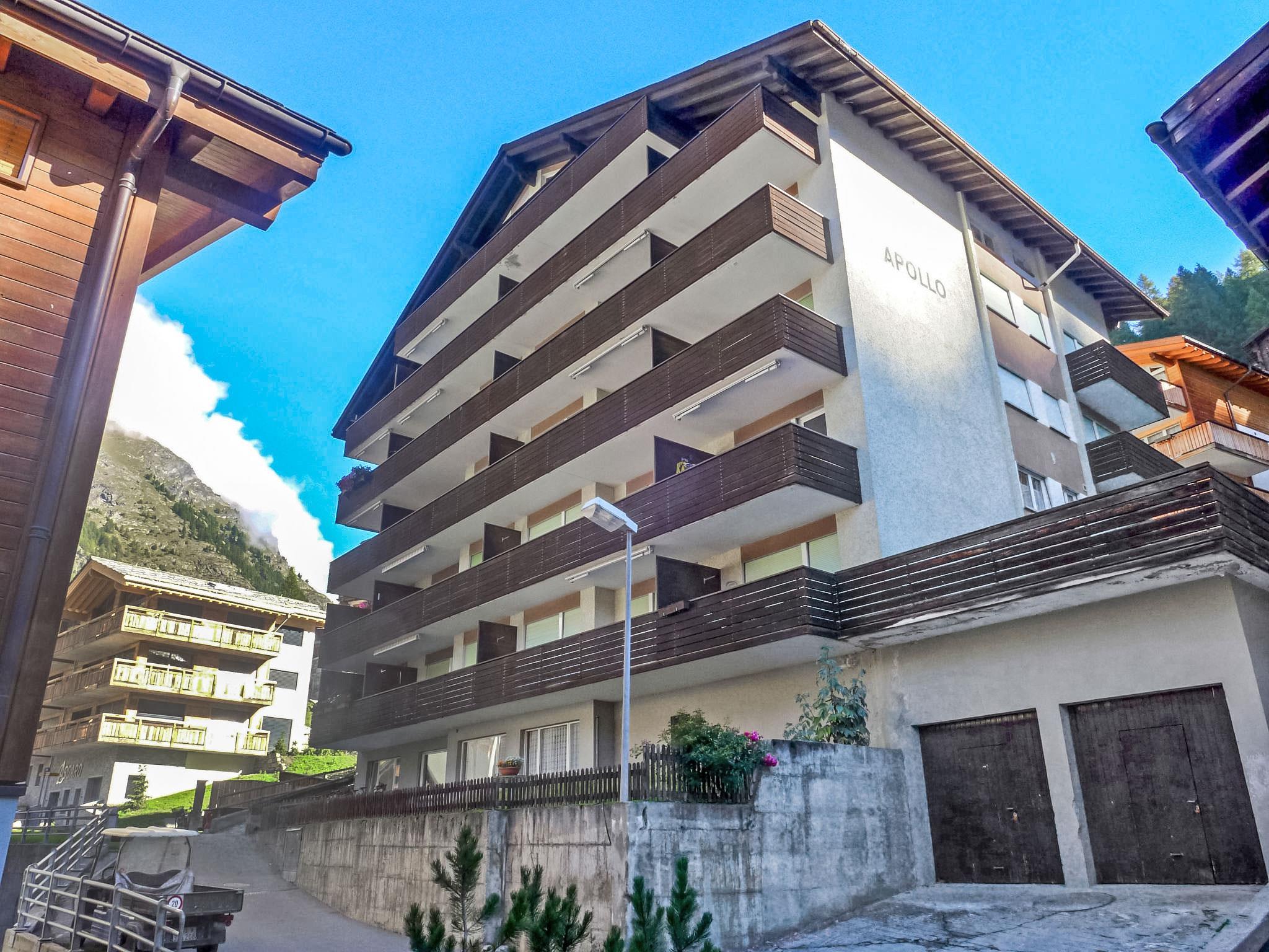 Large apartment house "Apollo", 7 storeys. In the district of Wiesti, 700 m from the centre, in a quiet position. In the house: lift, storage room for skis, central heating system. Supermarket, restaurant 150 m, bakery 600 m, bicycle rental 650 m, 10 minute walk to the centre, bus stop "Wiestibrücke" 350 m, railway station "Bahnhof Zermatt" 700 m. Mountain railway 550 m, ski rental, ski bus stop 350 m, ski school, children's ski school 950 m. The keys‘ handover takes place by the agency Interhome in Zermatt.