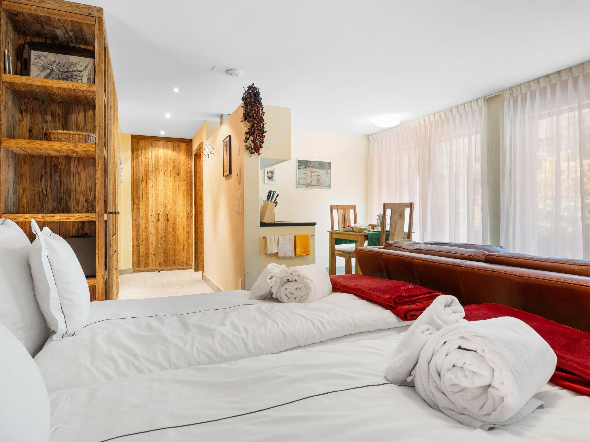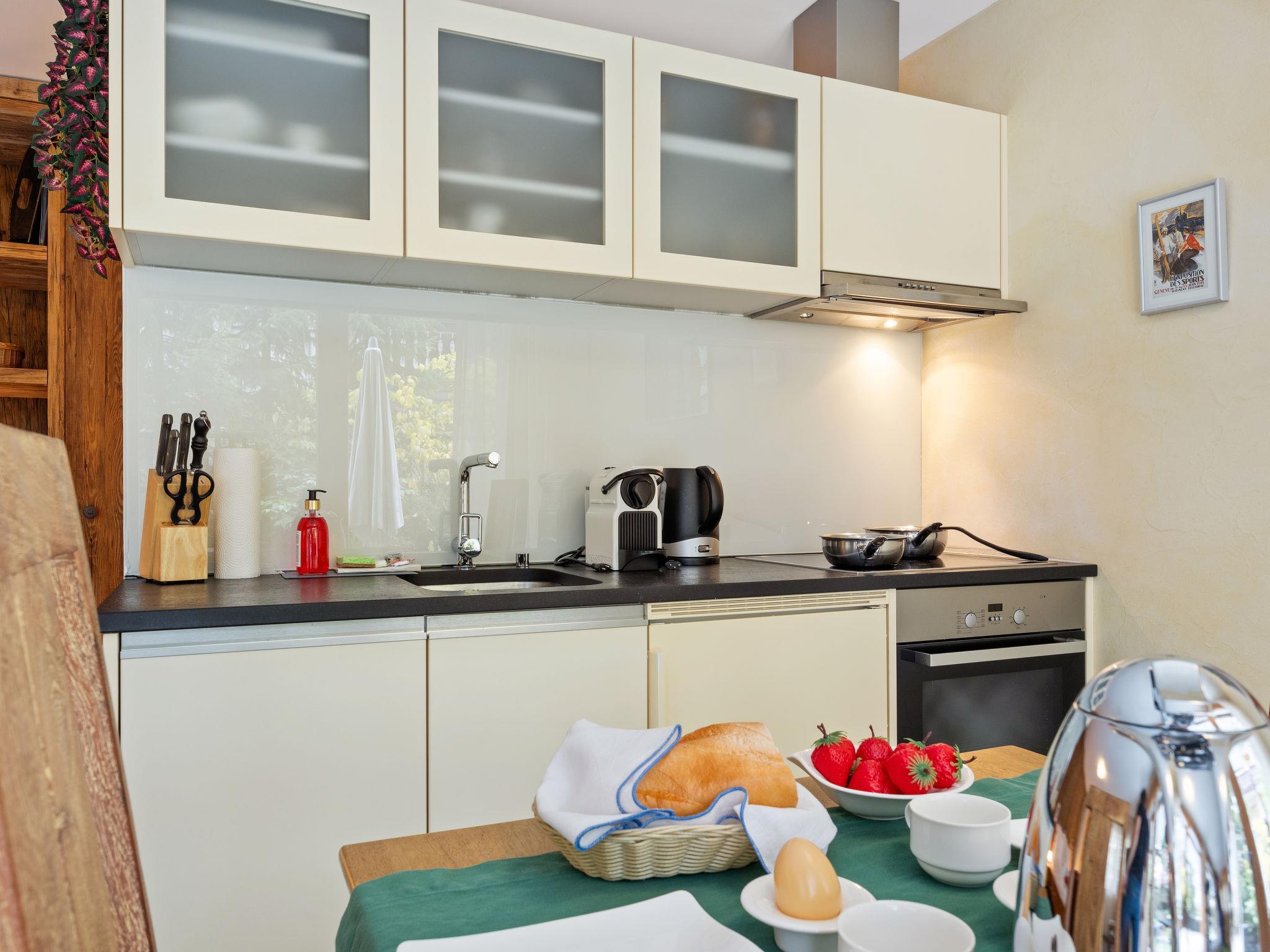 1-room apartment 35 m2, on the ground floor. Very luxurious and cosy furnishings: open living/sleeping room with 1 double bed, dining table, TV, CD-player, hi-fi system and DVD. Exit to the terrace. Open kitchen (oven, dishwasher, 4 induction hot plates, toaster, kettle, freezer, electric coffee machine, Capsules for coffee machine (Nespresso) extra, raclette grill, fondue Set (cheese)). Shower/WC. Small terrace, south facing position. Terrace furniture. Facilities: safe, hair dryer. Internet (WiFi, free). Please note: non-smokers only.