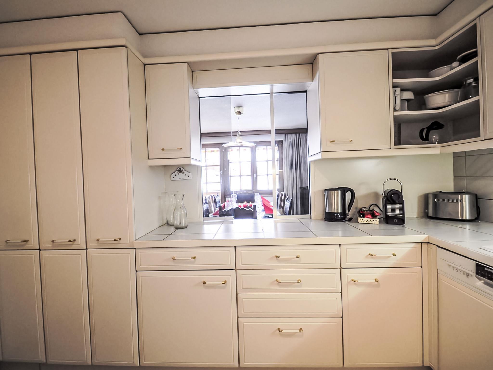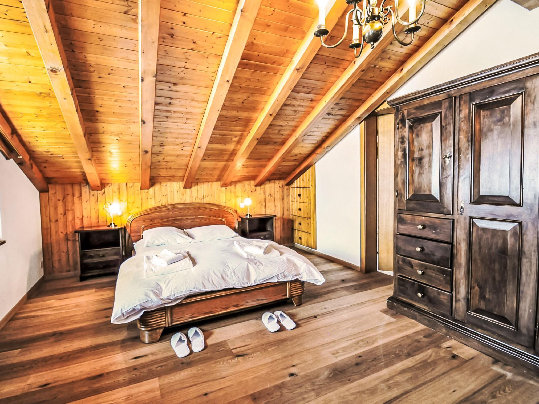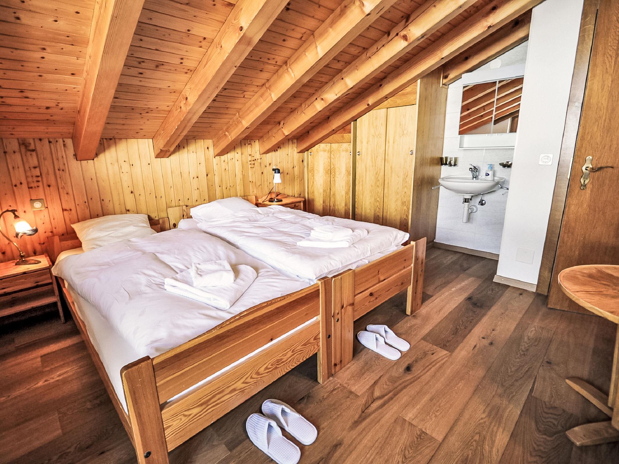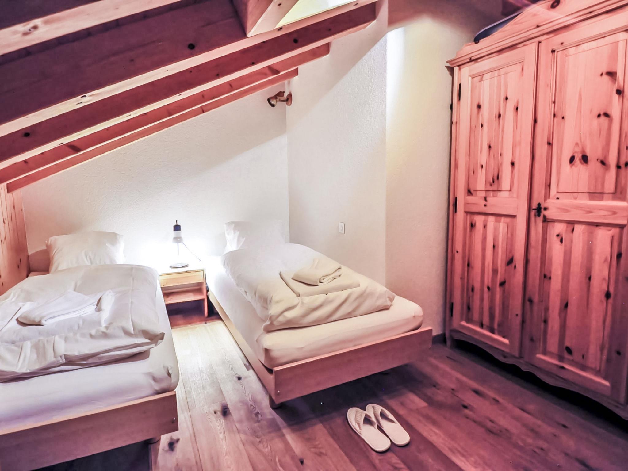 5-room penthouse 114 m2 on 2 levels on 3rd floor, south facing position. Spacious, beautiful and cosy furnishings: living room with open-hearth fireplace, dining table, TV, CD-player and DVD. Exit to the balcony, south facing position. Large kitchen (oven, dishwasher, 4 ceramic glass hob hotplates, toaster, kettle, microwave, freezer, electric coffee machine, combination microwave, fondue Set (cheese)). Shower/WC, sep. WC. Heating. Upper floor: with sloping ceilings, 1 double bedroom with 1 double bed (1 x 160 cm, length 200 cm), bath/WC. With sloping ceilings, 1 room with 2 beds (90 cm, length 200 cm). With sloping ceilings, 1 room with 1 bed (90 cm, length 200 cm). Exit to the balcony, north facing position. With sloping ceilings, 1 room with 2 beds (90 cm, length 200 cm), hand-basin. Exit to the balcony. Parquet floors. 2 balconies, south facing position and north facing position. Balcony furniture. Very beautiful view of the Matterhorn. Facilities: hair dryer. Internet (WiFi). Please note: non-smokers only.