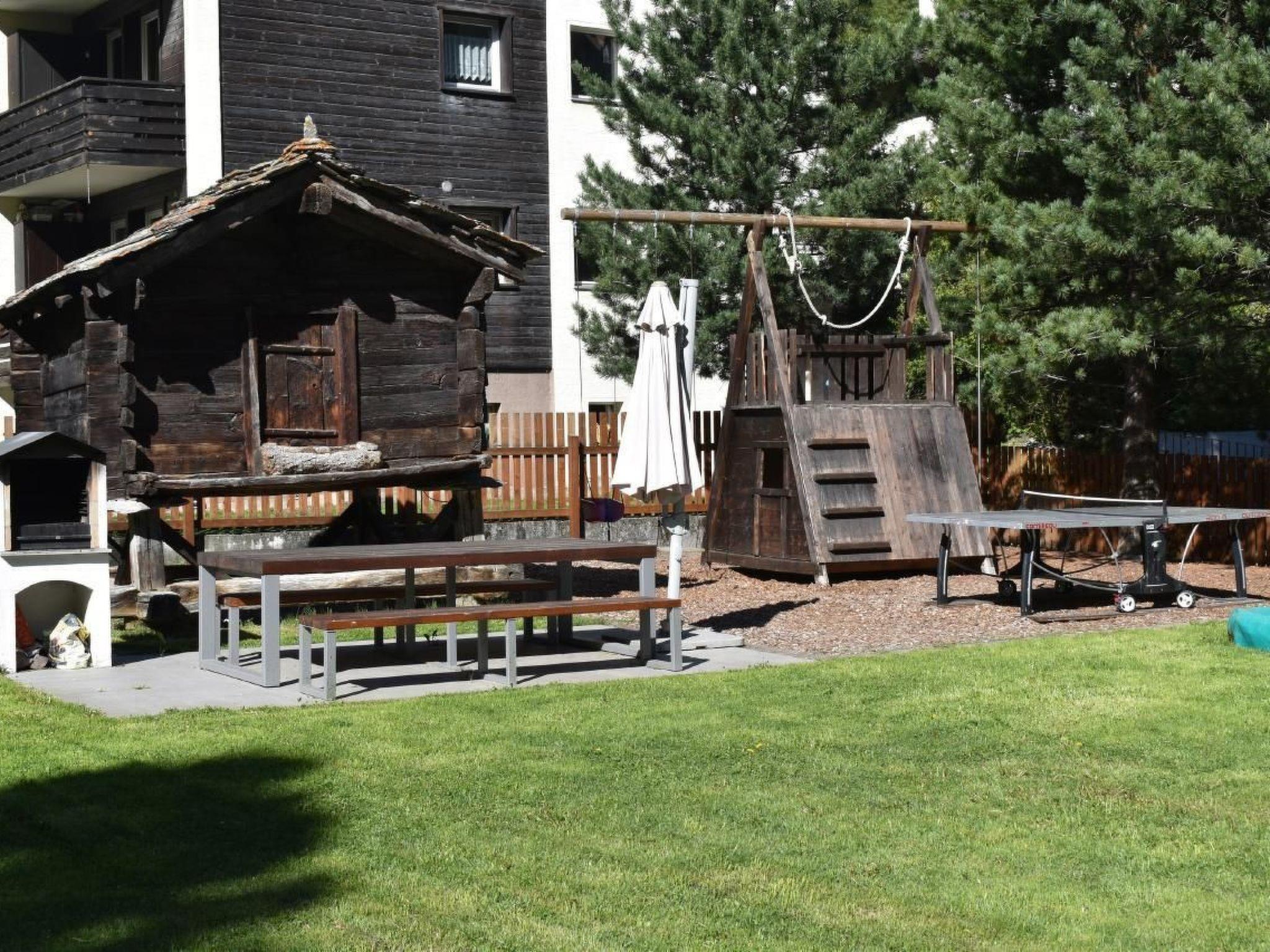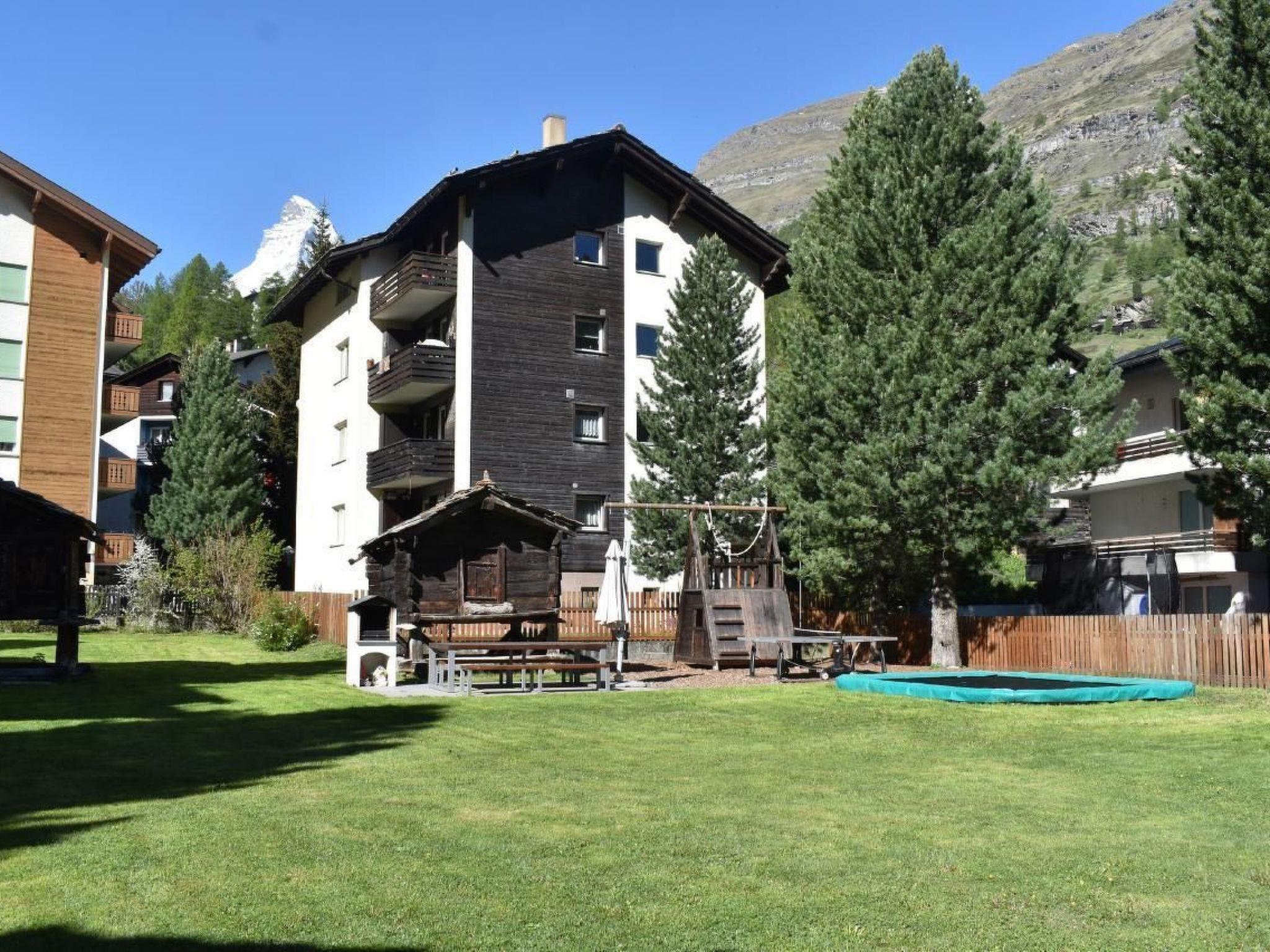 The Matterhorngruss holiday apartment house is situated in the heart of the village of Zermatt and enjoys a very central but quiet location (a 3-minute walk from the church and nearest bus stop). Here we rent the very spacious holiday flat "Castor" for 2-7 persons. 4 1/2 - room apartment for 2-8 people. Kitchen with dish-washer, dining table and adjoining living-room, 3 twin bedrooms; bathroom/toilet, shower/toilet, radio, DVD, cable-TV and telephone, free internet WLan. All rooms have a balcony, kitchen and living room with a view of the Matterhorn. There is a large, child-friendly playground and relaxation area in front of the house with a climbing wall, table tennis, trampoline, swing and barbecue with seats. It is the ideal accommodation in Zermatt for families and small groups.All rooms have a balcony, kitchen and living room with a view of the Matterhorn.