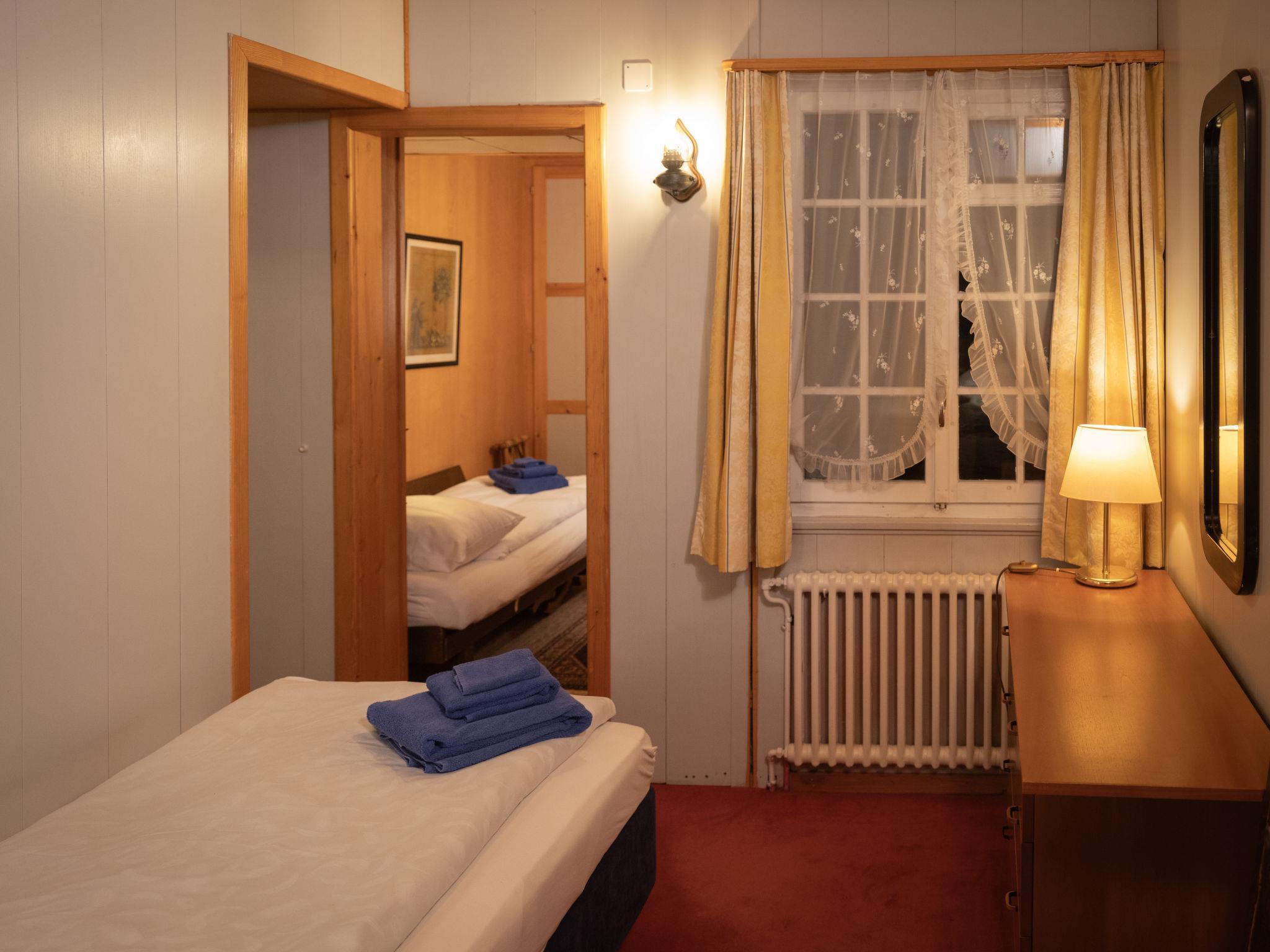 "Chalet Turquino / Apartment Marmotte", 4-room apartment 90 m2, on the ground floor, south-east facing position. Object suitable for 4 adults + 1 child. Simple and cosy furnishings: living room with open-hearth fireplace (only for decoration), TV. Exit to the balcony, east facing position and south facing position. 1 room with 2 beds (90 cm, length 200 cm), hand-basin. Walk-through room with 1 bed (90 cm, length 200 cm), bath/WC. 1 room with 1 bed (90 cm, length 200 cm). 1 room with 1 bed (90 cm, length 200 cm). Kitchen (oven, dishwasher, 4 ceramic glass hob hotplates, microwave, freezer, electric coffee machine). Bath/WC, sep. WC. Heating. Balcony, east facing position and south facing position. Side view of the mountains. Facilities: Internet (WiFi). Please note: non-smokers only.