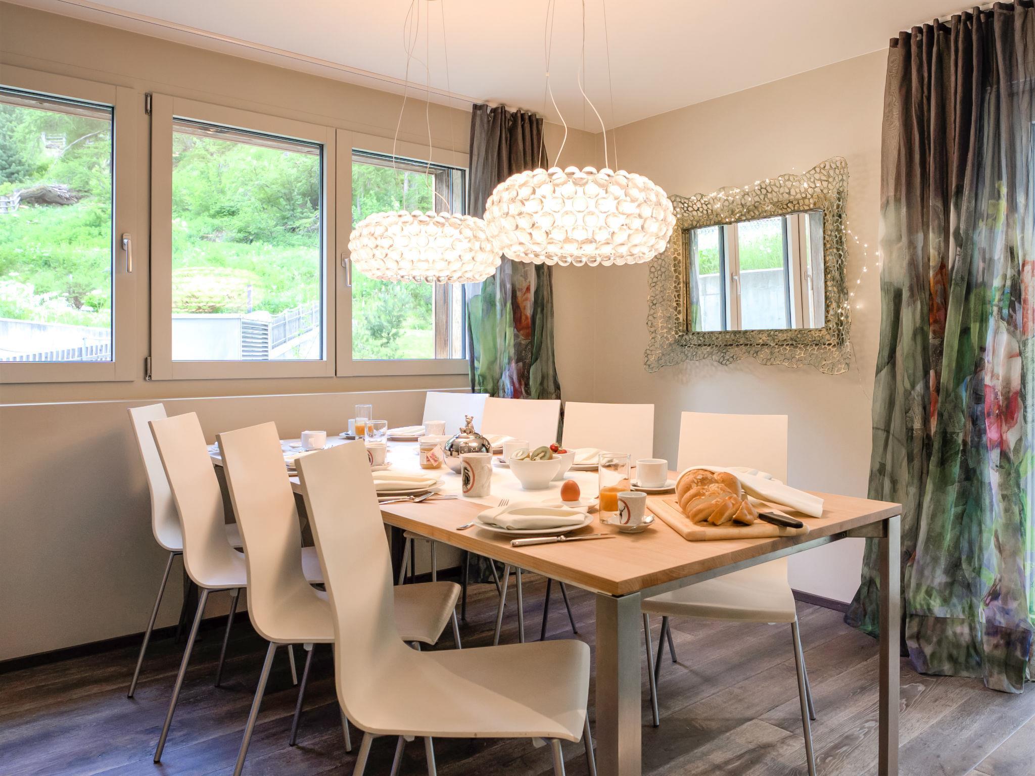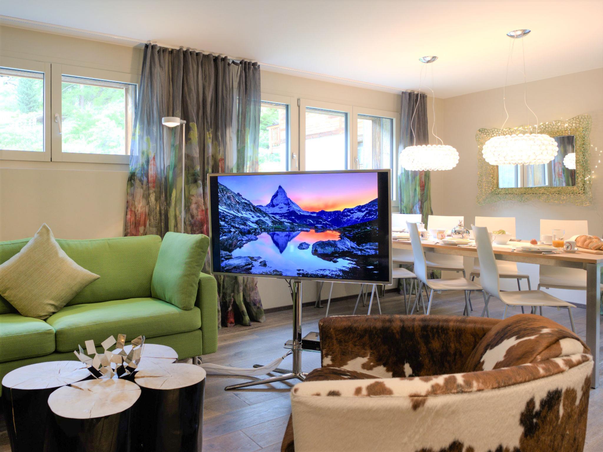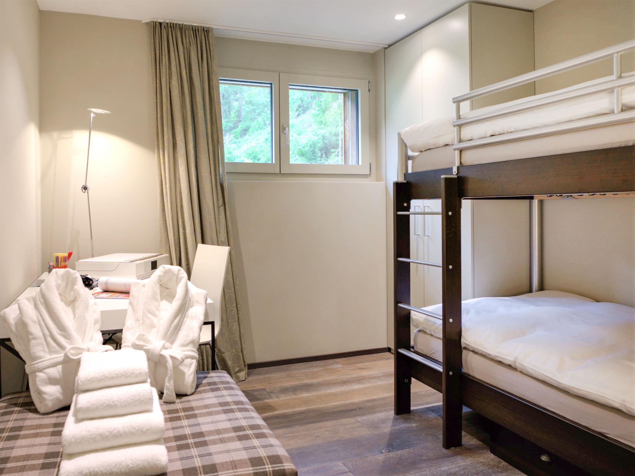 5-room apartment 120 m2 on 2 levels, on the ground floor. Object suitable for 6 adults + 2 children. Spacious and bright, modern and luxurious furnishings: on the lower ground floor: open living/dining room with TV. Open kitchen (oven, dishwasher, 4 ceramic glass hob hotplates, toaster, kettle, freezer, electric coffee machine, raclette grill, combination microwave, fondue Set (chinoise, cheese)) with dining table. Exit to the terrace. Upper floor: 1 double bedroom with 1 double bed (180 cm, length 200 cm). Exit to the balcony. 1 double bedroom with 1 double bed (180 cm, length 200 cm), shower/WC. 1 large double bedroom with 1 double bed (180 cm, length 200 cm), bath/shower/WC. Exit to the terrace. 1 children's room with 1 x 2 bunk beds (90 cm, length 200 cm). Shower/WC. Balcony, large terrace. Terrace furniture. Partial view of The Matterhorn. Facilities: safe, hair dryer. Internet (WiFi, free). Please note: non-smokers only.