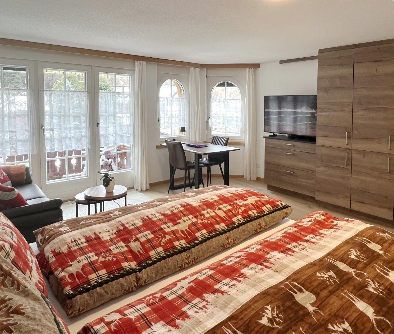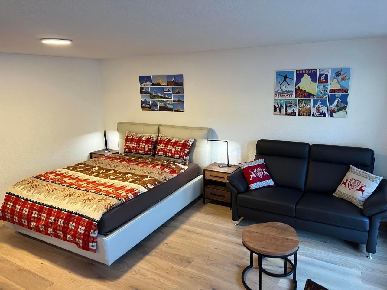 This charming one-room flat (43m2) in Zermatt offers a cosy and comfortable living atmosphere in the midst of the breathtaking mountain landscape. It was completely renovated in summer 2023. The studio is located in a well-kept apartment building and offers a fantastic view of the majestic Matterhorn.