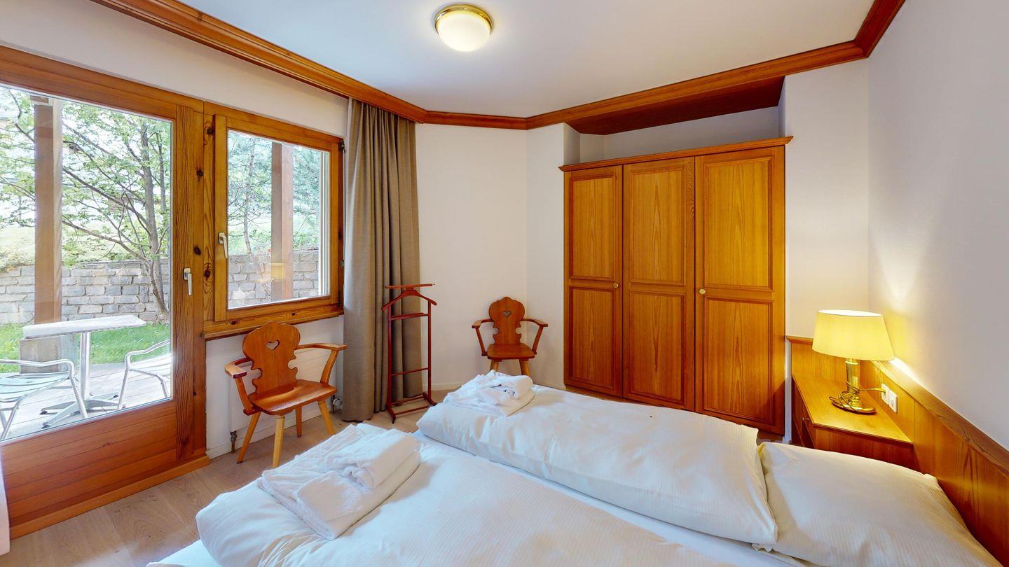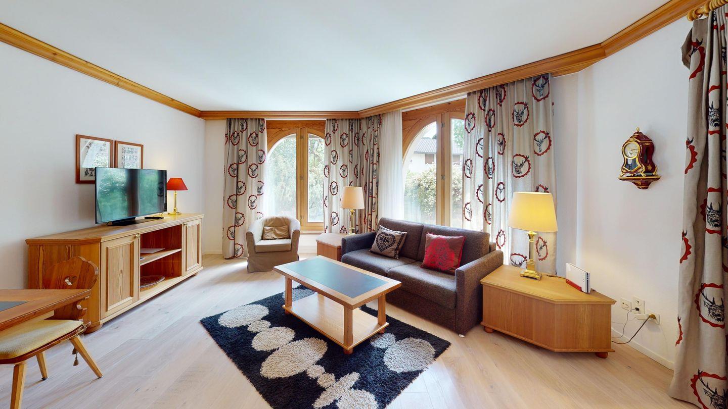 Diese gepflegte 2.5-Zimmer-Wohnung befindet sich im Erdgeschoss der Residenza Belvair und bietet direkten Zugang zu einem sonnigen Garten. Die Ferienwohnung verfügt über ein Schlafzimmer mit Doppelbett und ein Badezimmer mit Dusche. 2023 wurde die Wohnung umfassend renoviert: Der Parkettboden wurde erneuert, und alle Zimmer wurden mit neuen Vorhängen ausgestattet. Modernes WLAN und TV sind ebenfalls vorhanden. Das gemütliche Wohnzimmer mit Essecke sowie die komplett ausgestattete Küche laden zum Verweilen ein. Die Terrasse bietet direkten Zugang zum Garten, ideal zum Entspannen. Zur Wohnung gehört ein Skiraum, und ein Garagenplatz kann bei Bedarf kostenpflichtig dazugebucht werden.