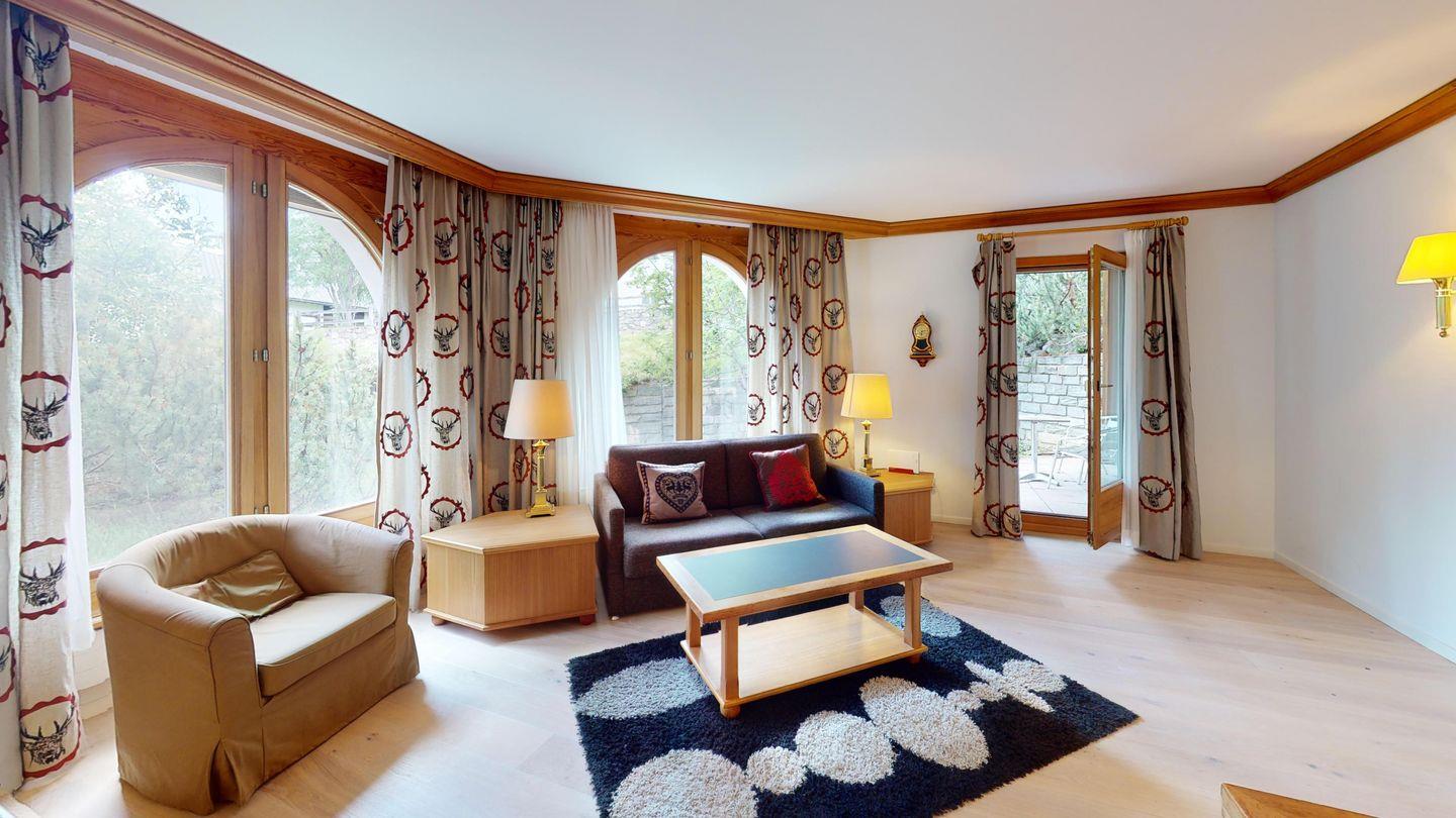 epflegte 2.5-Zimmer-Wohnung in der Residenza Belvair mit direktem Gartenzugang. Umfassend renoviert 2023, mit gemütlichem Wohnbereich, Terrasse, und modernen Annehmlichkeiten. Gemeinschaftlicher Wellnessbereich im Winter. Zentrale Lage in Zuoz.