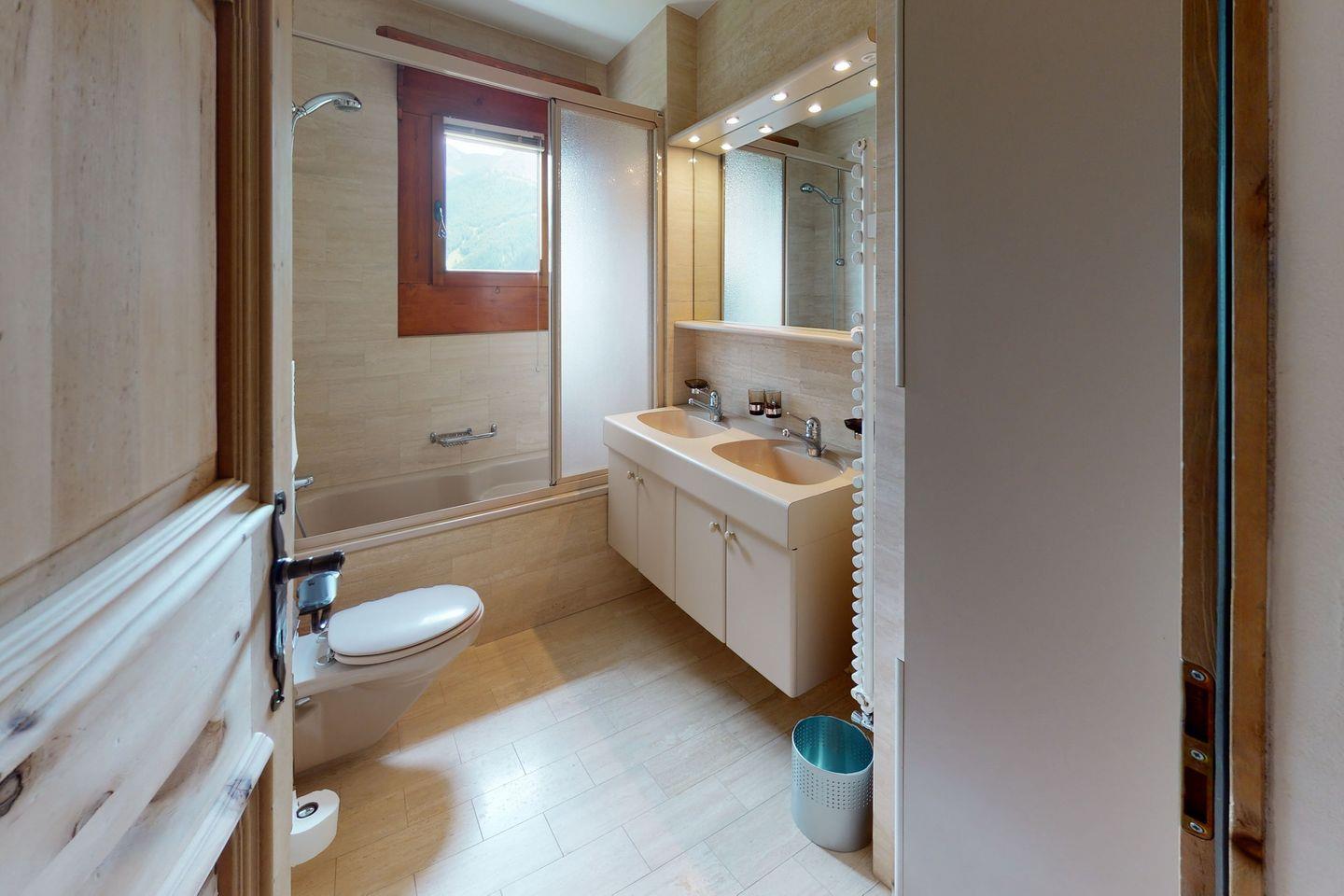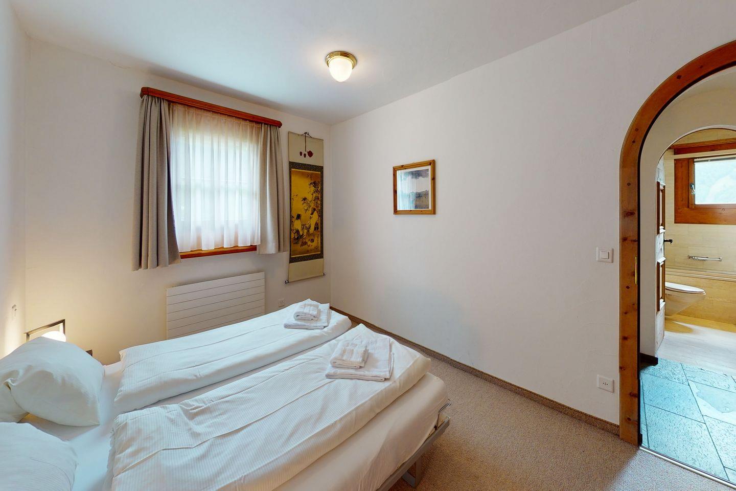 Gemütlich eingerichtetes Wohnzimmer mit Kamin, Sofa und Fernseher sowie einem Esstisch. Neben dem Wohnraum finden Sie eine halboffene und vollständig eingerichtete Küche. Die Wohnung verfügt über 2 separate Schlafzimmer mit je 2 Betten (Daunenduvets) und genügend Platz in stilvollen Wandschränken. Weiter finden Sie ein neu rennoviertes Badezimmer mit Dusche, Lavabo und Wc sowie ein zusätzliches separates WC mit Lavabo. Ein Skiraum im Eingangsbereich des Hauses mit eigenem abschliessbarem Schrank sowie ein Autoabstellplatz in der hauseigenen Tiefgarage runden das Angebot ab.