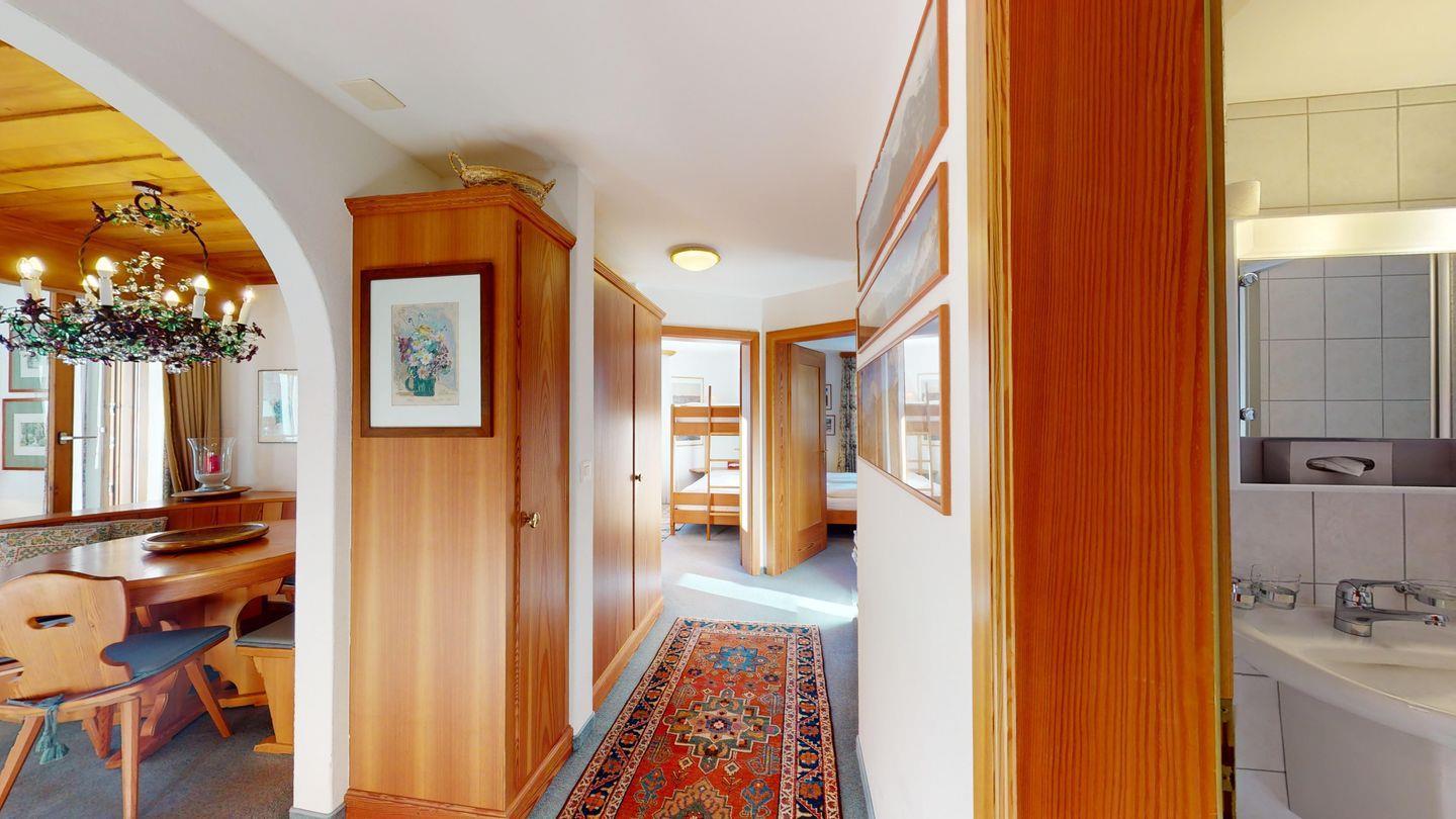 Die Ferienwohnung hat ein geräumiges und gemütliches Wohnzimmer mit einer offenen Küche sowie Essecke. Vom Wohnzimmer gelangt man auf den Balkon, welcher nach Südwesten ausgerichtet ist. Es steht ein Schlafzimmer mit Doppelbett und en-suite Badezimmer (Badewanne) zur Verfügung. Ein weiteres Schlafzimmer verfügt über ein Etagenbett. Ebenso hat es noch ein Badezimmer mit Dusche. Im Eingangsbereich gibt es eine Garderobe sowie Schränke.