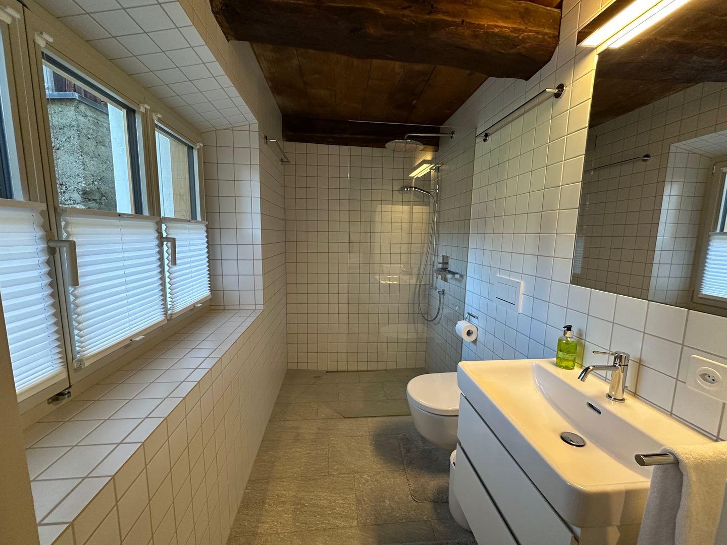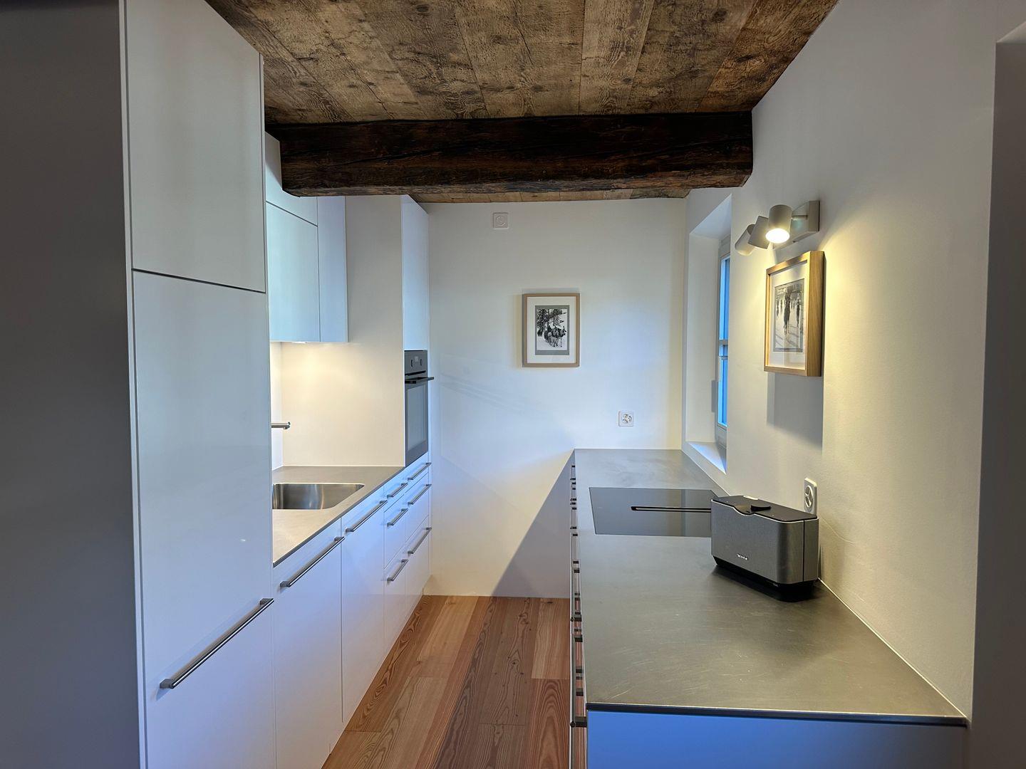 Die moderne, voll ausgestattete Küche mit angrenzendem Essbereich ist mit hochwertigen Geräten und viel Platz zum Kochen und Geniessen versehen. Beachten Sie bitte, dass das Badezimmer nur über das Master-Schlafzimmer zugänglich ist.