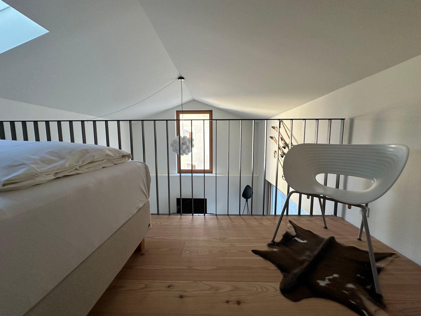 Die Giardin-Wohnung bietet eine romantische Rückzugsmöglichkeit in einem sorgfältig renovierten Engadinerhaus. Der historische Charakter dieses Anwesens, kombiniert mit modernem Wohnkomfort, schafft eine besondere Atmosphäre. Die Wohnung selbst besticht durch ein grosszügiges Wohnzimmer mit offener Küche und mit hohen Decken sowie einer offenen Galerie, auf der sich das komfortable Doppelbett befindet.